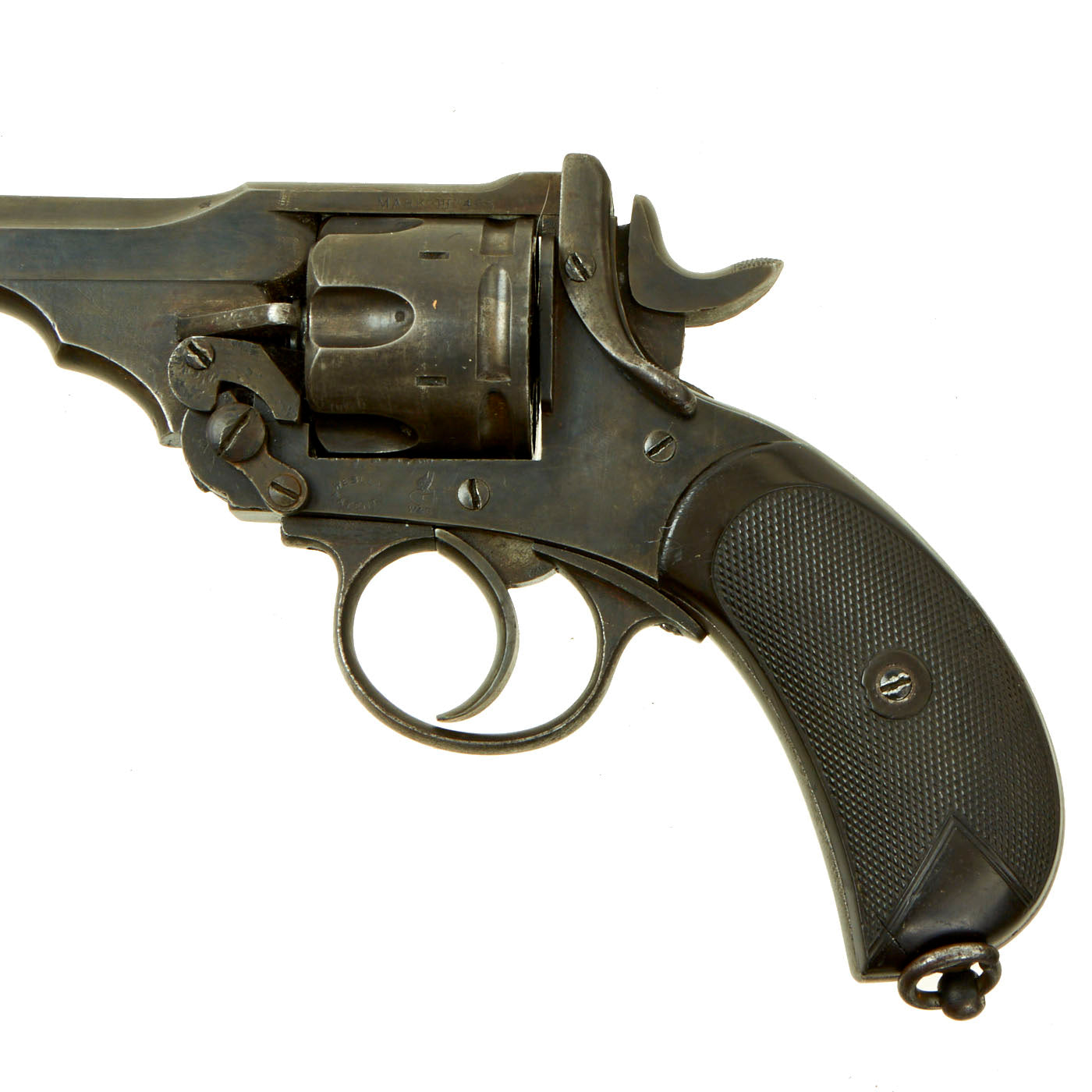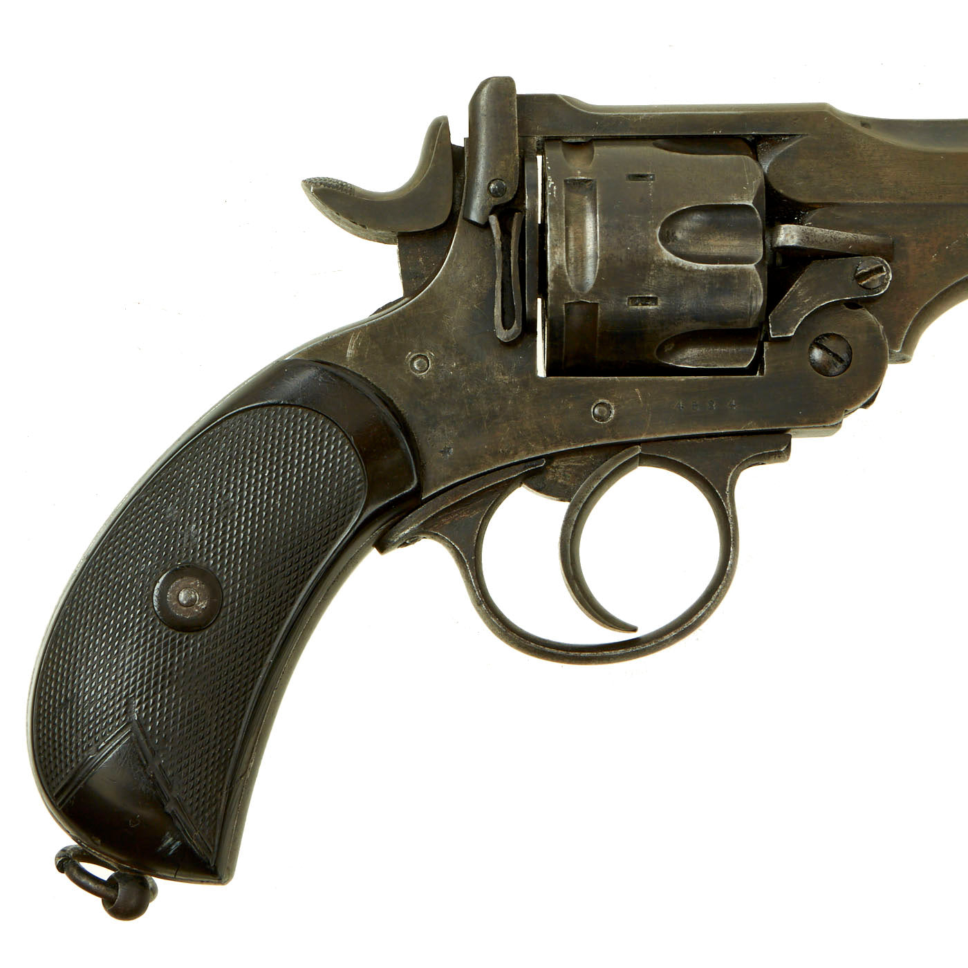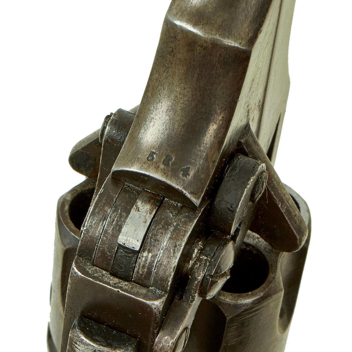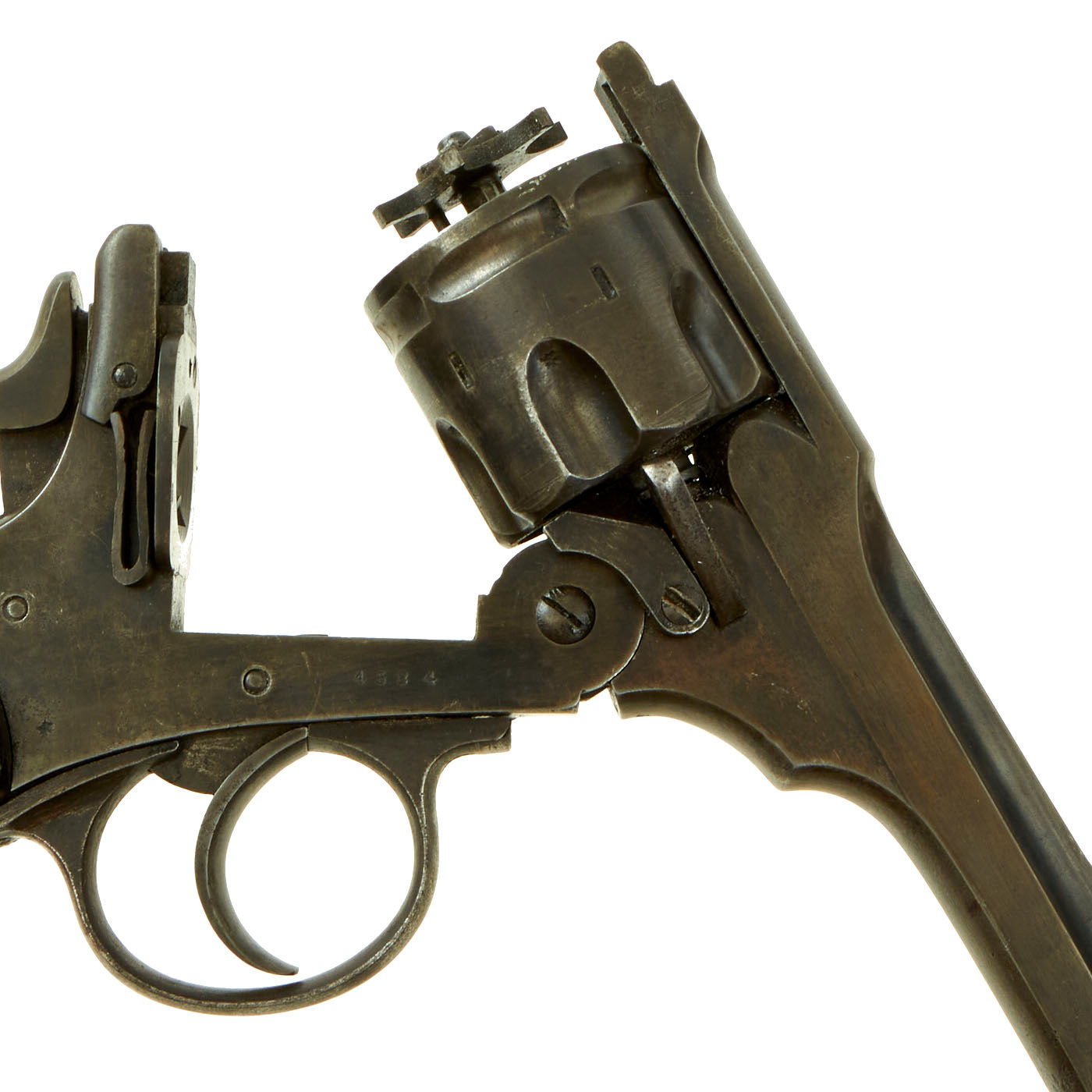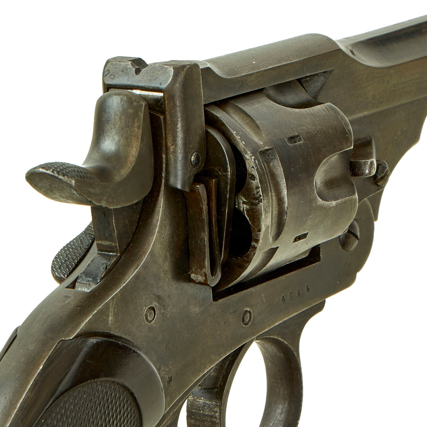 This example is marked with serial number 4584 on the right side of the frame, with shortened number 584 on the rear of the cylinder and barrel. This is a very low number in Mark III production, before there were any military contracts. Webley & Scott did supply revolvers Zuid-Afrikaansche Republiek (ZAR) between December 1895 and February 1898, which ended with Mark III revolvers under serial number 7000. More specifically, per some records these were all between 5154 and 6851, so 4584 was almost certainly produced in 1897. An additional British War Department purchase of serial numbers 8327 to 11121 was logged in February 1899, further securing that 4584 is certainly pre 1899 manufacture and Federally considered an ANTIQUE.