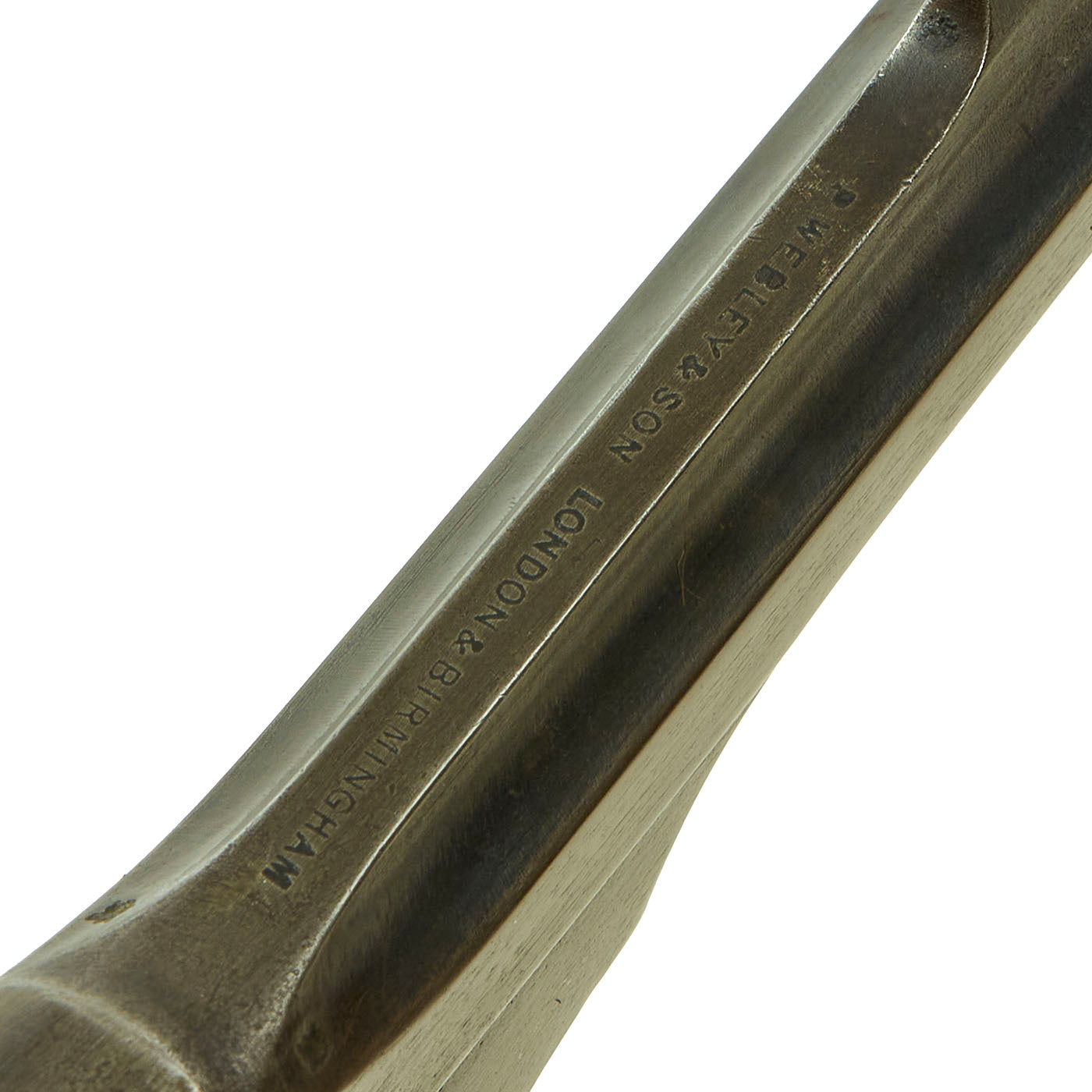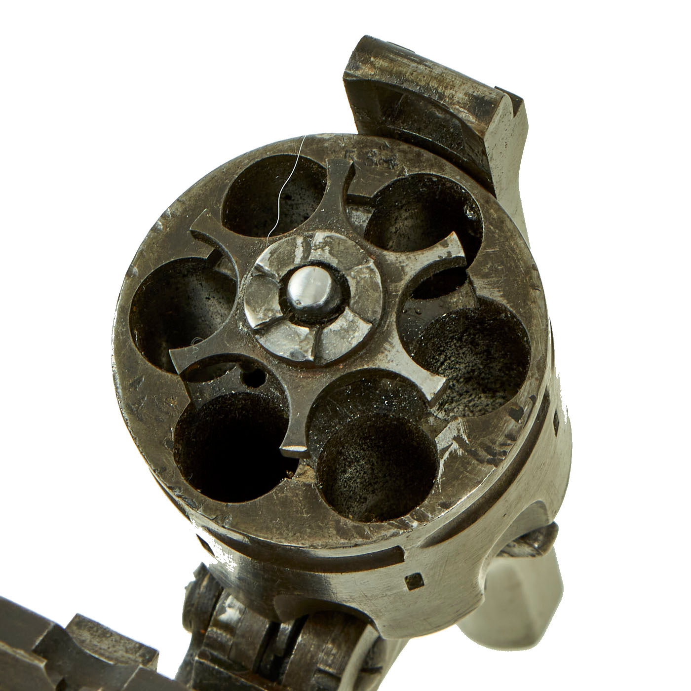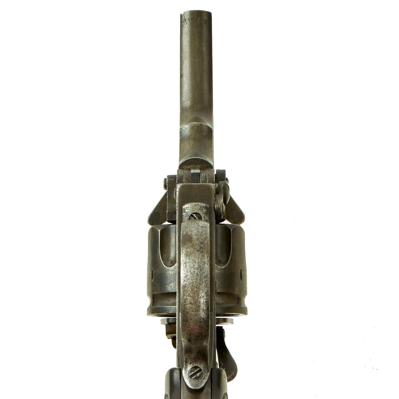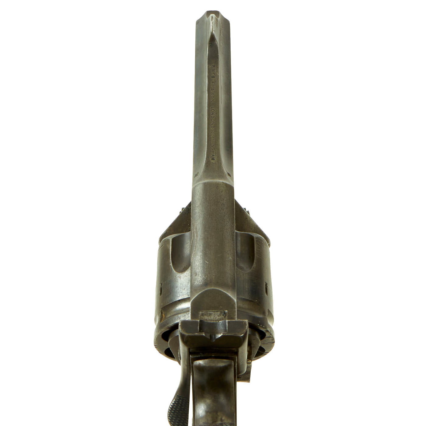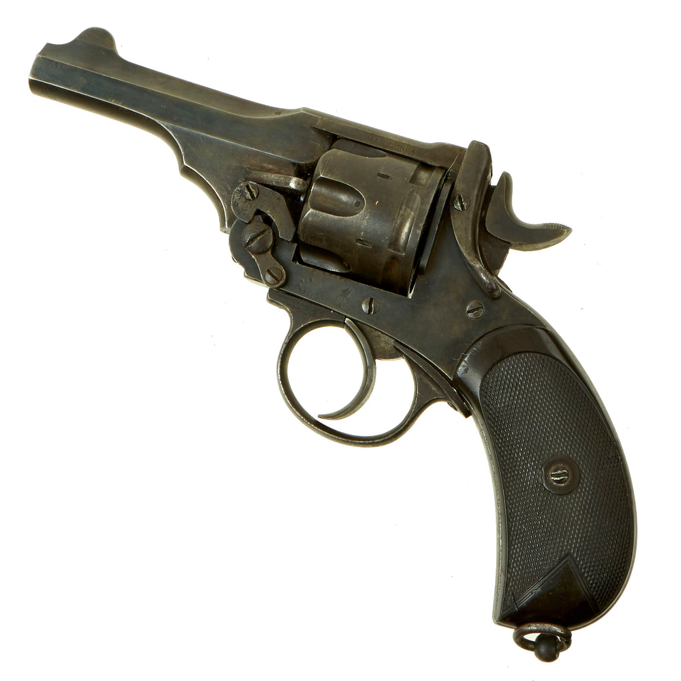 This example is marked with serial number 4584 on the right side of the frame, with shortened number 584 on the rear of the cylinder and barrel. This is a very low number in Mark III production, before there were any military contracts. Webley & Scott did supply revolvers Zuid-Afrikaansche Republiek (ZAR) between December 1895 and February 1898, which ended with Mark III revolvers under serial number 7000. More specifically, per some records these were all between 5154 and 6851, so 4584 was almost certainly produced in 1897. An additional British War Department purchase of serial numbers 8327 to 11121 was logged in February 1899, further securing that 4584 is certainly pre 1899 manufacture and Federally considered an ANTIQUE.