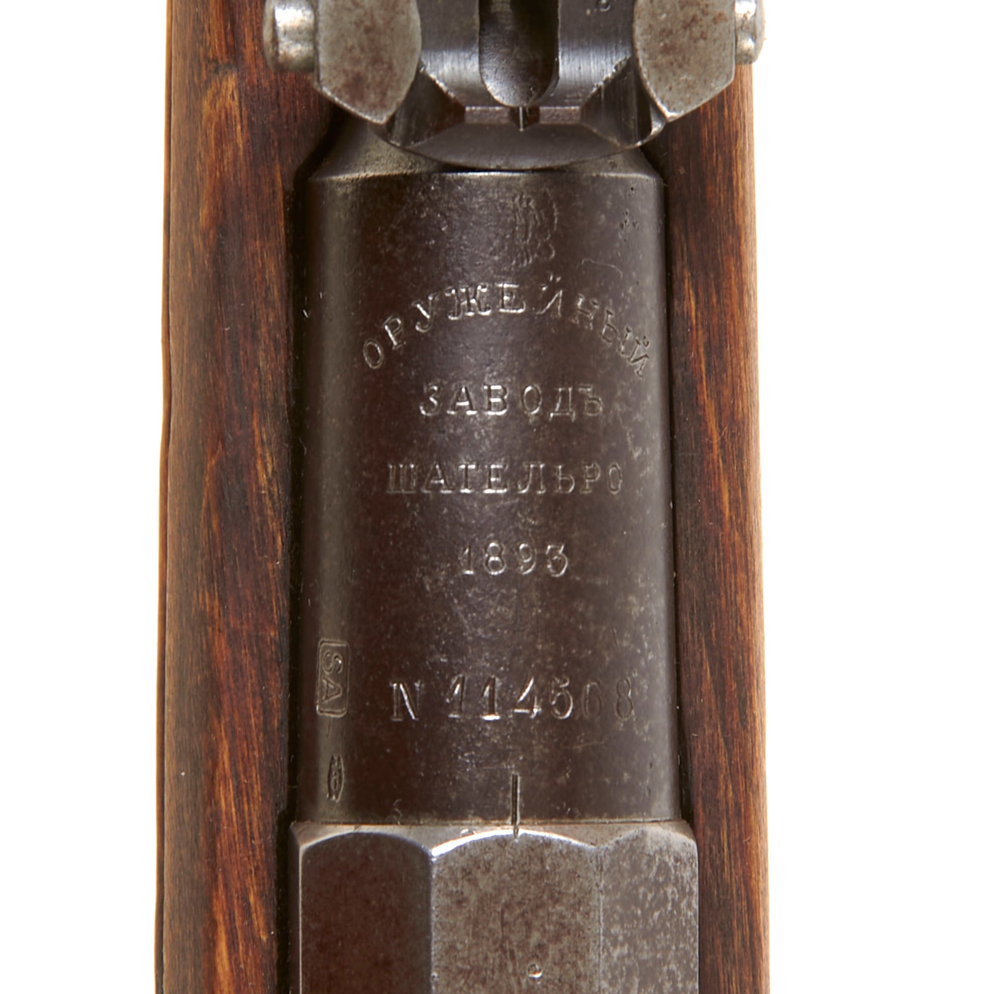 These indicates original manufacture in 1893 at Châtellerault Arsenal in France, only seen on those dated 1892-1895. During the early years the Russian Empire wanted to expedite the launch of their new service weapon, and contracted outside to France, who they had a long association and Alliance with. The right side of the bolt and the front of the magazine are marked with the Hammer proof of Tula Arsenal, while the front barrel band and rear sight leaf bear the "Bow and Arrow" marking of Izhevsk Arsenal, both Czarist markings which were discontinued following the Russian revolution and subsequent civil war. It was very common for rifles in service for a long time to have parts swapped out like this.