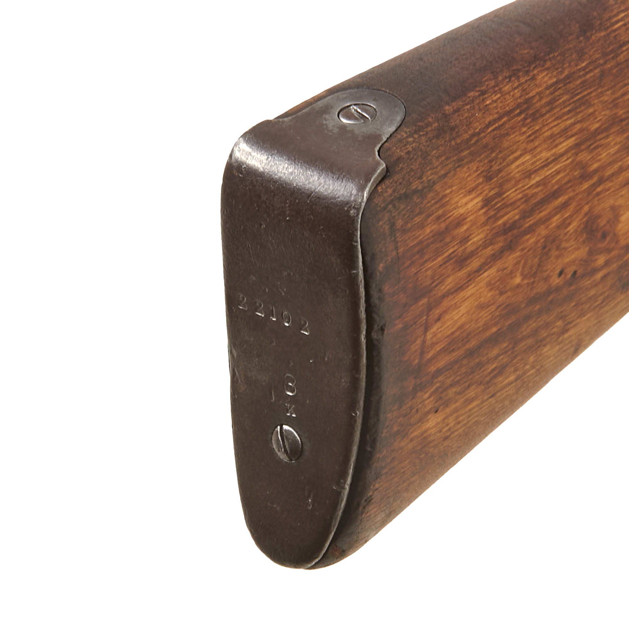 Condition of the rifle is very good, especially considering the age and amount of service it must have seen. The stock is in very good condition, with a lovely light brown color showing the grain well. It shows dents and dings consistent with service, but there are no cracks, repairs, or other major damage. The metalwork overall shows an aged mottled patina with some signs of past peppering. Some areas are worn nearly to bright steel, and there is no evidence of refinishing. It still retains the original cleaning rod, which is in good shape, and still threads correctly into the stock retaining block.