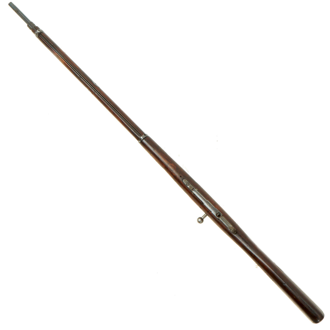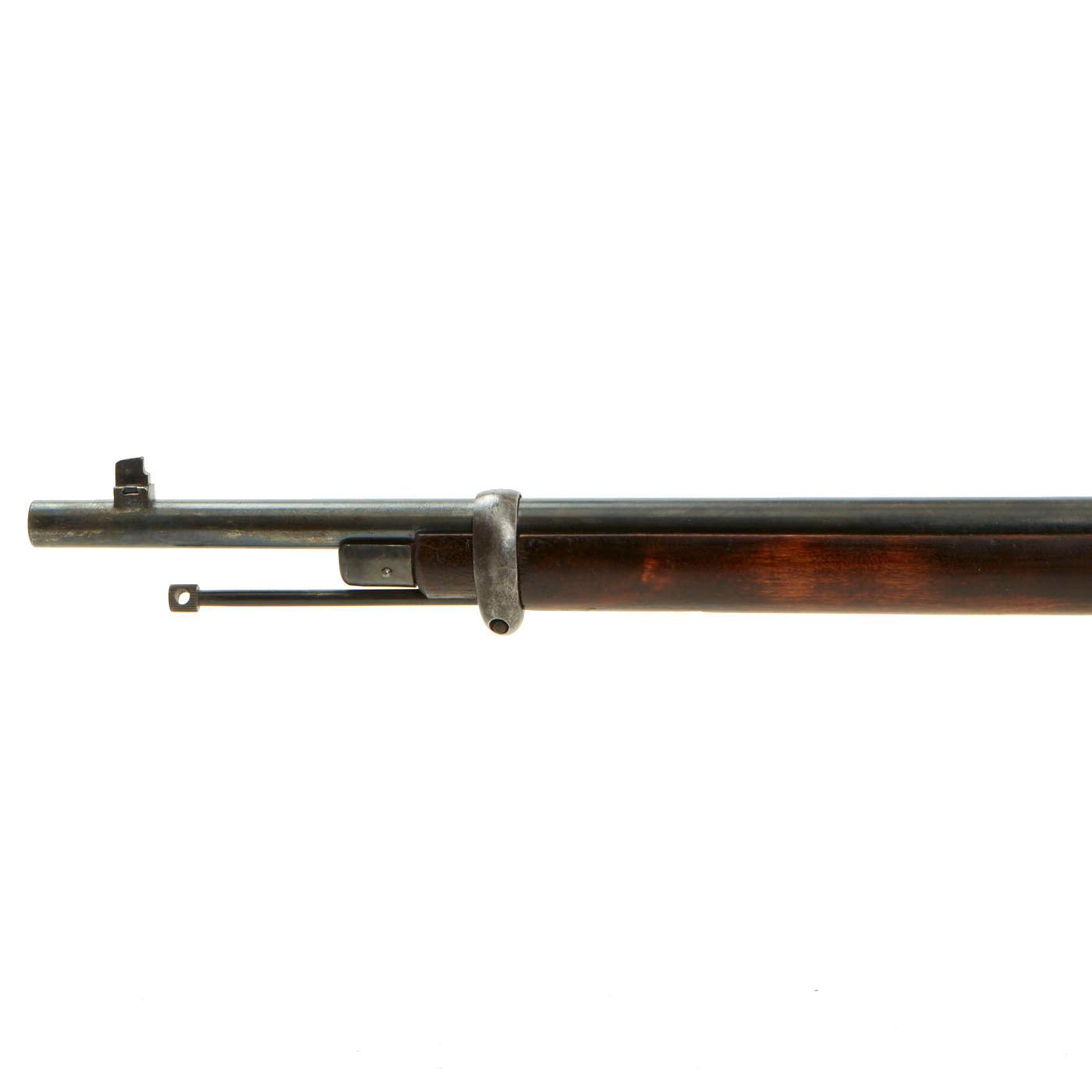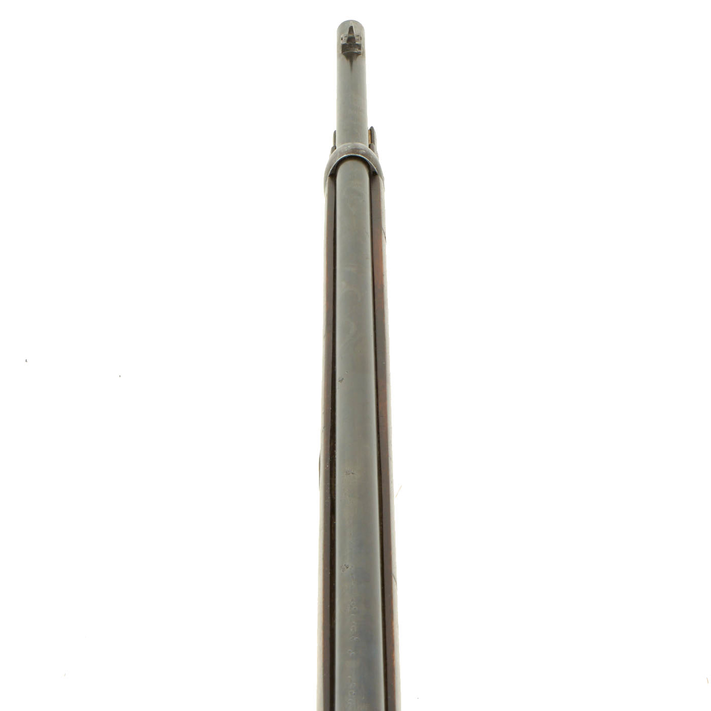 Condition of the rifle is very good, especially considering the age and amount of service it must have seen. The stock is in good condition, though it does look to have been arsenal refinished at least once, and now has a lovely brown color. The metalwork is in good shape, mostly a worn blued finish with a bright steel bolt. There is some past pitting, now removed, which has made some markings faint. It still retains the original cleaning rod, which is in great shape, and still threads correctly into the stock retaining block.