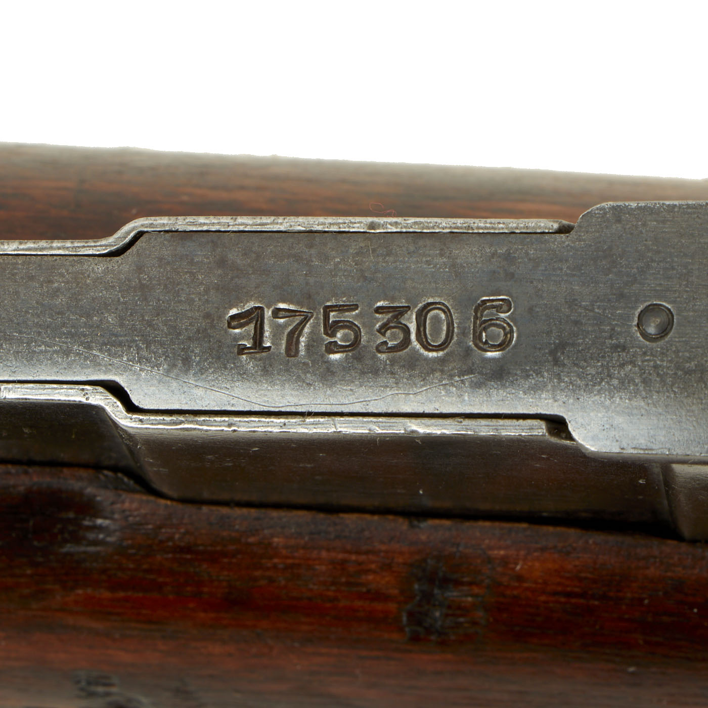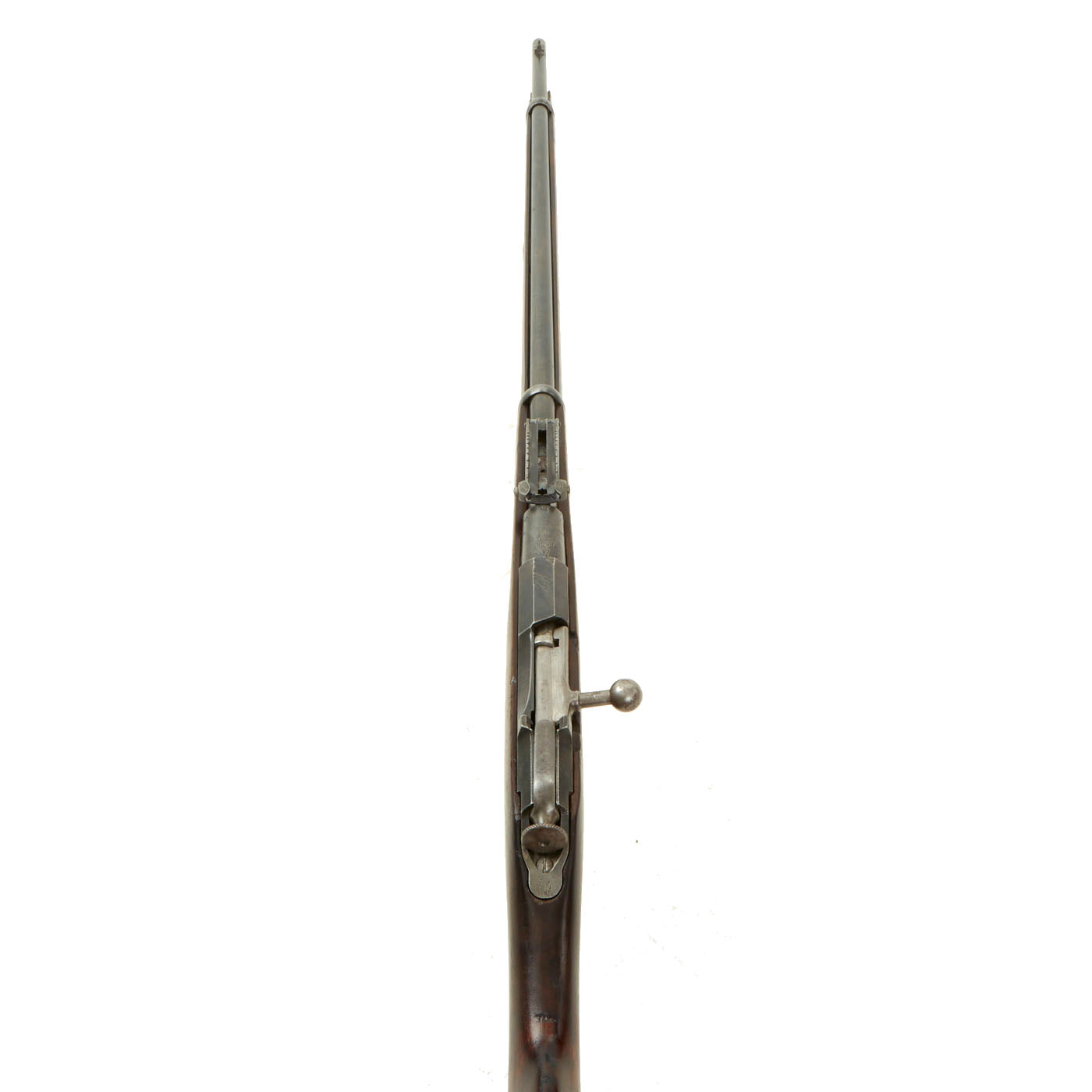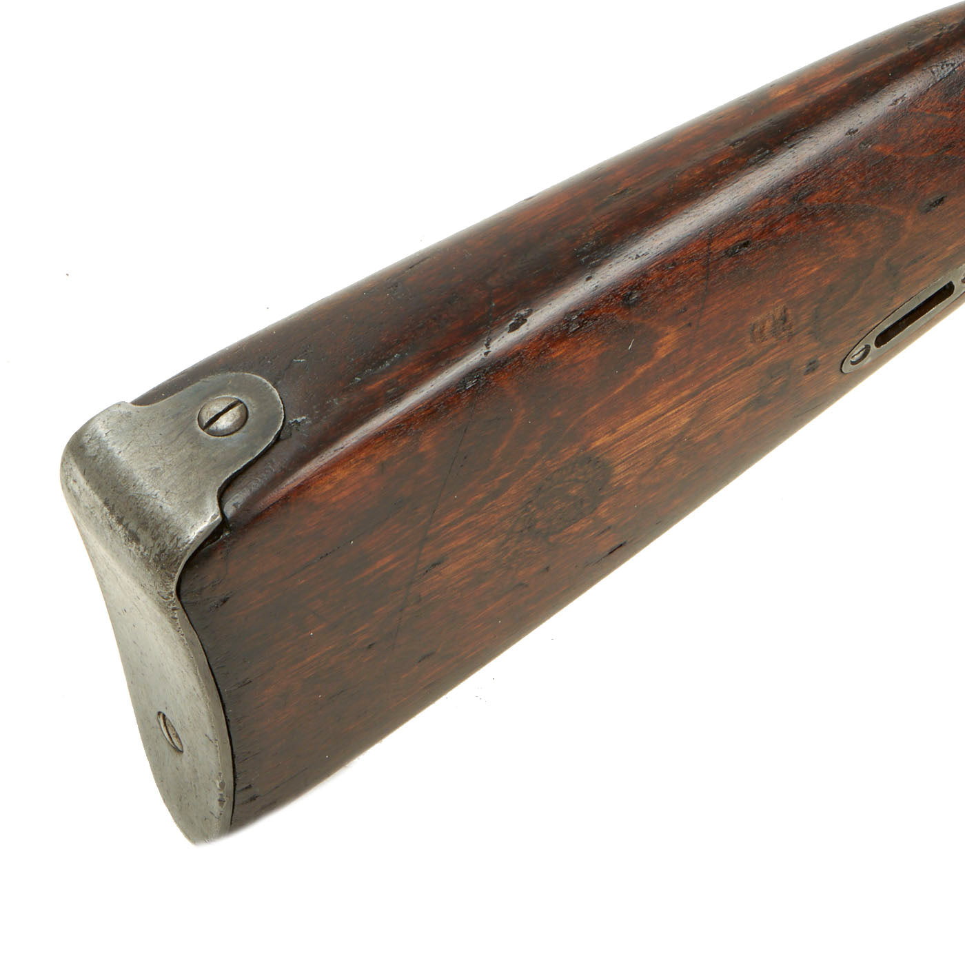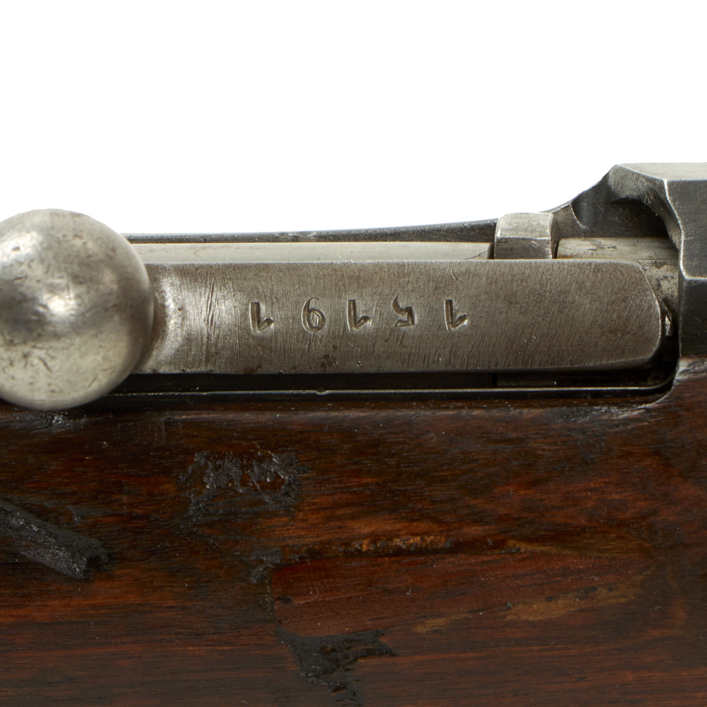 Condition of the rifle is very good, especially considering the age and amount of service it must have seen. The stock is in good condition, though it does look to have been arsenal refinished at least once, and now has a lovely brown color. The metalwork is in good shape, mostly a worn blued finish with a bright steel bolt. There is some past pitting, now removed, which has made some markings faint. It still retains the original cleaning rod, which is in great shape, and still threads correctly into the stock retaining block.