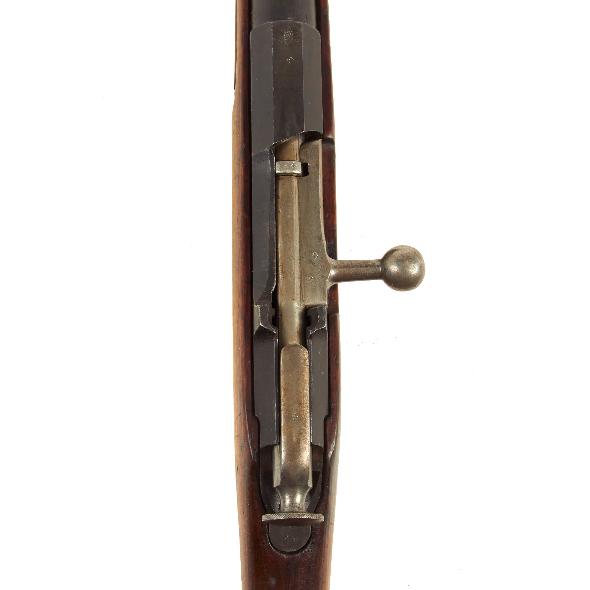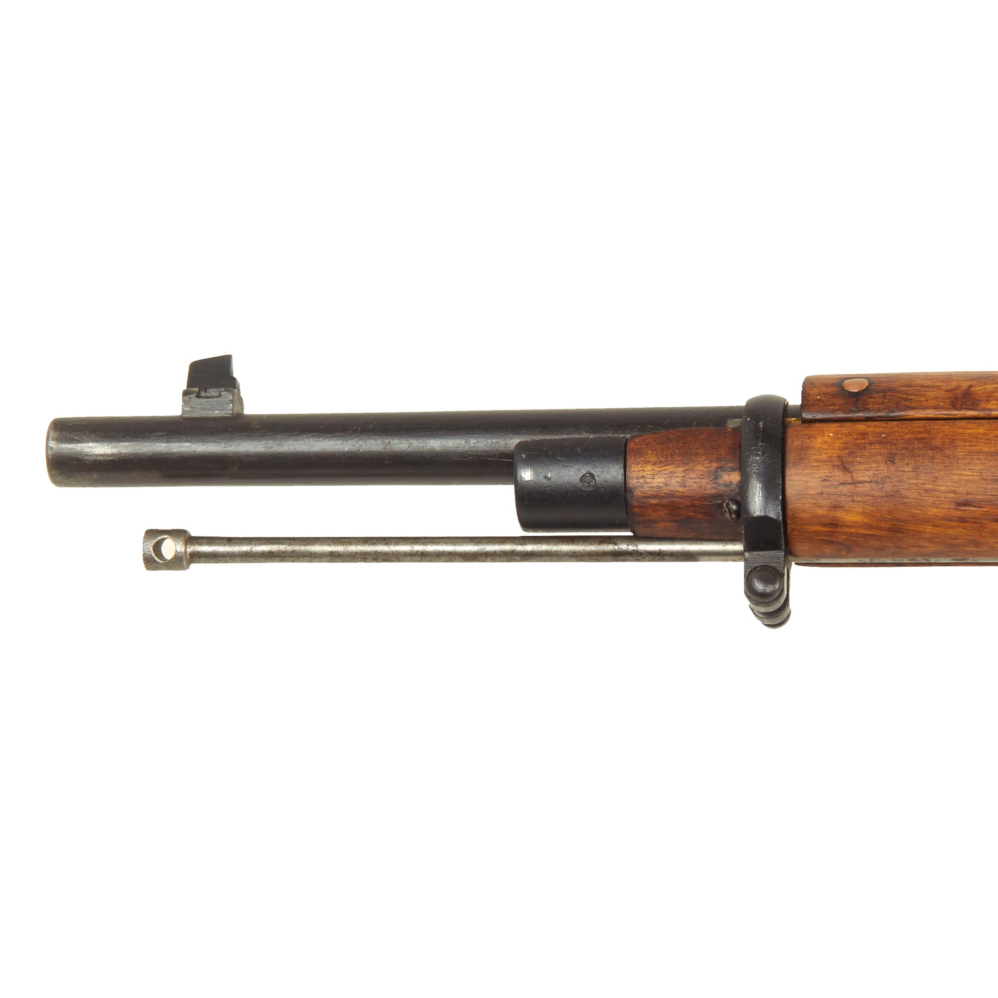 Condition of the rifle is very good, especially considering the age and amount of service it must have seen. The stock is in good condition, with a lovely dark brown color showing the grain well. There are some gouges and dents, but no major damage such as cracks and also no repairs we can see. The metalwork is in very good shape, with strong bluing overall, most likely having been refinished at arsenal during its service life. It still retains the original cleaning rod, which is in great shape, and still threads correctly into the stock retaining block.