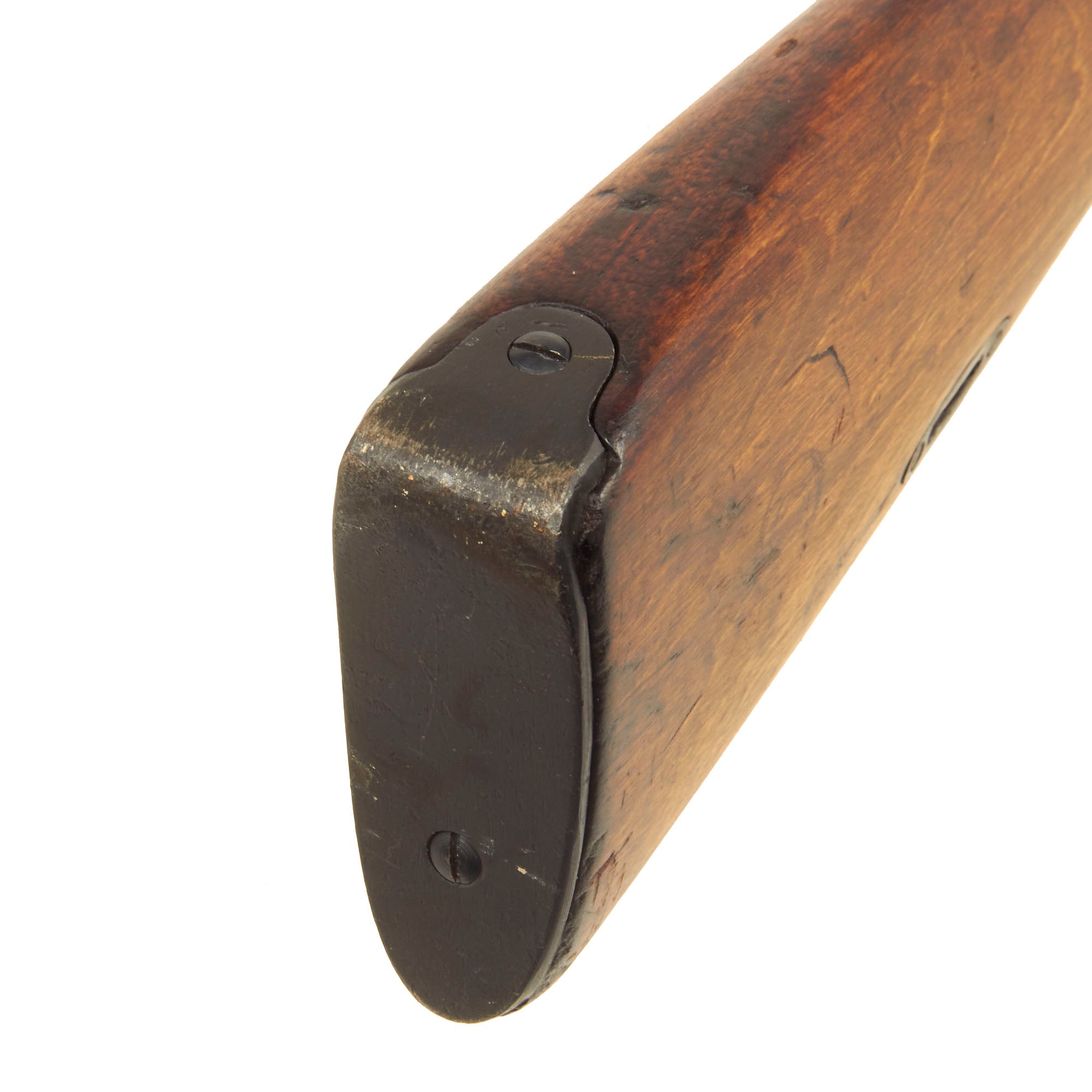 As with most, this example has the cross bolt to reinforce the stock against recoil, and the rear sight correctly goes up to 3200 арши́ны (arshíny), an archaic measurement used by Russia through the first world war. Roughly equal to 71.12 cm, the ranges on the left side of the sight base (4 to 12) have been crossed out, and new measurements in meters (2 to 8 1/2) added in hundreds of meters (12 x 100 arshíny = 8 1/2 x 100m) on the right side. The M/91 was the most widely issued Finnish rifle in both the Winter War and the Continuation War.