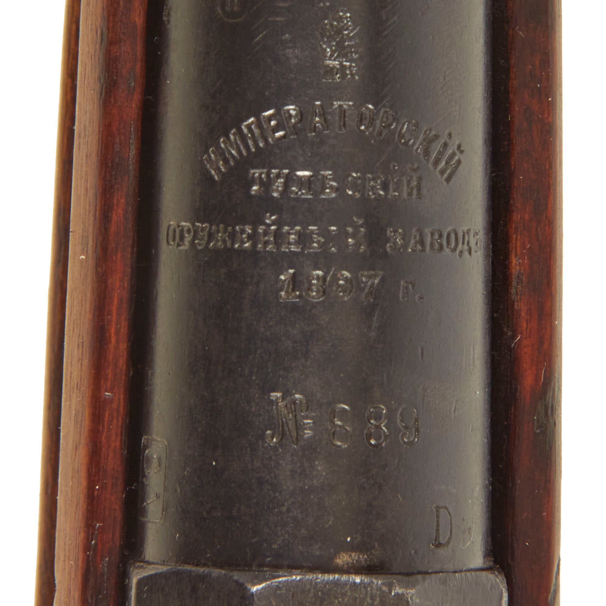 The barrel displays an Imperial Russian Double Headed Eagle over Cyrillic letters Л К just below the rear sight on the base of the barrel, which are also marked on the top of the receiver.