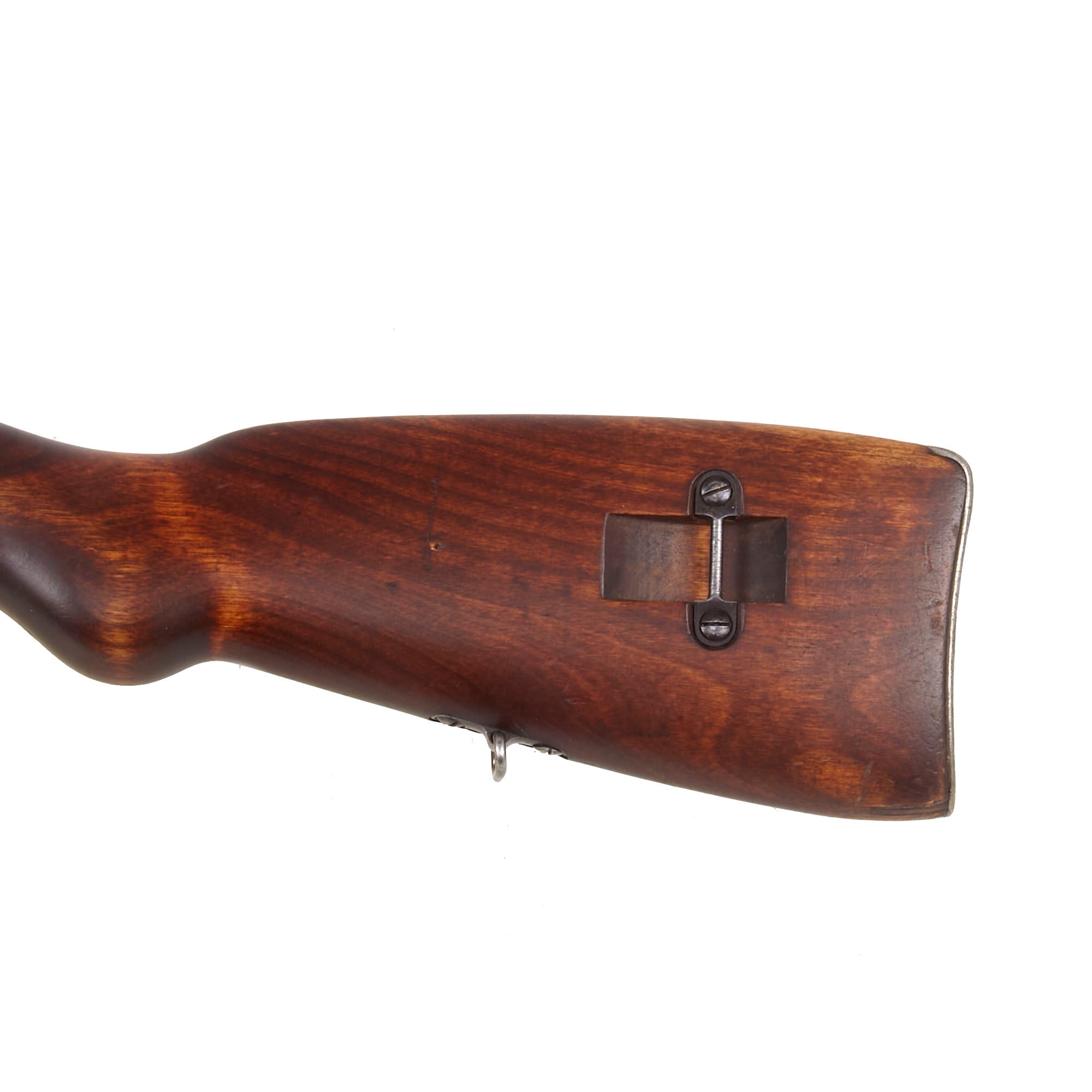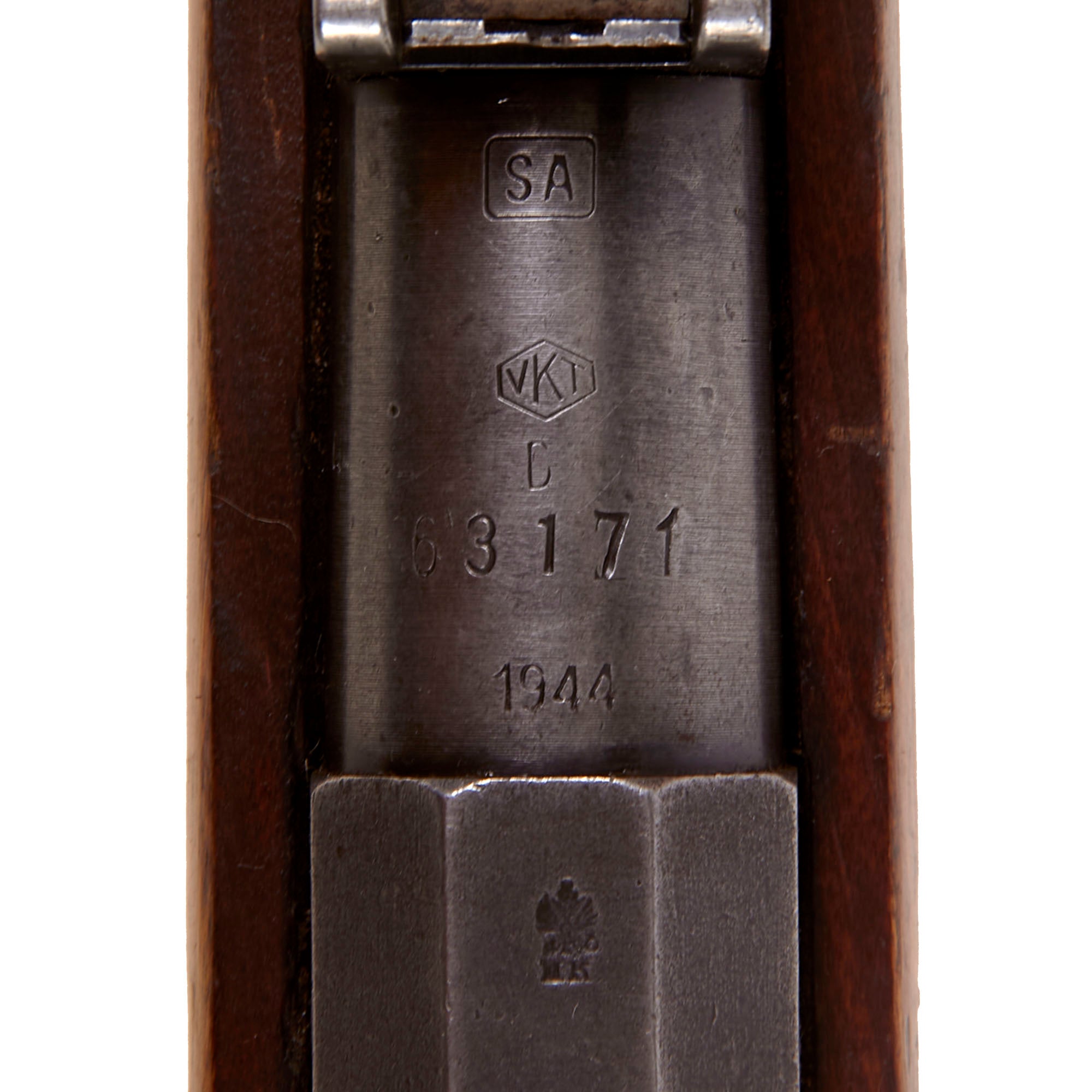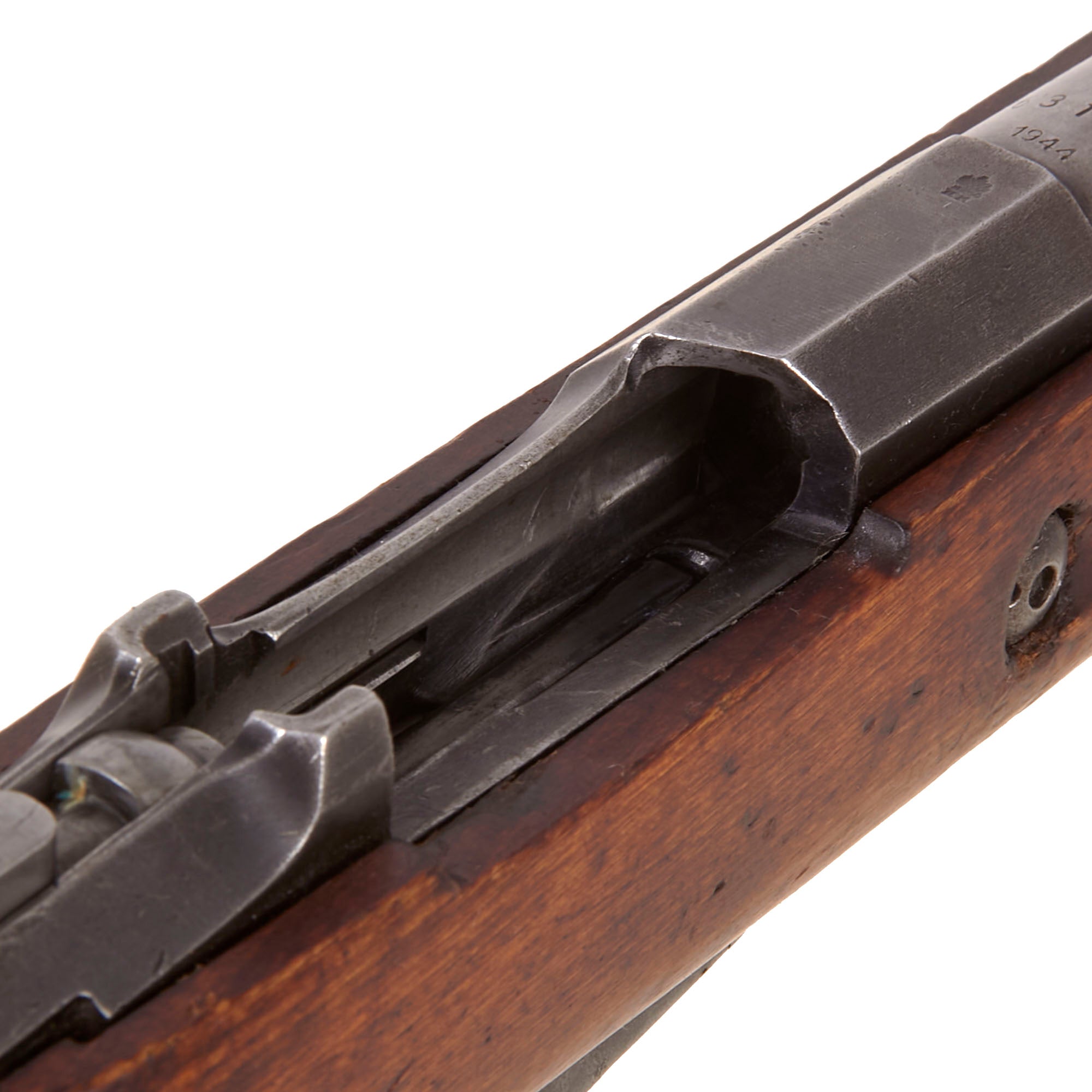 The firing pin holder on the bolt, butt plate, and magazine housing are all marked with the Hammer proof of Tula Arsenal, a Czarist marking which was discontinued following the Russian revolution and subsequent civil war. The Right side of the bolt however is marked with the "Bow and Arrow" marking of Izhevsk Arsenal, another Imperial Russian marking. The receiver is still marked with the Imperial Russian Double Headed Eagle over Cyrillic letters Л К, which would often be defaced if in Soviet service. We were not able to find any parts with Soviet era markings, so this was not made using any Winter War captured parts.