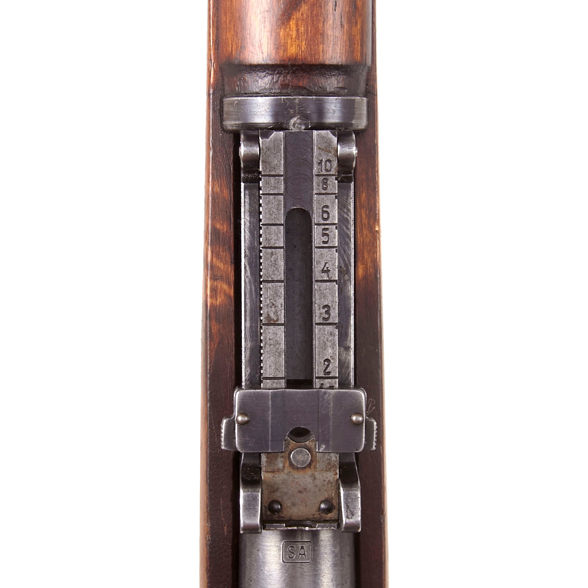 The barrel is the correct shorter 27 inch version, which is thicker than the original Russian specification for greater accuracy. It is fitted with a Finnish M/39 sight, with ranges in the standard hundreds of meters, and the fore sight is a blade with a "winged" sight protector. The stock on the rifle is the correct Finnish two part design, with a finger joint under the rear sight area, and has the cross bolt to reinforce against recoil. It is the M/39 pattern, with a "pistol grip" area, as well as sling swivels on both the bottom and left side of the stock, which allowed for multiple different sling configurations and types of slings to be used, part of the compromise between the Army and White Guard.