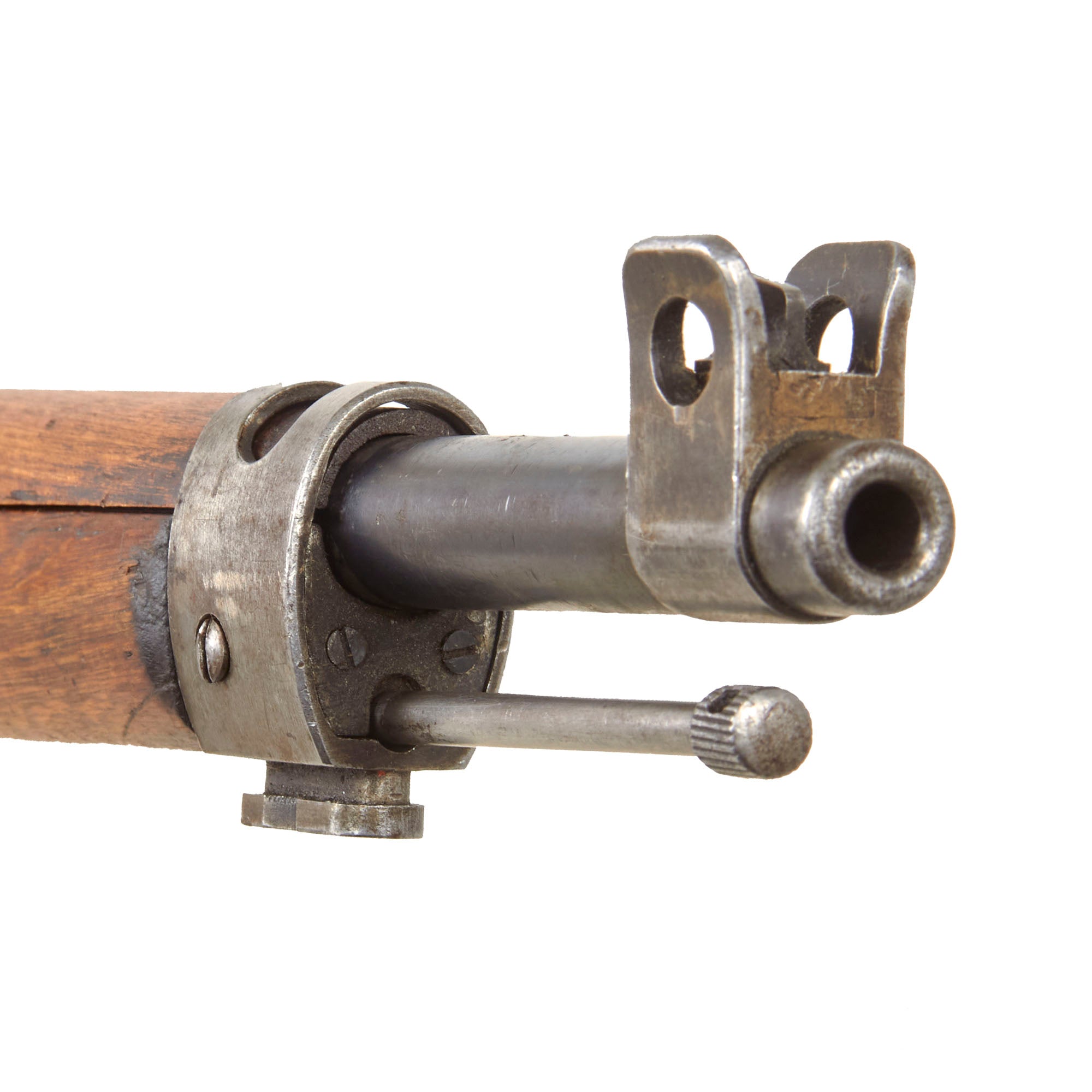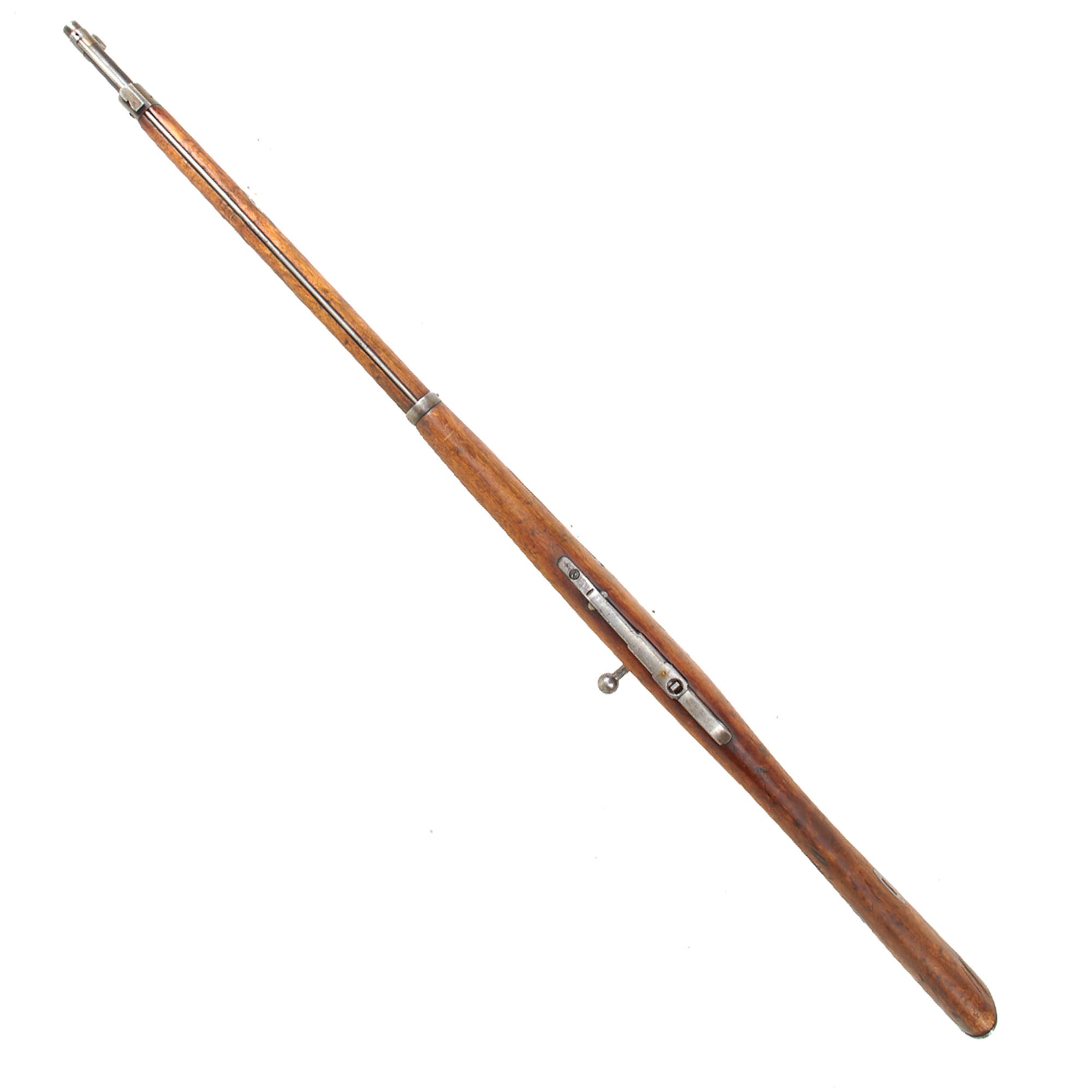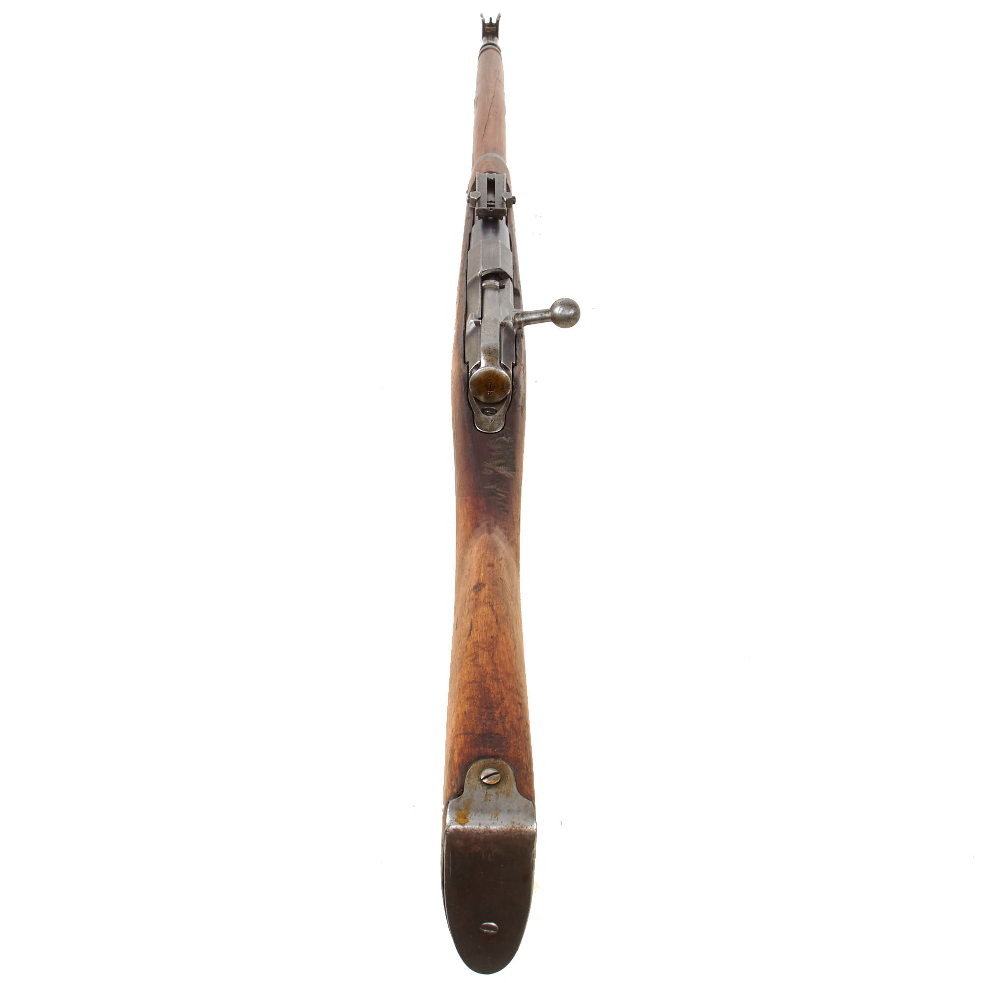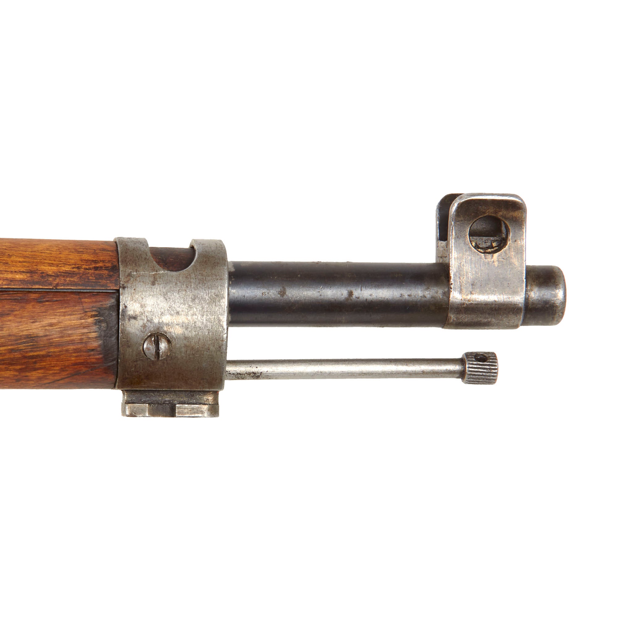 Condition of the rifle is very good, especially considering the age and amount of service it must have seen. The stock is in very good condition, showing dents, gouges, and other damage consistent with having seen long service for possibly over 100 years. The metalwork is still in very good shape, with a worn patina on the original Russian components, while the new Swiss barrel is in excellent condition, still showing the original bluing strongly. It still retains the original cleaning rod, which is in good shape, easily removable from the stock. The rifle cycles well, with a crisp dry fire, though we have no way to see if it still feeds. The bolt can easily be removed for a field stripping, and also still has a functional "safety" position on the firing pin holder. We checked the bore, and it is in excellent condition, looking to not have seen much use at all since the barrel was replaced. There is just a bit of wear keeping it from being MINT!