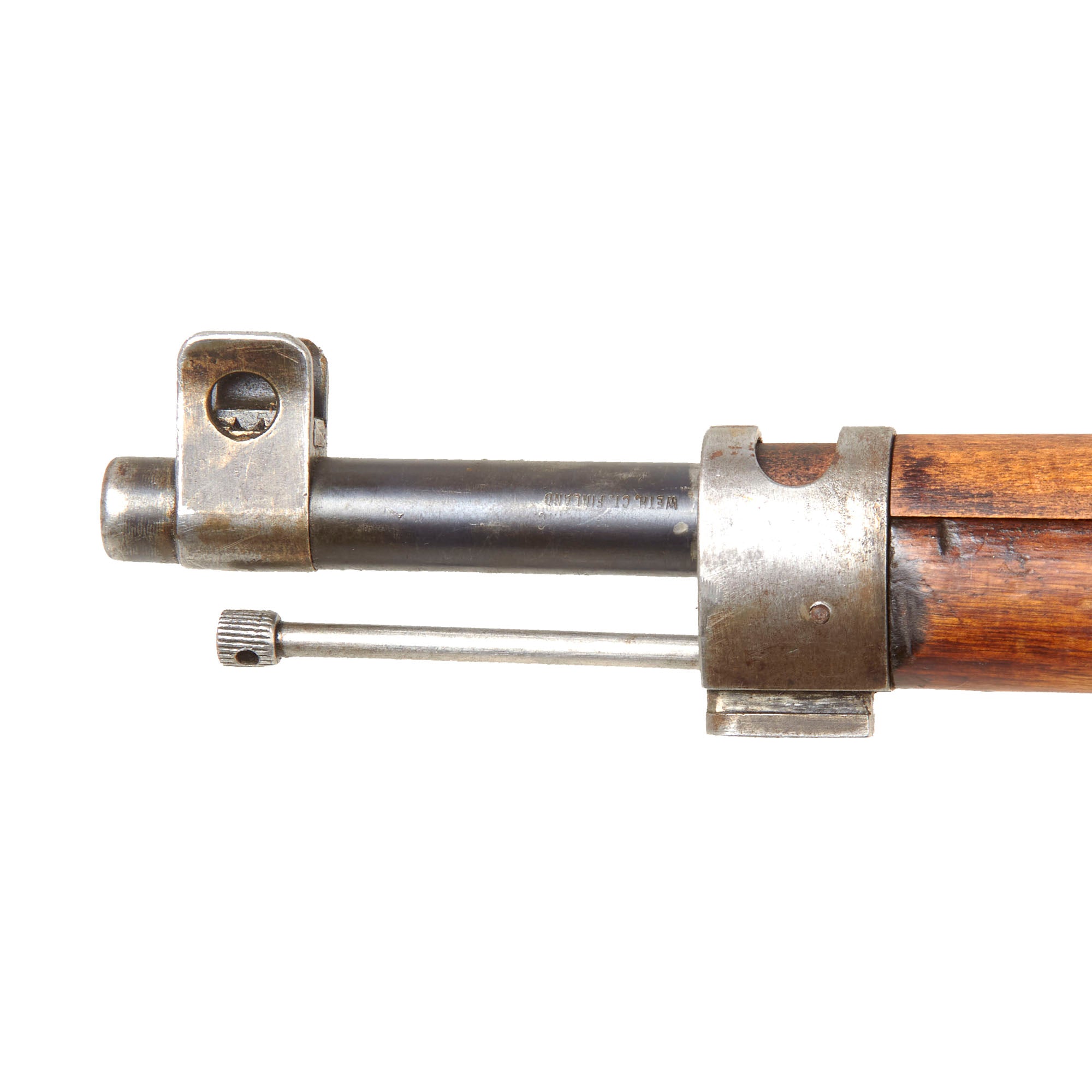 The top of the barrel is marked with the correct SY marking, indicating use by the Finnish Suojeluskunta (Civil Guard), also known as the "White Guard". This indicates use during the "Winter War" or "Continuation War" during the WWII Era. Of note is that there are not any SA inside a rectangle markings, for Suomi Armeija (Finnish Army). These are seen on many of these rifles, as the Civil Guard was disbanded at the end of the "Continuation War" as required by the Soviet Union. All Civil Guard arms were then turned over to the regular army, and marked as such, however it looks like this one may have never been remarked. There is also a partial import marking from Marathon Arms of Weth Ct. on the barrel near the muzzle, as these were imported in bulk and marked, regardless of antique status.