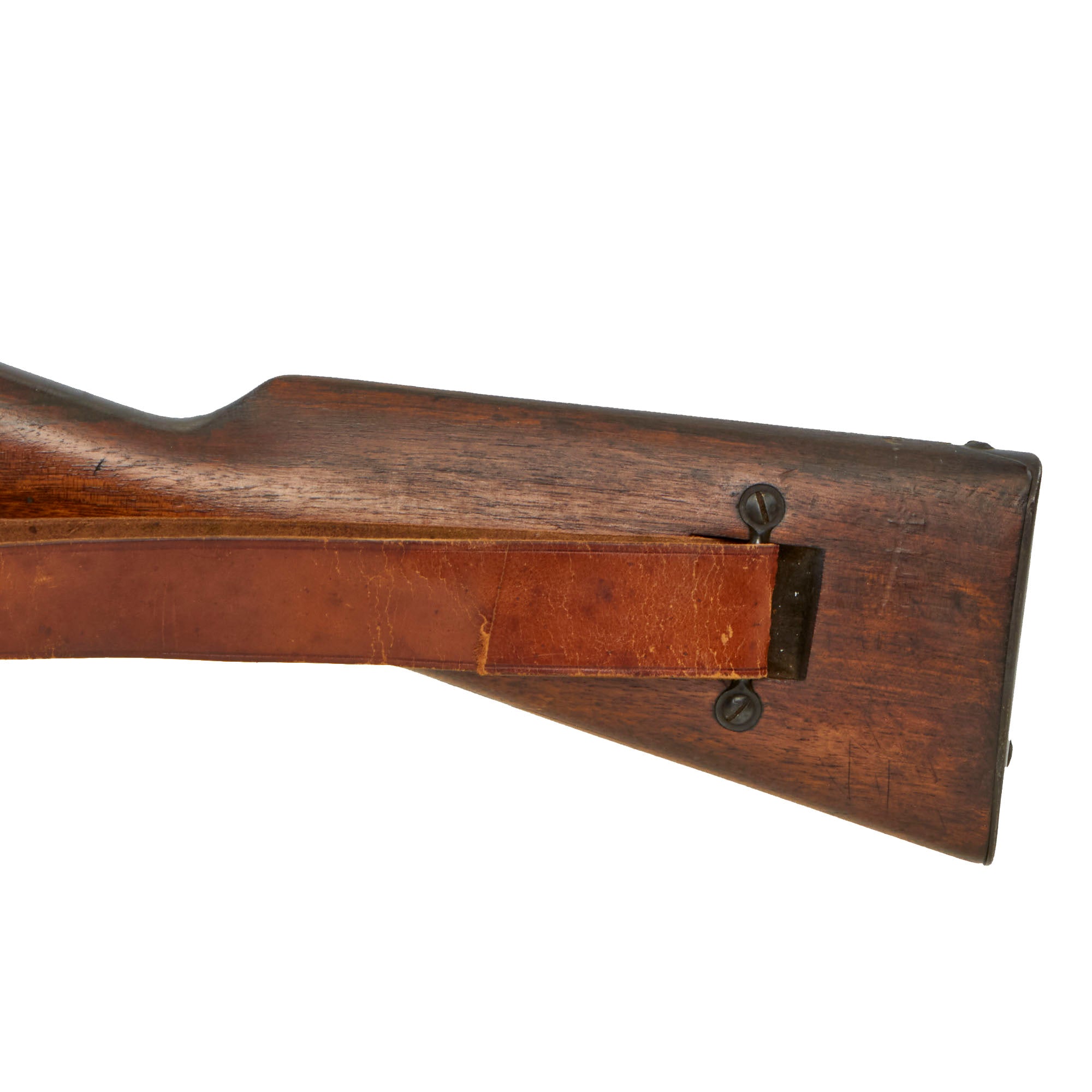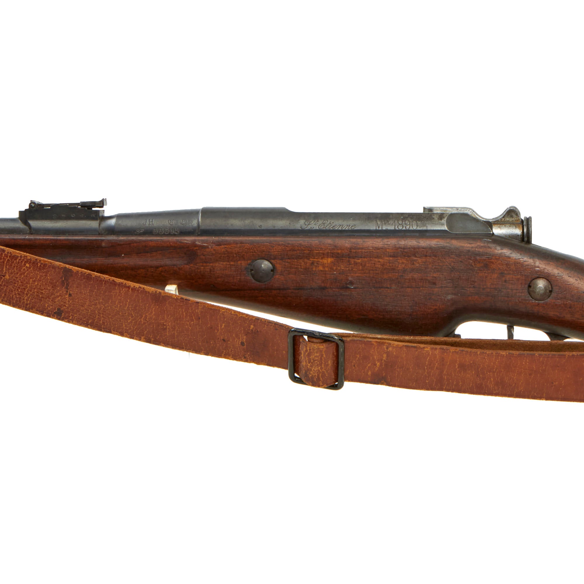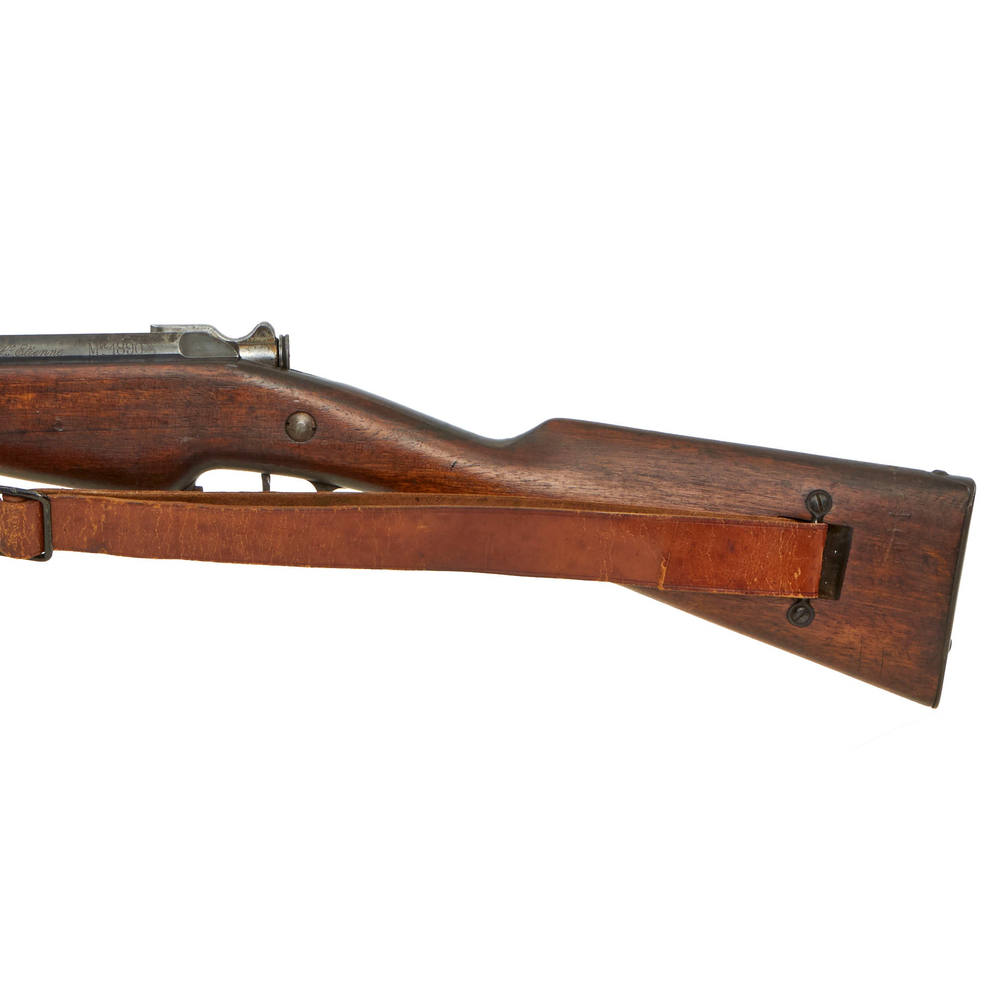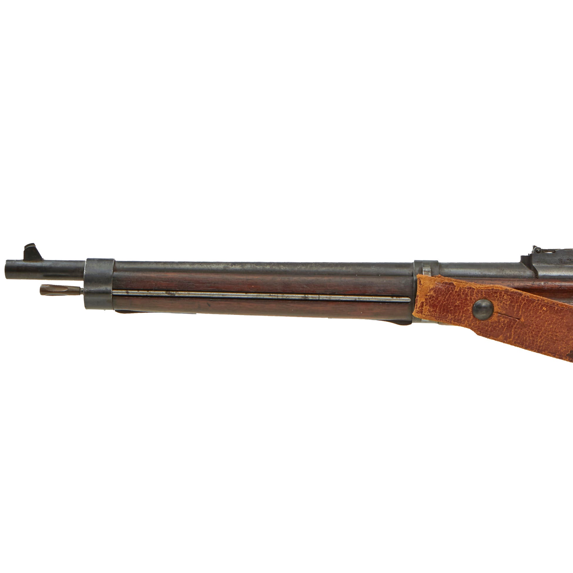 The carbine is fitted with the correct original sling loop on the left side of the barrel band, and the sling inlet on the left side of the butt stock. It also still has the original cleaning rod slot, and still has the original cleaning rod! Many of these were later upgraded to the Mle 1892 standard, or had the cleaning rod lost, so it is very rare to see a Mle 1890 still in the original configuration. It even still has a great original leather sling installed, which has arsenal stamped on the reverse. It does show age, and has a few edge tears as well.