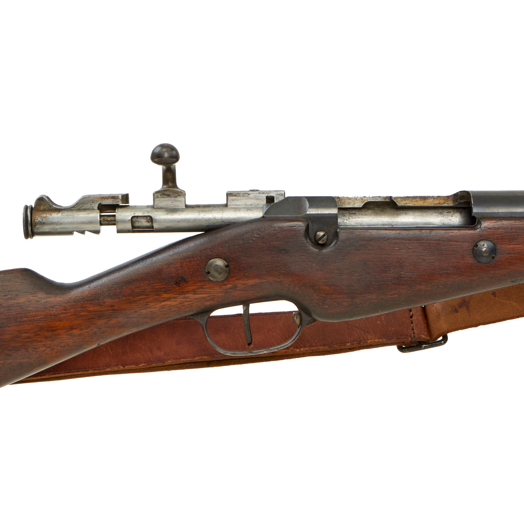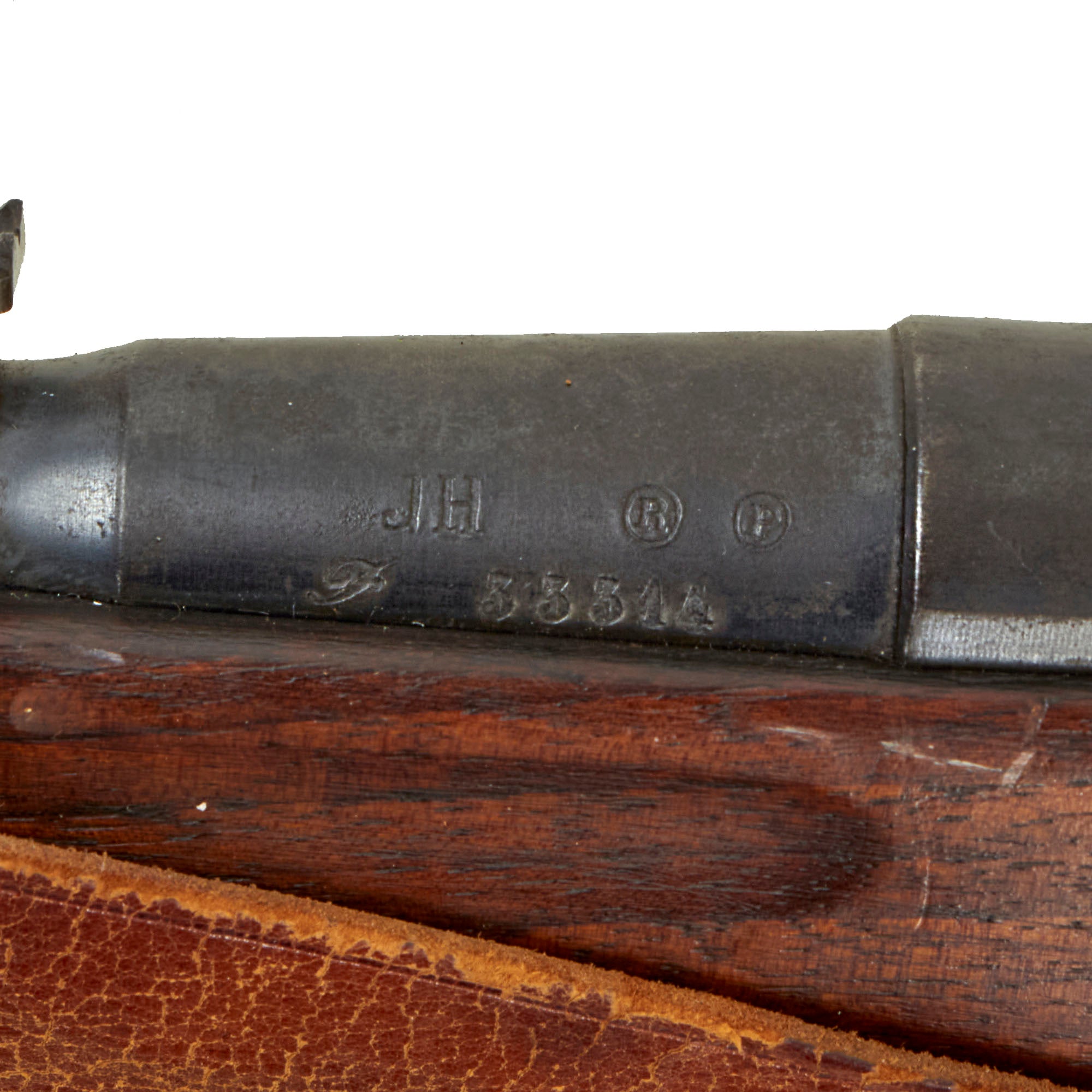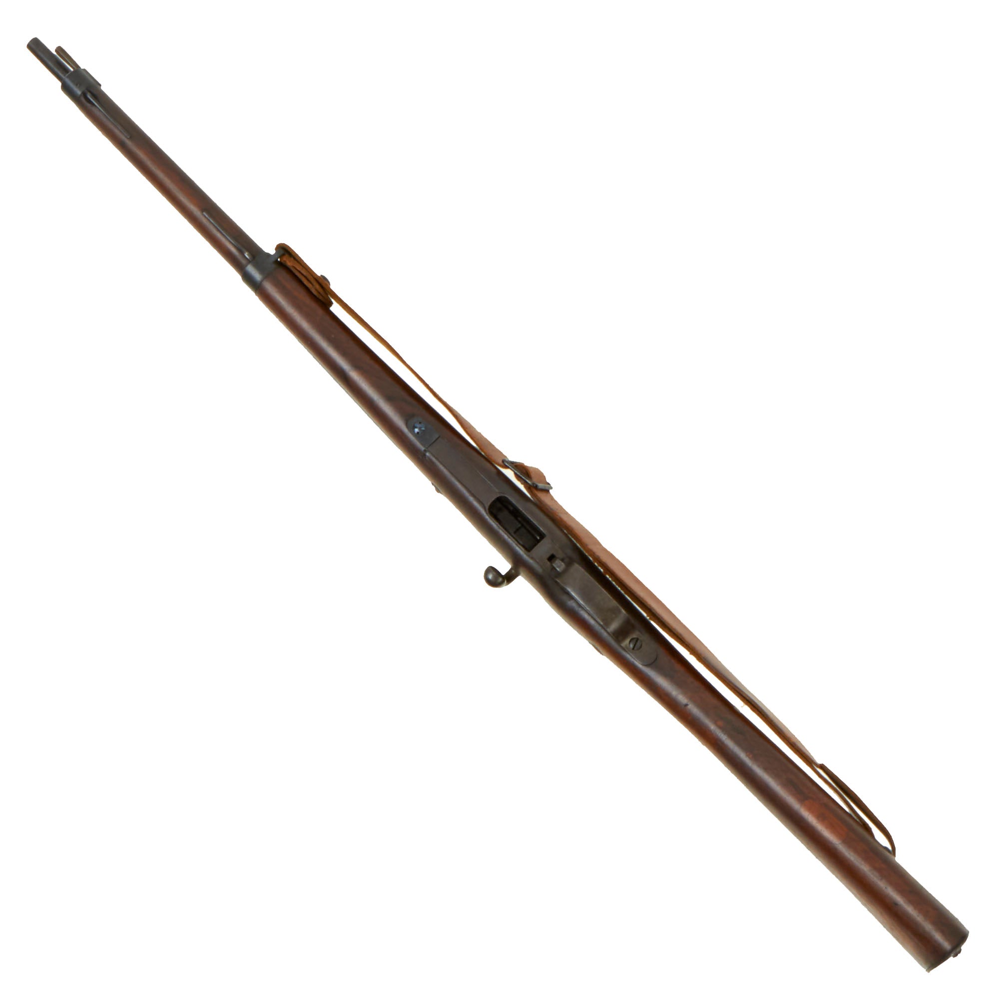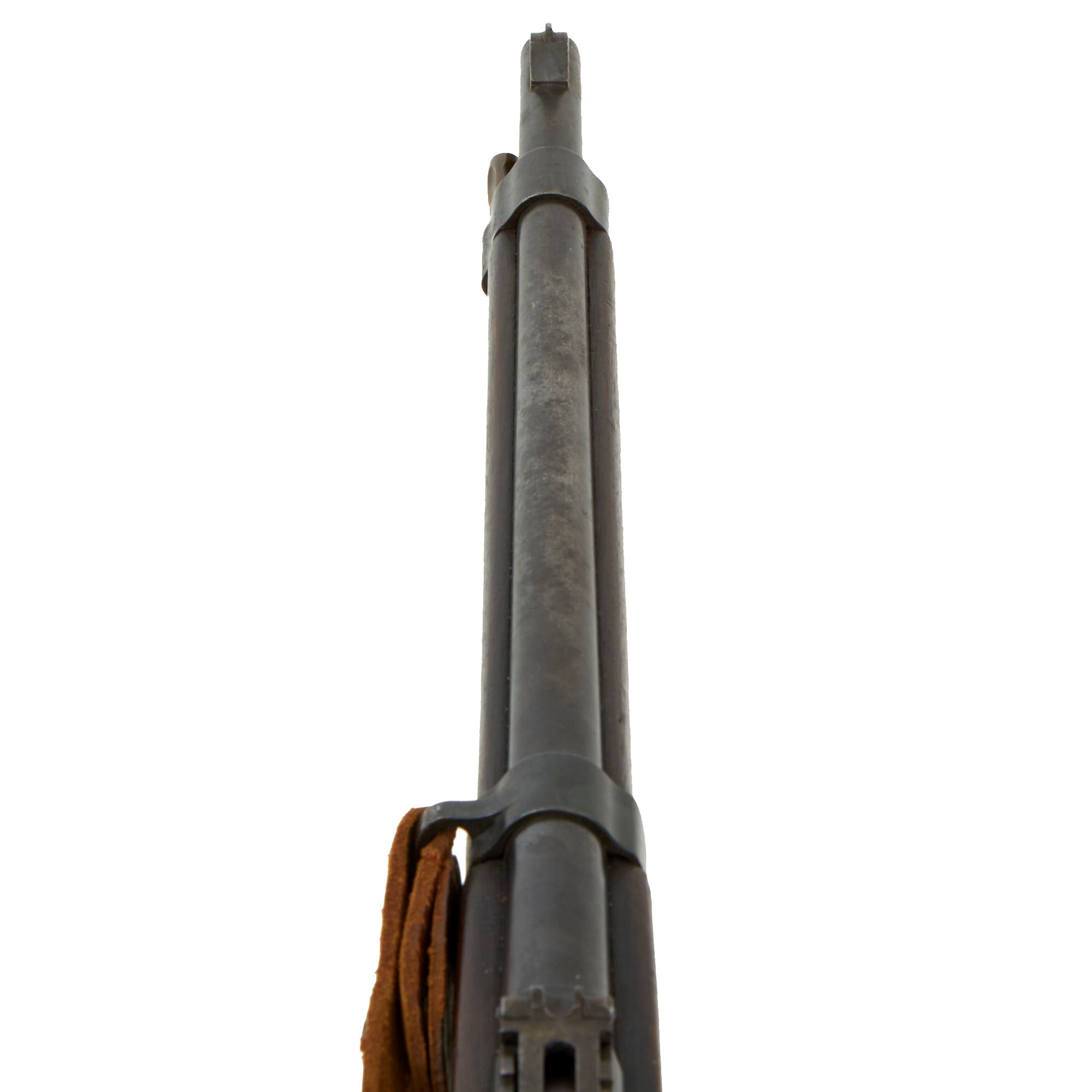The carbine is fitted with the correct original sling loop on the left side of the barrel band, and the sling inlet on the left side of the butt stock. It also still has the original cleaning rod slot, and still has the original cleaning rod! Many of these were later upgraded to the Mle 1892 standard, or had the cleaning rod lost, so it is very rare to see a Mle 1890 still in the original configuration. It even still has a great original leather sling installed, which has arsenal stamped on the reverse. It does show age, and has a few edge tears as well.