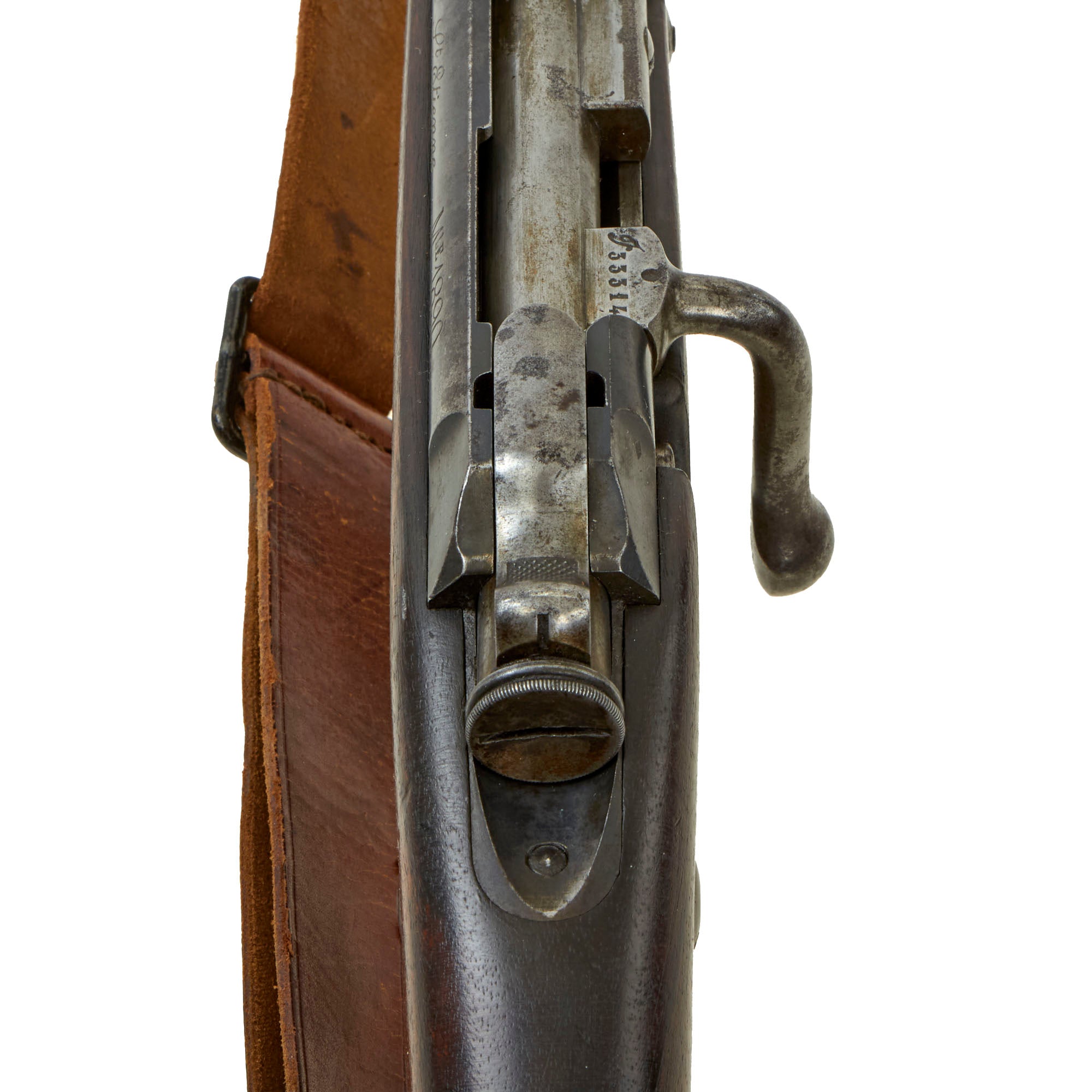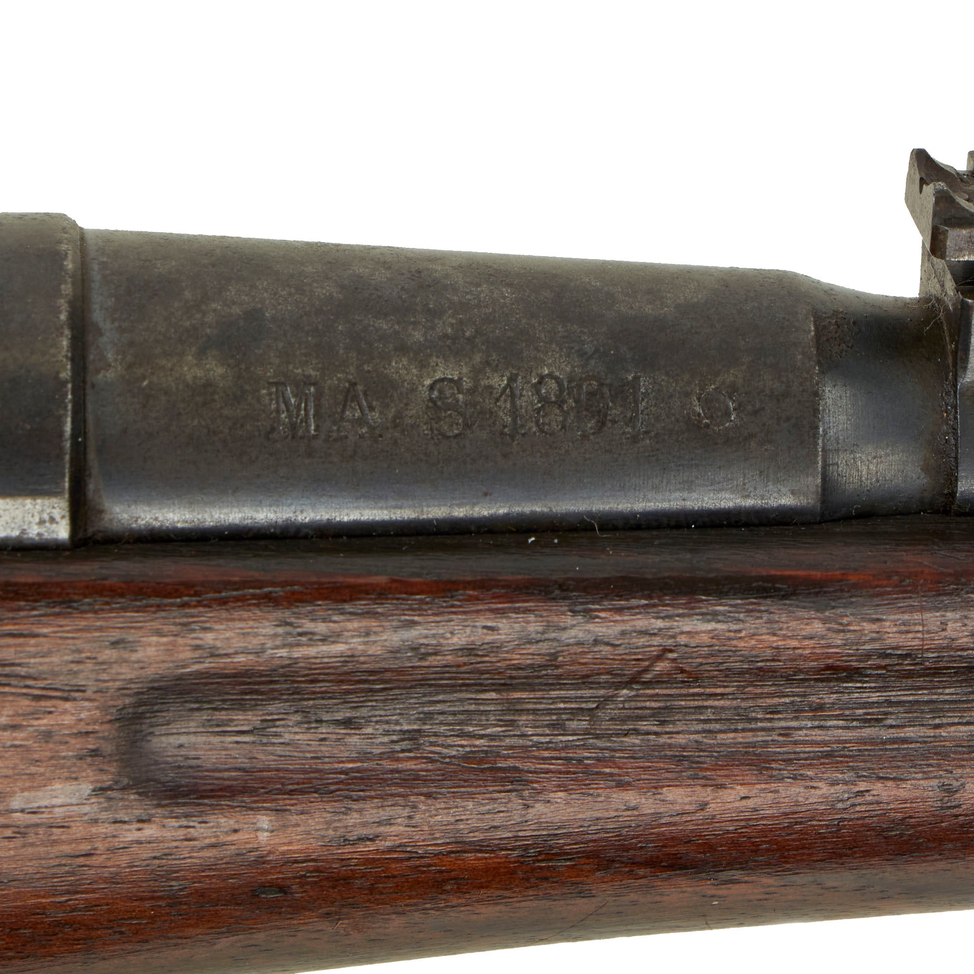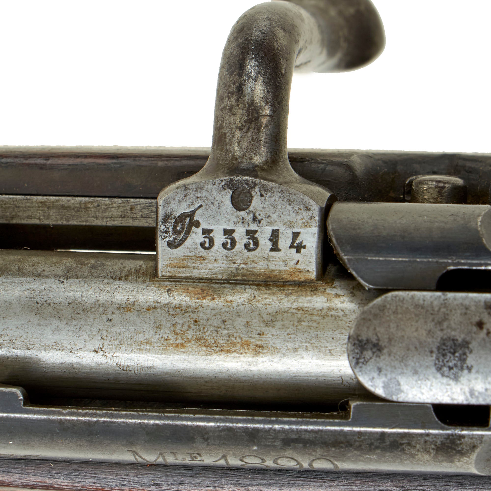 The left side of the receiver on this interesting early example is clearly marked with St" Étienne, and to the right MLE 1890, indicating manufacture at the government arsenal at Saint-Étienne. The rifle has arsenal proofs on most parts, and is marked MA S 1891 on the right side of the barrel, the abbreviation for Manufacture d'Armes Saint-Étienne, indicating that it was produced in 1891, the second year of production. It is also markd with serial number F 33314 on the barrel, magazine housing, bolt, and even very faintly on the left side of the butt stock. That makes this a very nice "ALL MATCHING" example, with no parts swapped out over the years!