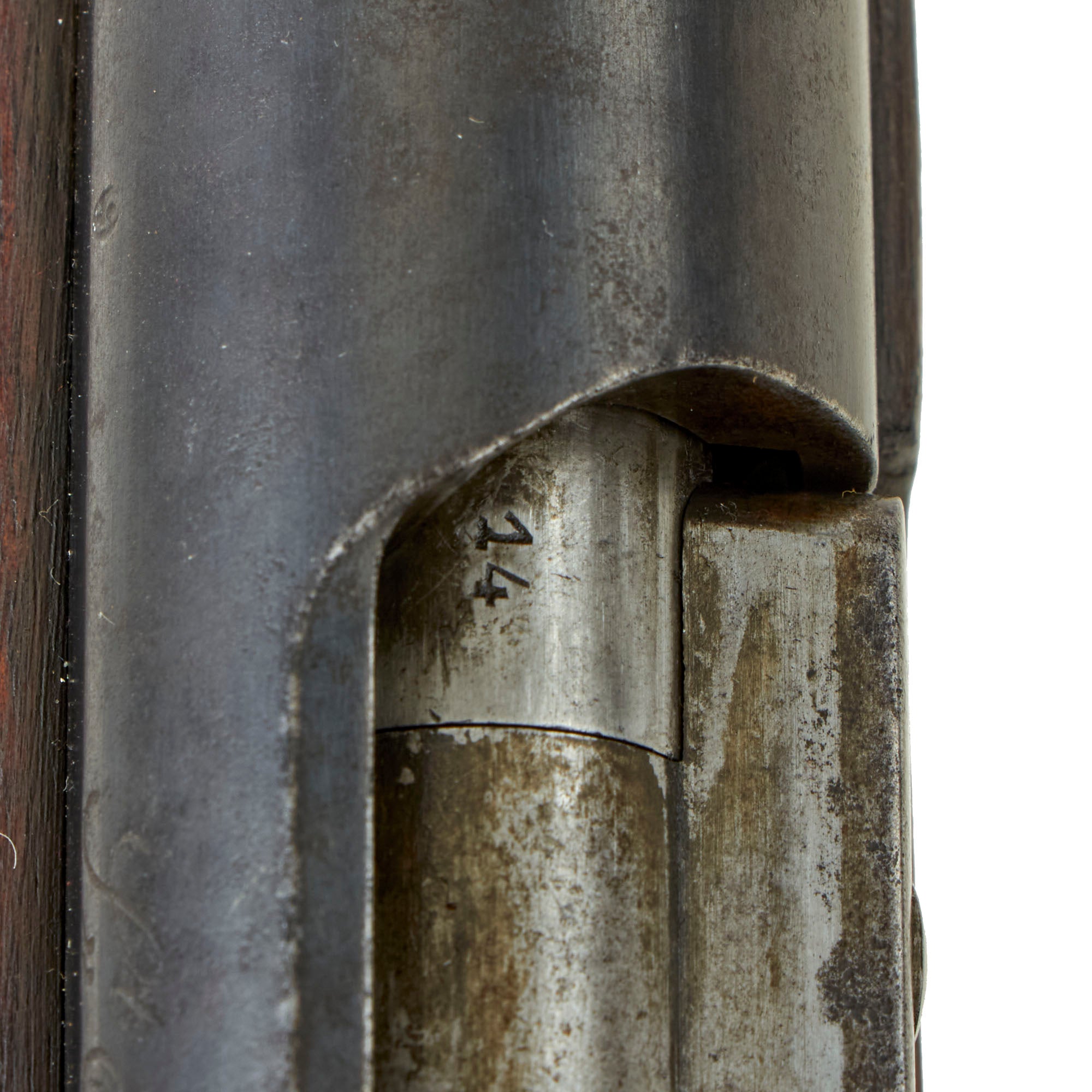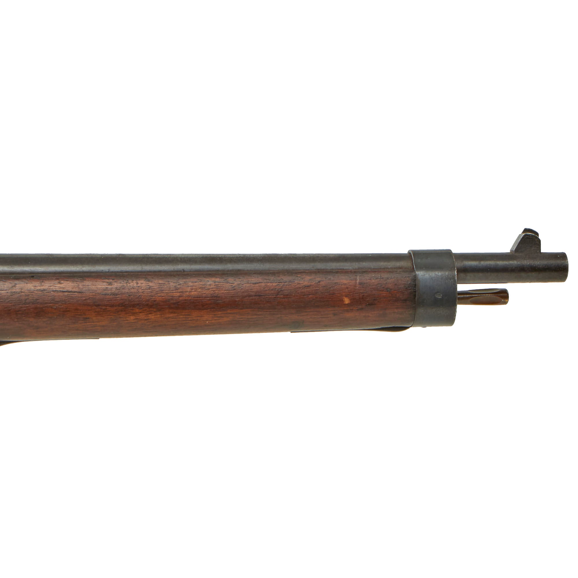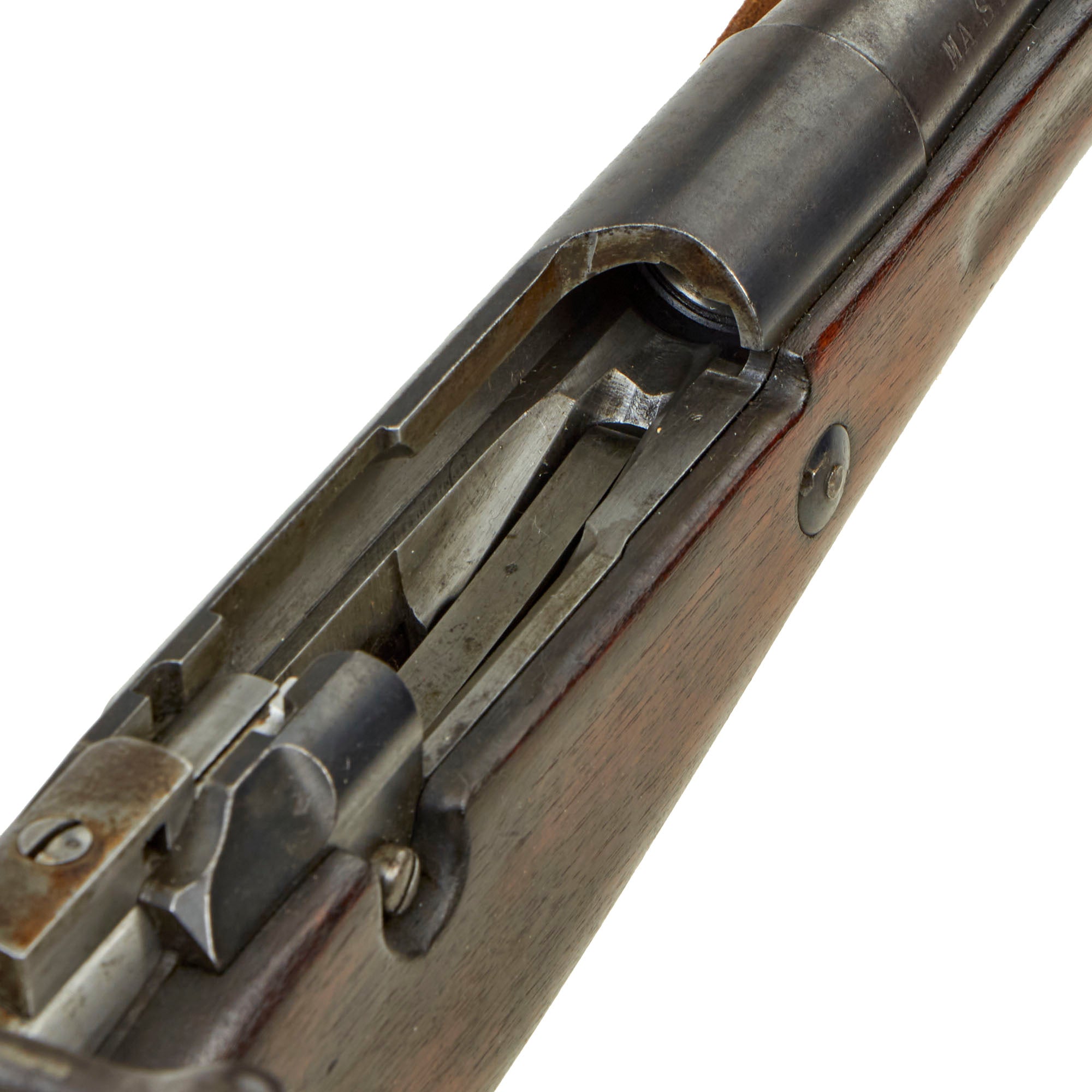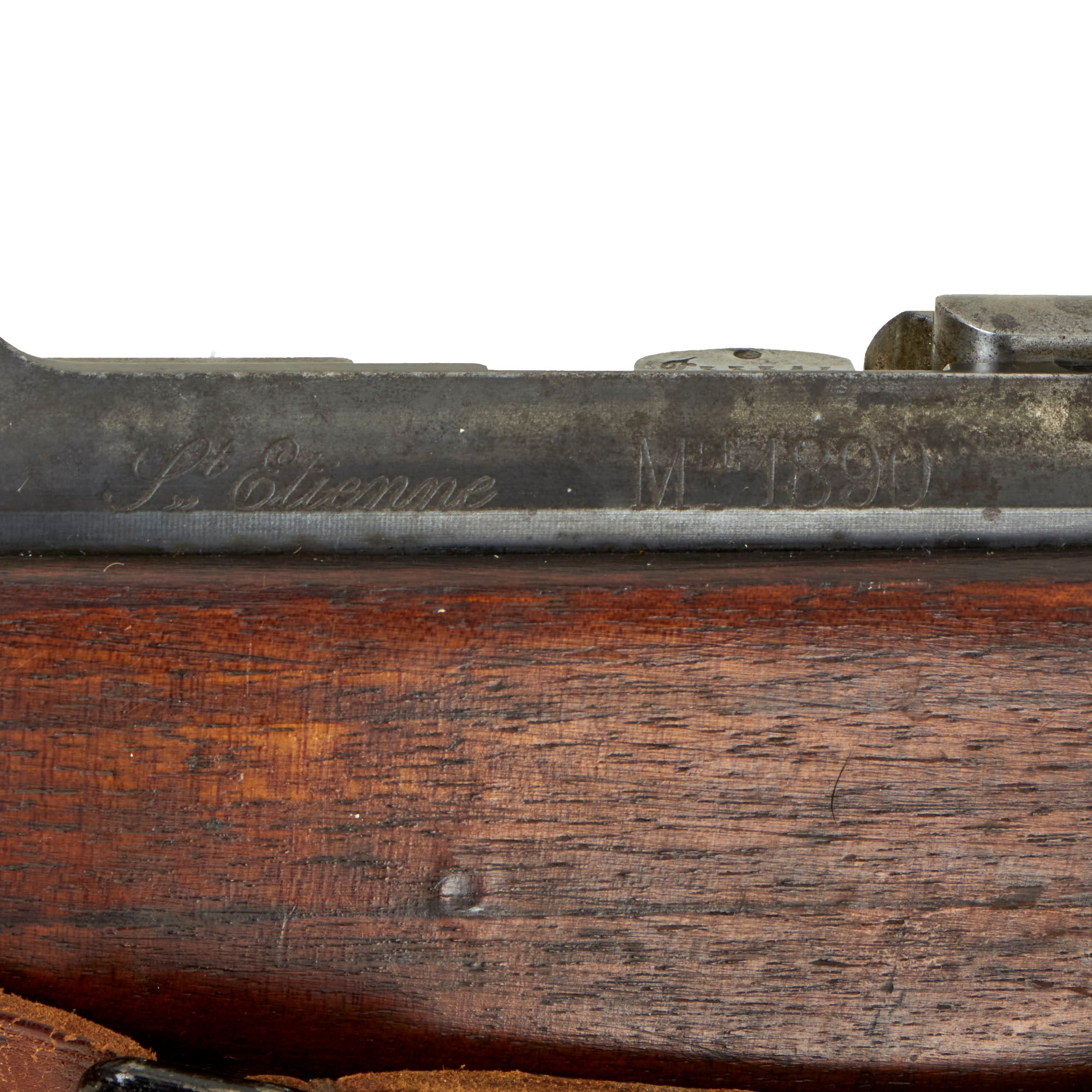 The left side of the receiver on this interesting early example is clearly marked with St" Étienne, and to the right MLE 1890, indicating manufacture at the government arsenal at Saint-Étienne. The rifle has arsenal proofs on most parts, and is marked MA S 1891 on the right side of the barrel, the abbreviation for Manufacture d'Armes Saint-Étienne, indicating that it was produced in 1891, the second year of production. It is also markd with serial number F 33314 on the barrel, magazine housing, bolt, and even very faintly on the left side of the butt stock. That makes this a very nice "ALL MATCHING" example, with no parts swapped out over the years!