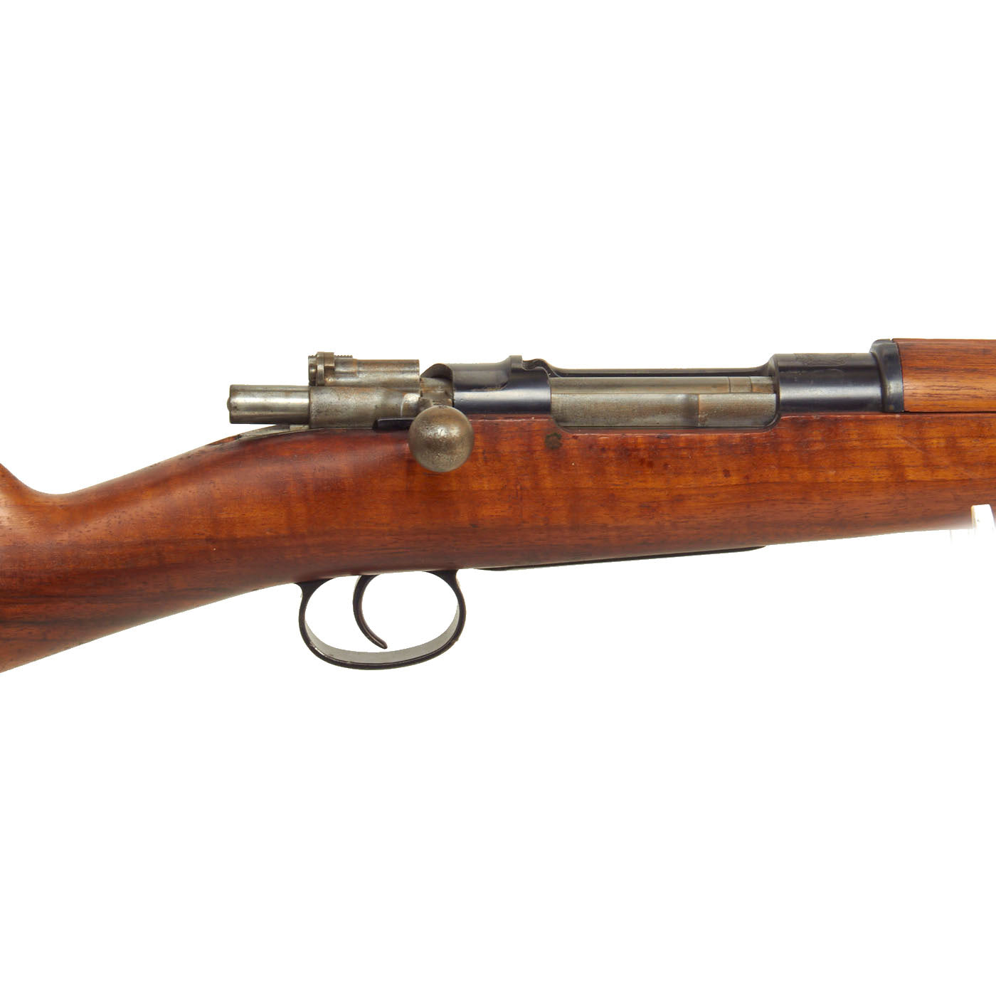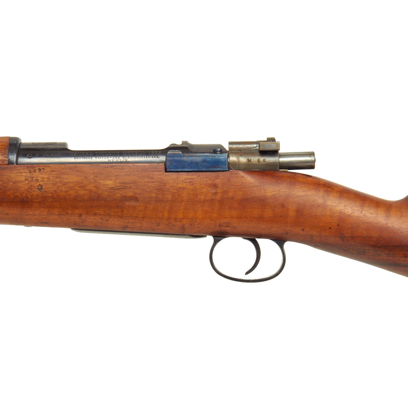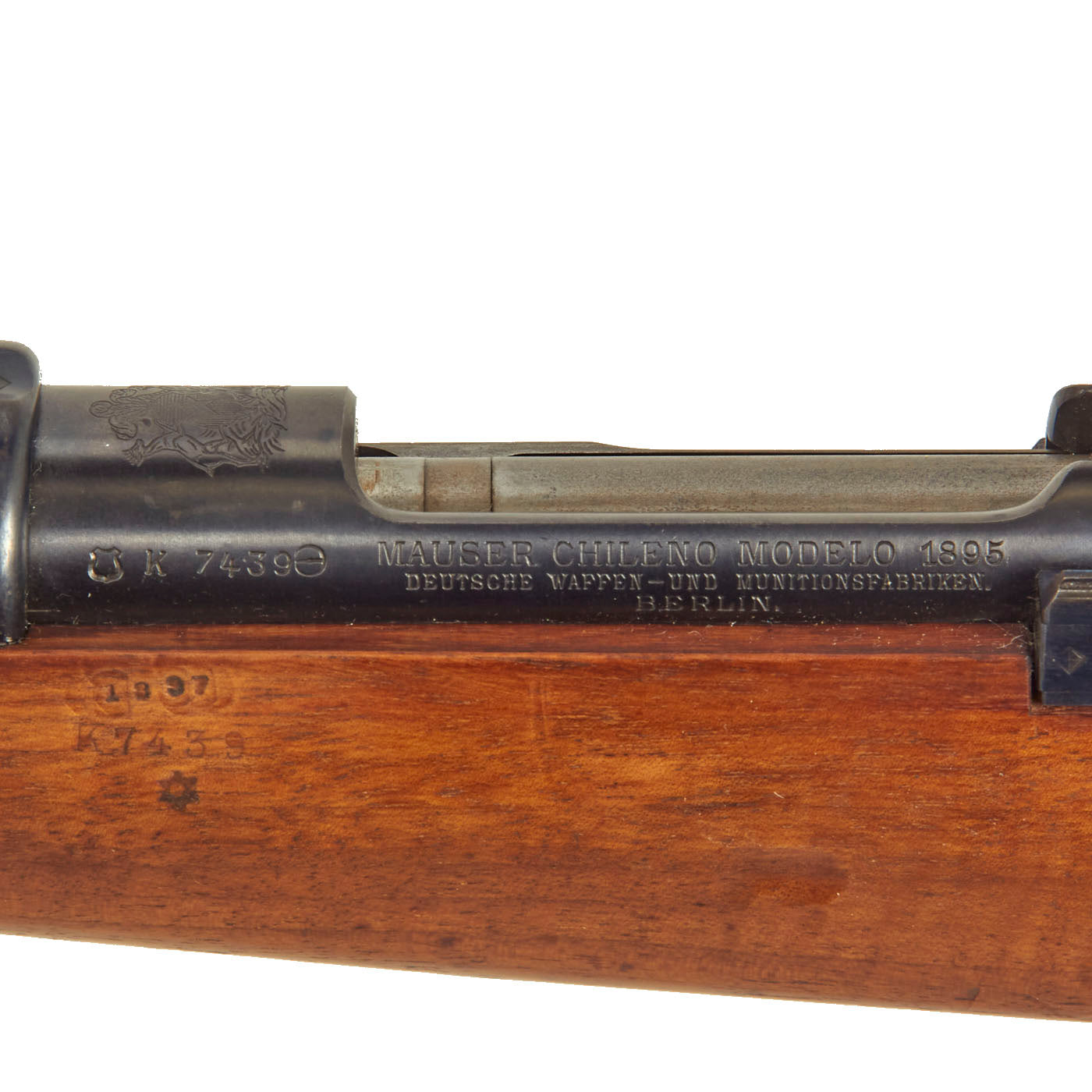 Original Item: Only One Available. This is a very good condition example of the Model 1895 Chilean Mauser Rifle, made by the renowned D.W.M. factory in BERLIN. This factory previously had made arms under the Ludwig Loewe Company name, however in 1896 the company consolidated its arms manufacturing, and founded Deutsche Waffen- und Munitionsfabriken, the famous D.W.M.. All rifles made 1897 onward were marked with the new company. The serial number of this example is K 7439, which continued the series from the Ludwig Loewe Marked examples. All D.W.M. made Chilean Mauser rifles with a letter prefix below "L" are considered ANTIQUE by U.S. FEDERAL LAW.