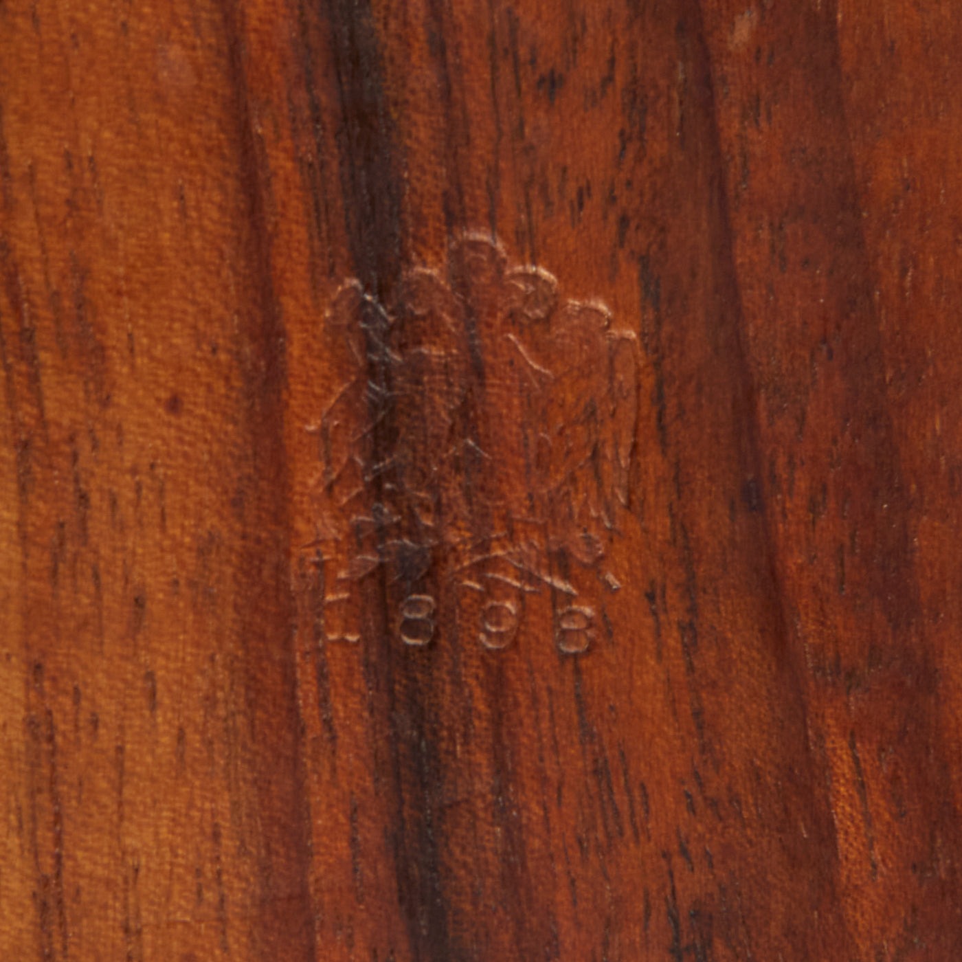 To the left of this is serial number K 7439, which is also stamped on the trigger guard, and the left side of the stock, as is correct. The shortened serial number 39 is present on many of the smaller components, as is correct. The bolt has non-matching number E 8968, having been swapped out at some point. The chamber has a crisp Chilean coat of arms marked on it, and there is even a crisp Chilean coat of arms Cartouche on the left side of the butt stock over a date of 1898.