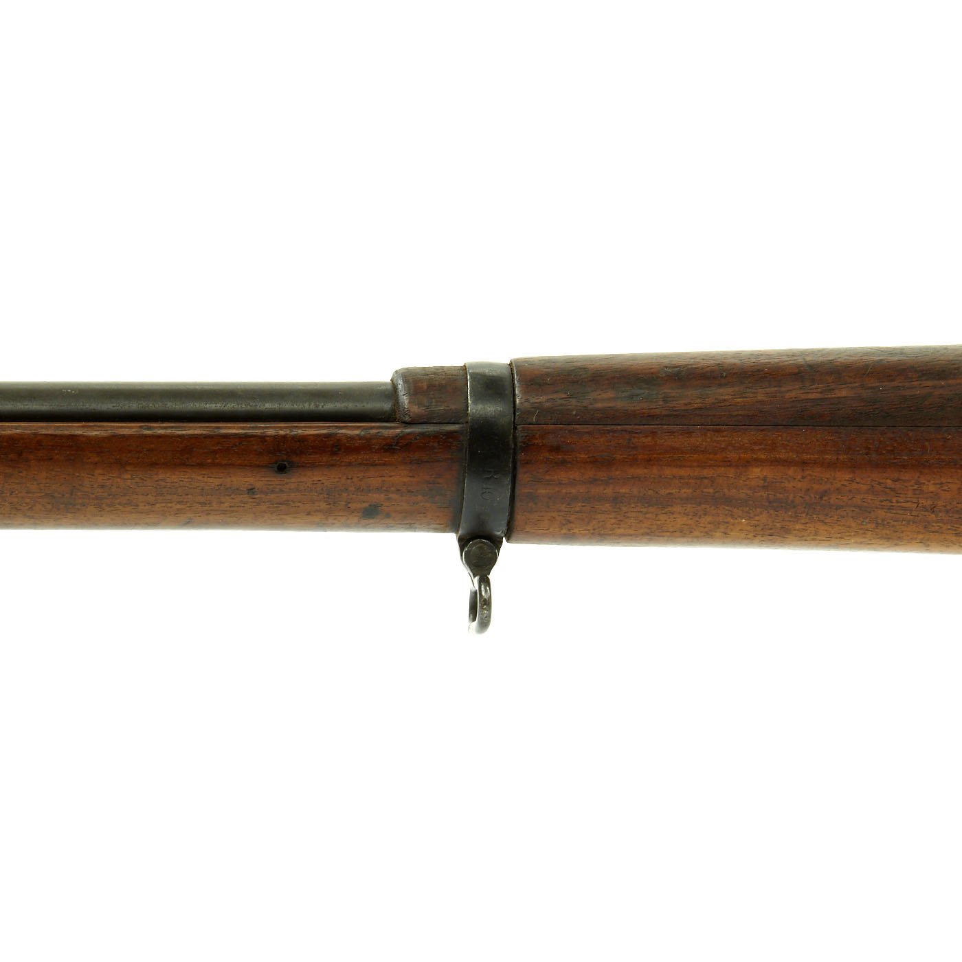 These rifles were originally chambered for 7.92mm Patrone 88 ammunition and had a fixed magazine. As with virtually all Gewehr 88 rifles in service, this example was converted to take the 7.92×57mm Mauser S Patrone. The Spitzer-shaped S Cartridge was ballistically superior to the M/88, however the chamber required modification to accept the thicker walled shell casing. This particular rifle has notched plates welded to the rear of the receiver on either side to accept the 1905 pattern stripper clips, making this a Gewehr 88/05 S. It also has the tell tale "notch" cut into the rear of the receiver, as the loaded clip would run into this area. This example no longer has the magazine floor plate.