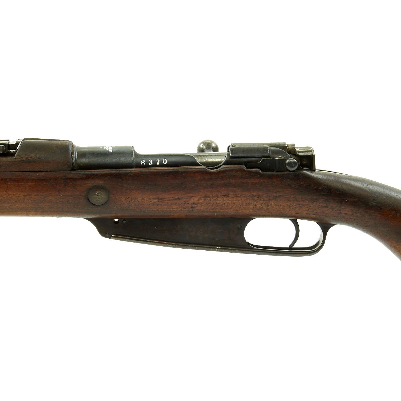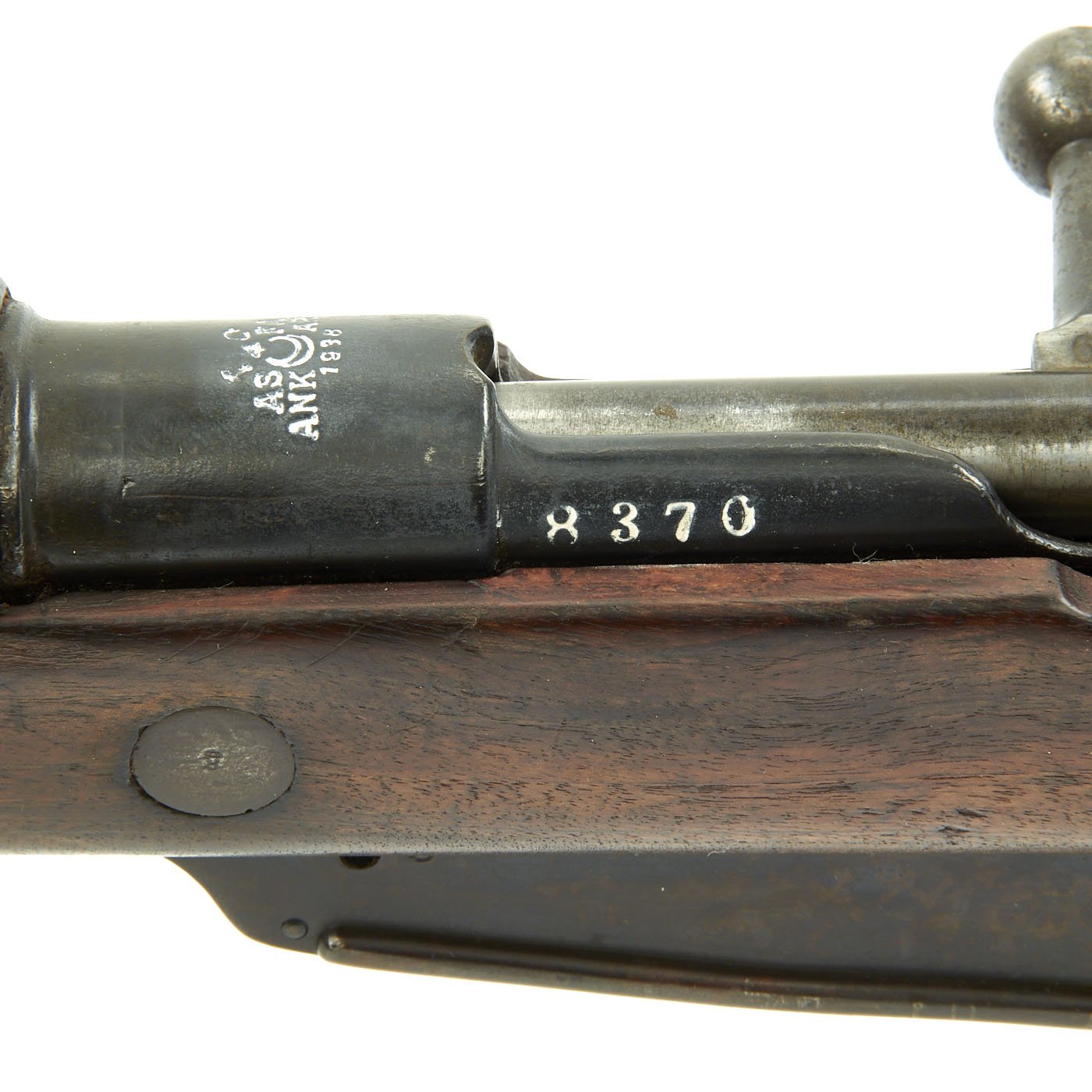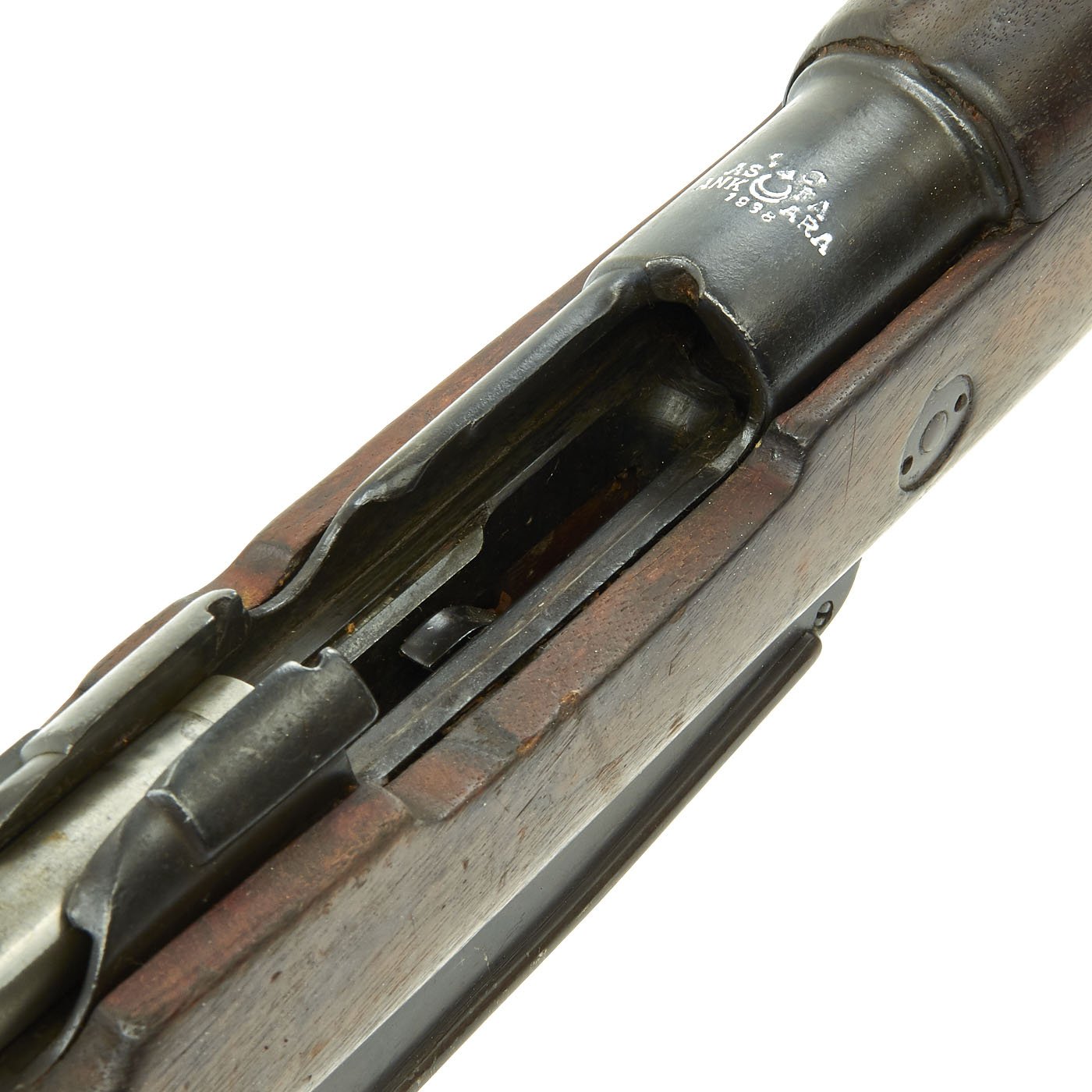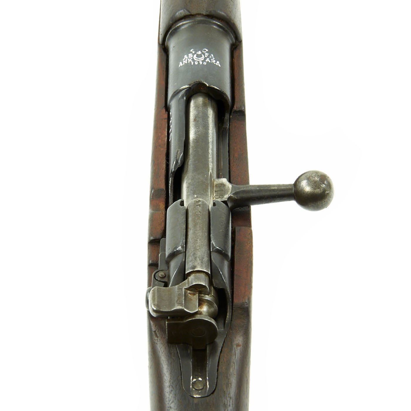 These modifications took place at ANKARA arsenal in turkey, and this rifle was converted in 1938, as indicated by the markings above the chamber. The original receiver actions were used, along with the bolts, which still bear their Crescent Moon markings. The stock is entirely new, and very close to the Mauser 98 design. The barrel inside a barrel jacket used by the GEW88 is gone, and the barrel is fitted with a new front and rear sight. We do not know whether the original barrels were used, or whether new made barrels were installed.
