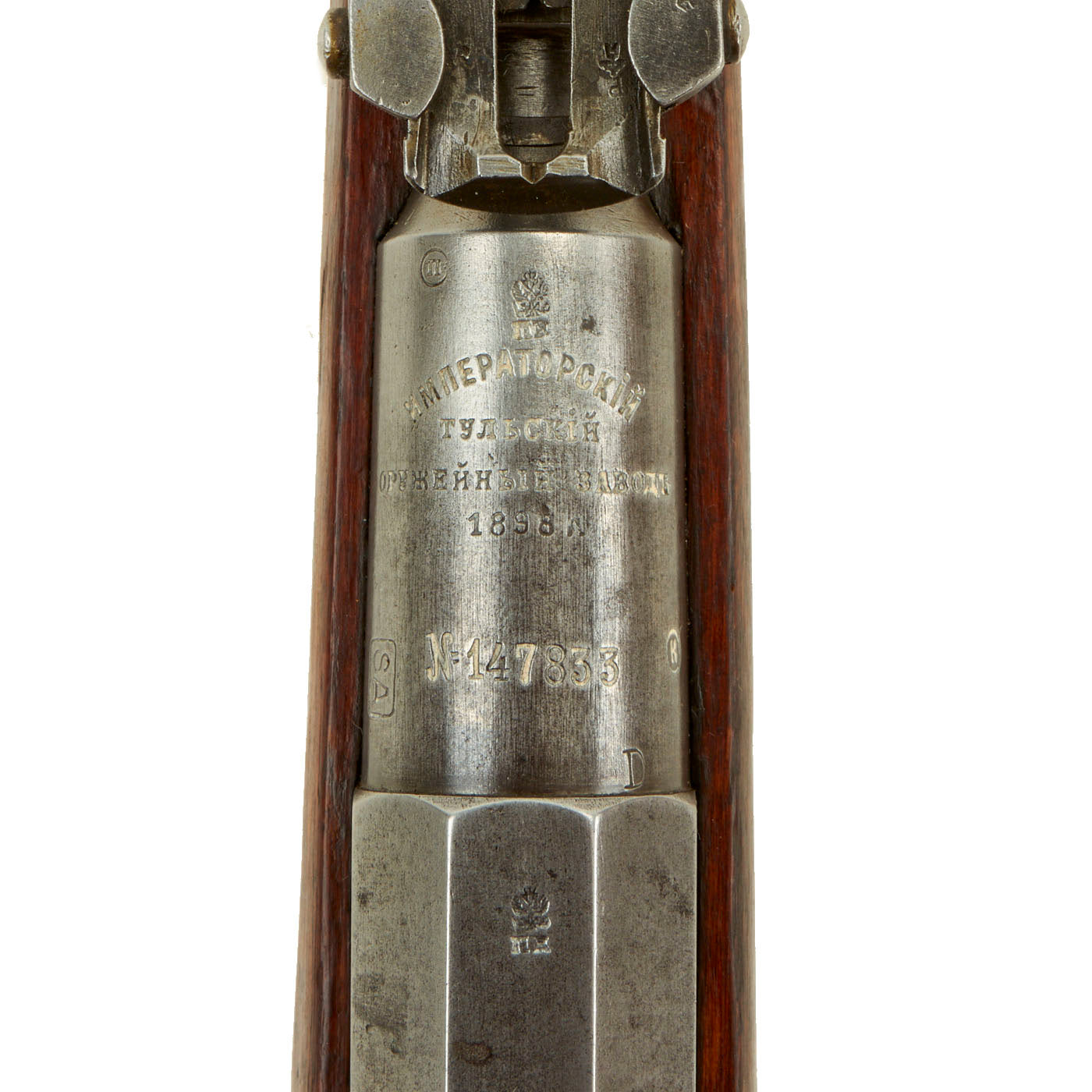 The receiver displays an Imperial Russian Double Headed Eagle across the chamber ring over Cyrillic letters Л К, which is also seen on the end of the barrel.