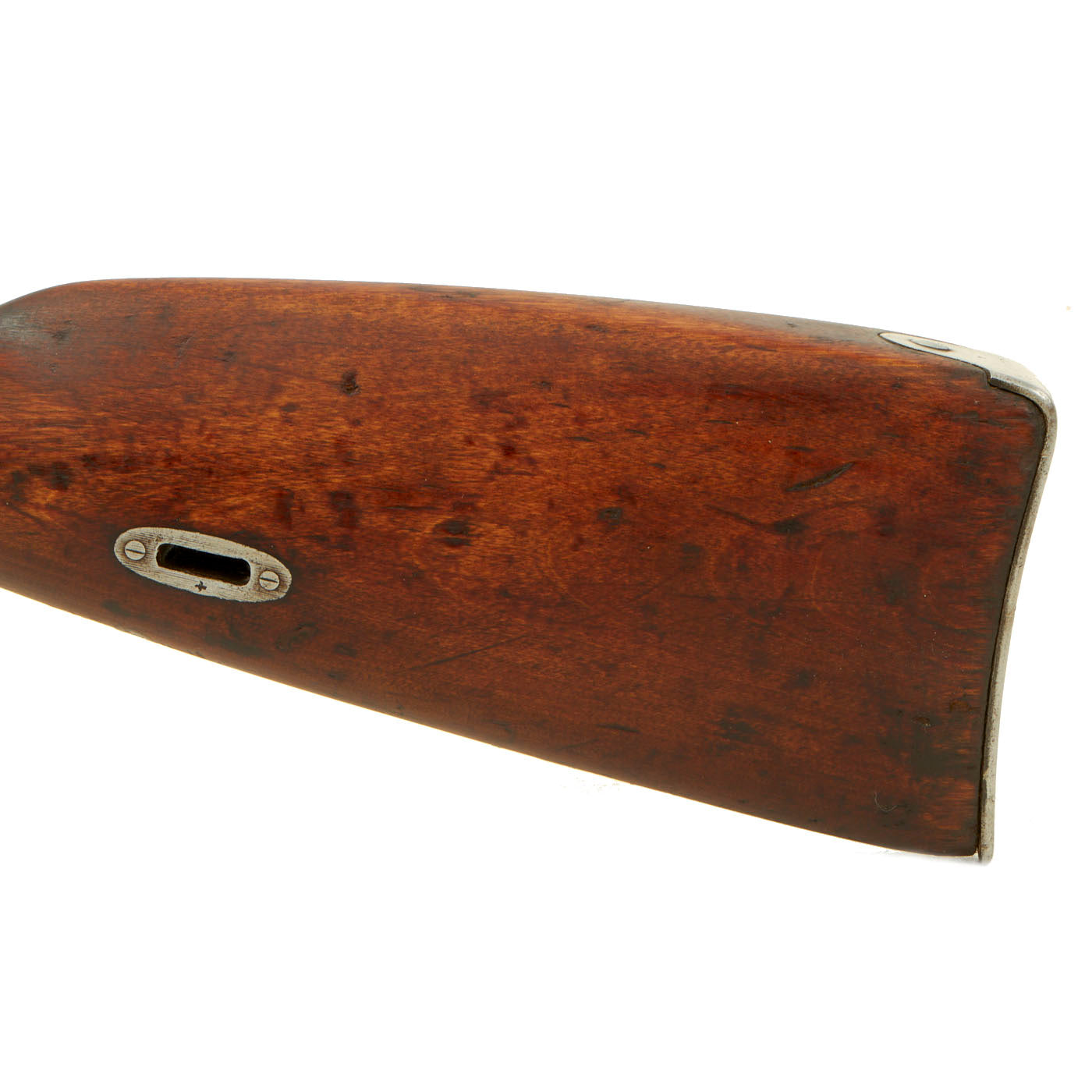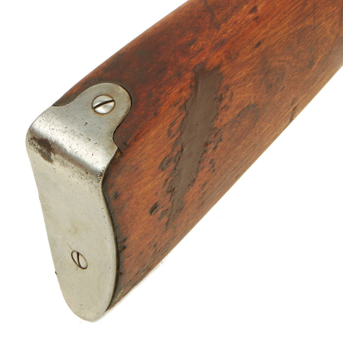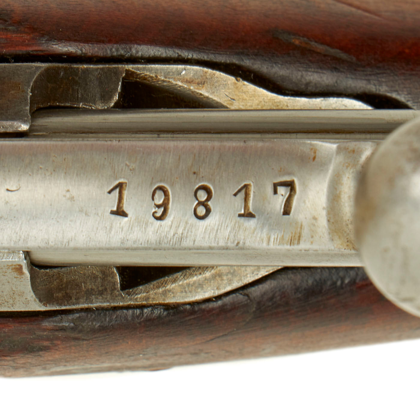Condition of the rifle is very good, especially considering the age and amount of service it must have seen. The stock is in good condition, though there is a filled in gouge on the right butt stock, and some other smaller areas of filler used on small holes. The metalwork is in good shape, mostly a worn blued finish with a bright steel bolt. It still retains the original cleaning rod, which is in good shape, still threading properly into the stock. The rifle cycles well, with a crisp dry fire, though it is a bit stiff while cycling.