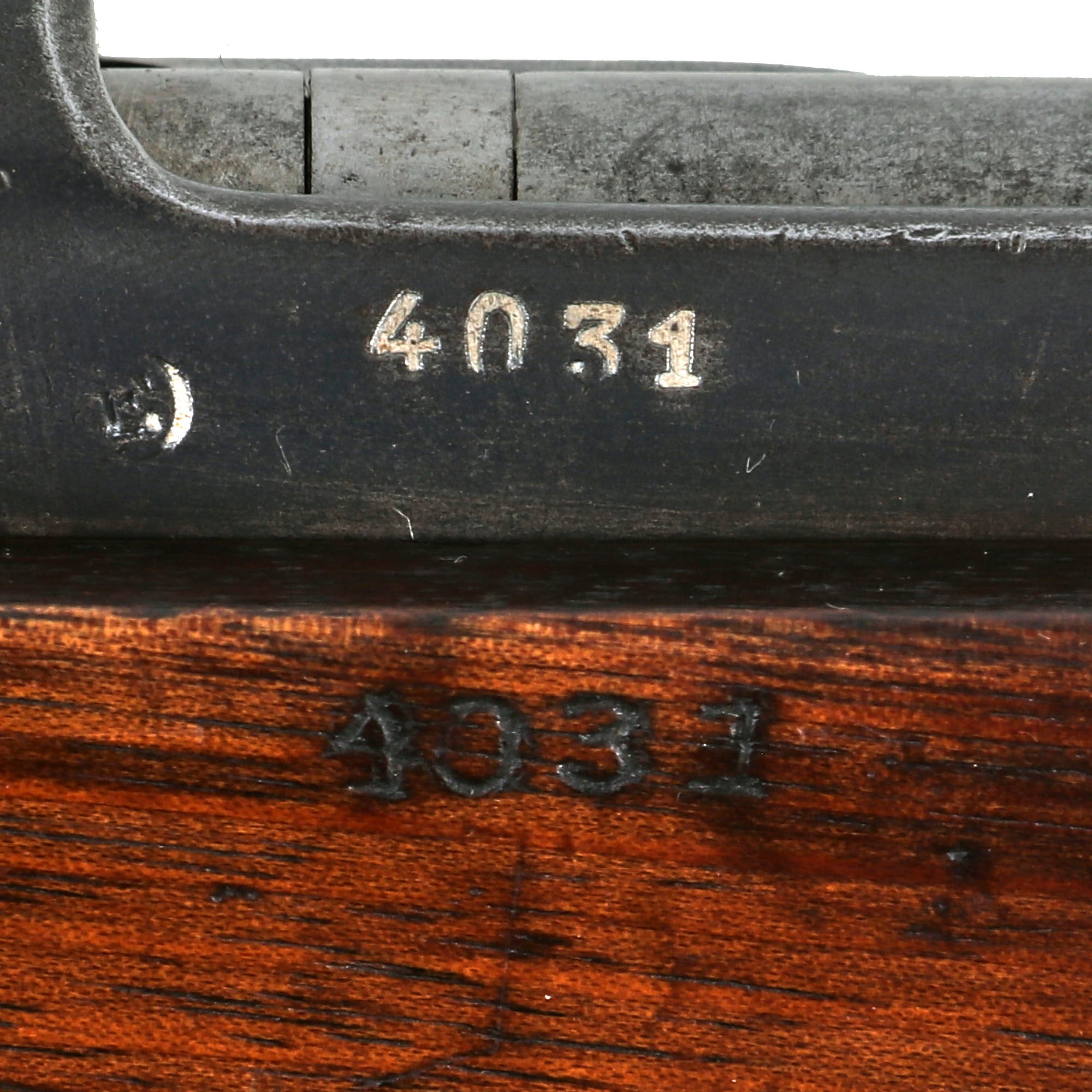 It is also marked with serial number 4031 on the side of the receiver, the side of the stock, and on the front of the magazine housing on the underside. The markings on the turned down bolt handle are not legible, and we cannot see serial number markings on any other components. We have also noted the the sling loop on the left side of the butt stock was removed at some point, and then had a channel ground into the side. The swivel and ring on the bottom of the butt stock is present, as is the left side sling on the barrel band.