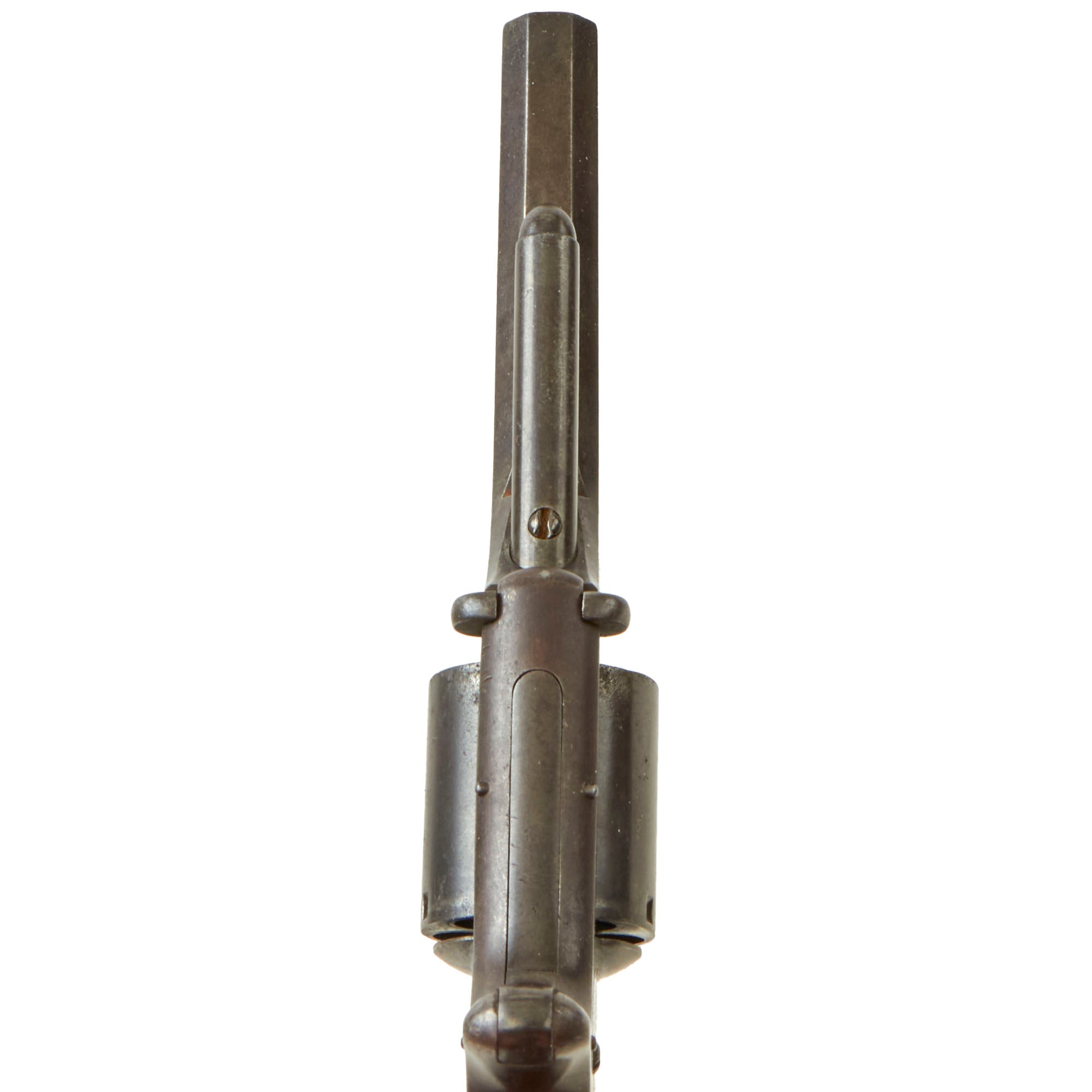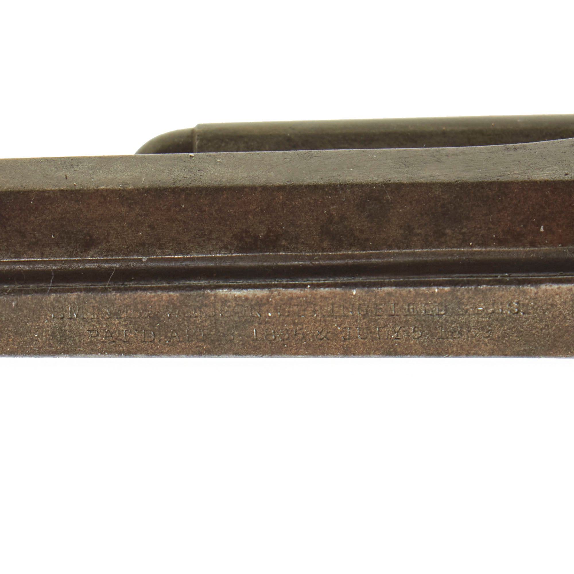 This is a lovely example of the Model 1 1/2, 1st Issue Revolver with 3 1/2" barrel, with the standard blued finish and finished rosewood grips. Produced by Smith and Wesson from 1865-1868, this was the firm's first iteration of the .32 rimfire tip-up, a more utilitarian design that the later 2nd issue. The original early Smith & Wesson address and patent dates are still easily readable on the top strap (Later 1st issue guns would display an 1865 patent date.):