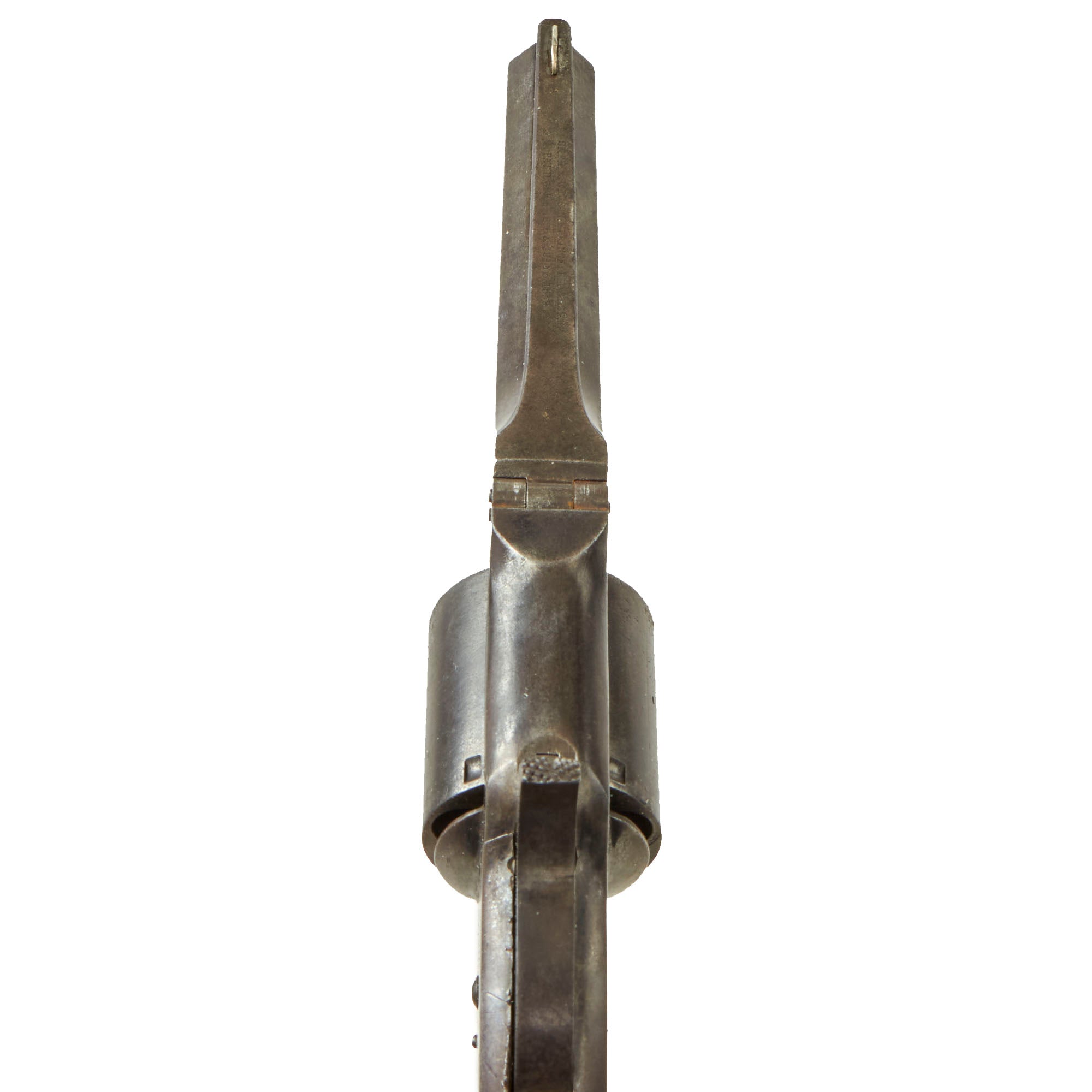 The bore is in very good condition, showing clear lands and grooves and a partly bright finish. There is however definitely some past powder fouling and oxidation, so this is definitely a revolver that saw a good amount of use during its service life. The revolver breaks open easily for reloading, with the hammer releasing the cylinder and no issues to note.