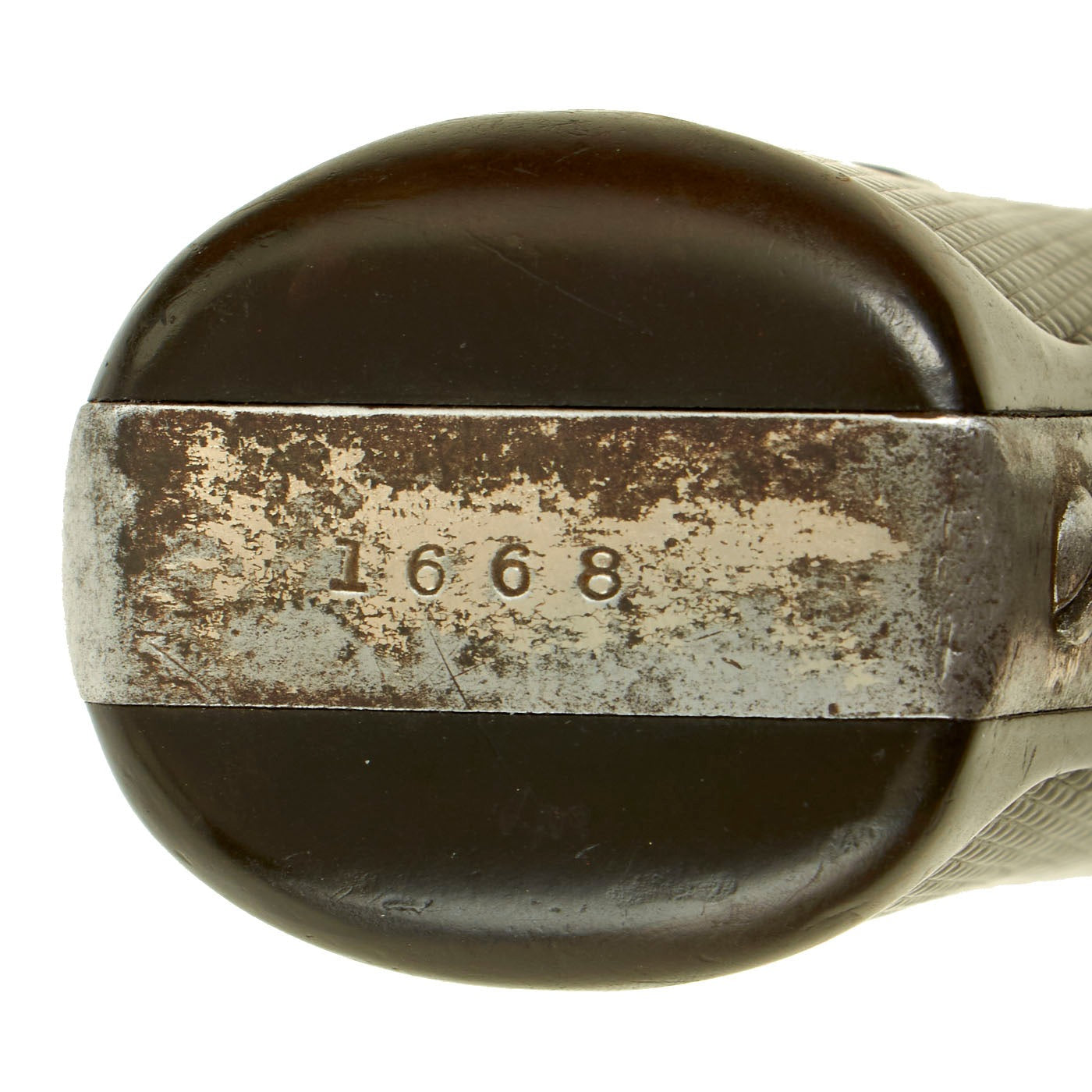 These patent markings are definitive for the "New Model" No.3, due to the 1877 patent date, as well as the "reissue" marking. The exterior surface of the revolver is quite worn, with only a few traces of the original nickel plated finish, except on the bottom of the frame, where it is well retained. However, the serial number 1668 on the bottom of the grip is clear, and matches the serial number stamped on the back of the cylinder, on the bottom of the frame latch, and on the back of the barrel right by the frame latch. That makes this a very nice "ALL MATCHING" example, with no parts swapped out over the years!