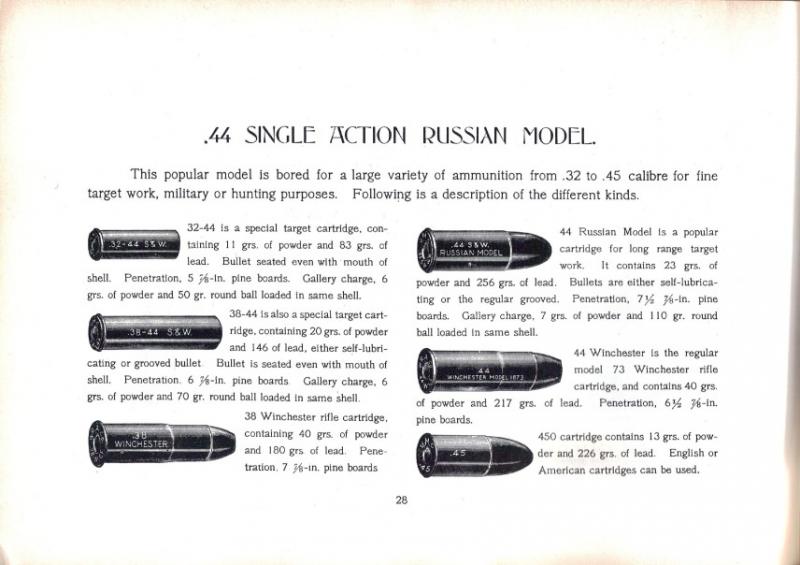 The S&W Model 3 was originally chambered for the .44 S&W American and .44 Russian cartridges, and typically did not have the cartridge information stamped on the gun (as is standard practice for most commercial firearms). Model 3 revolvers were later produced in an assortment of calibers, including .44 Henry Rimfire, .44-40, .32-44, .38-44, and .45 Schofield. The design would influence the smaller S&W .38 Single Action that is retroactively referred to as the Model 2.