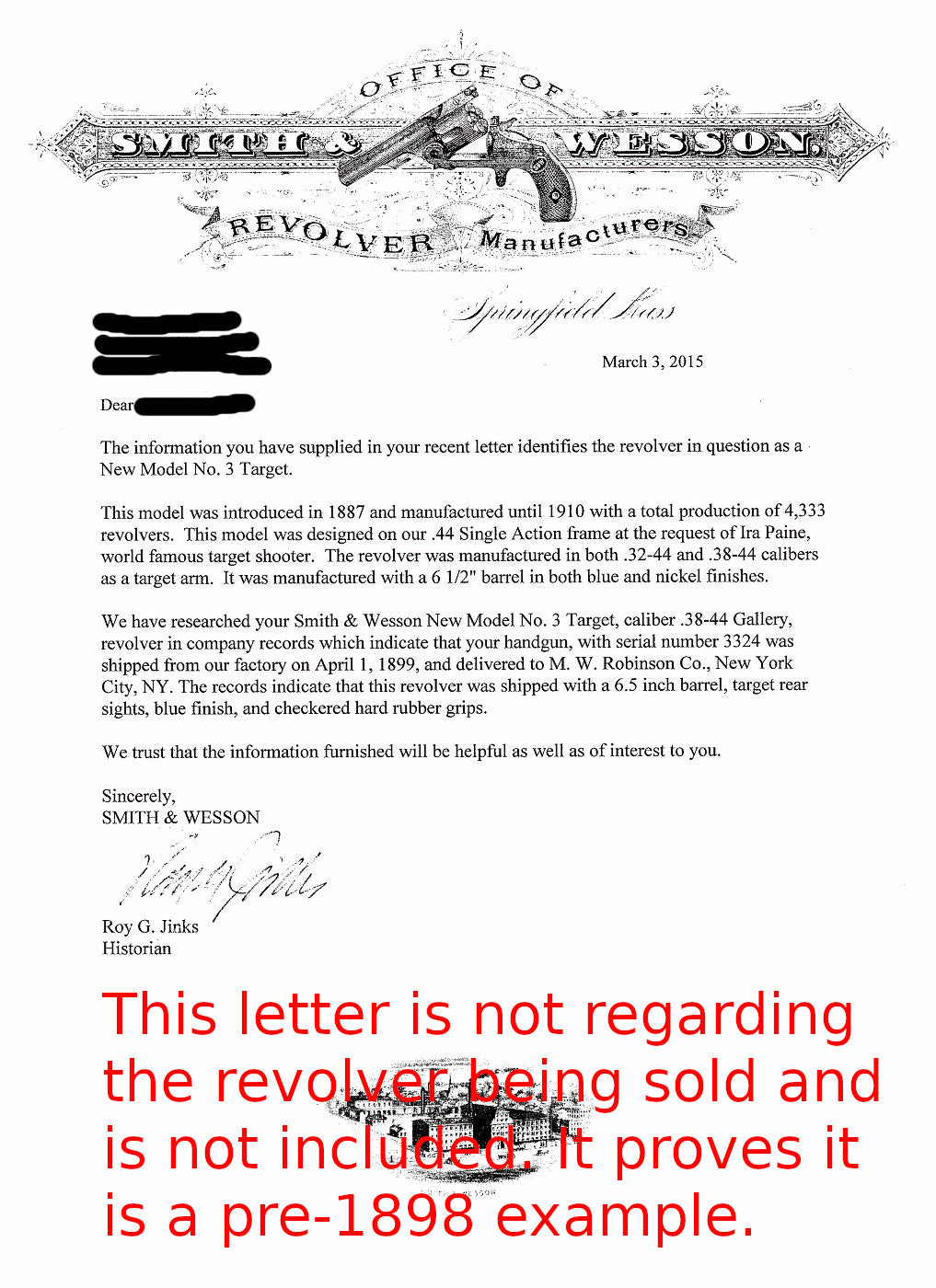 With that information we can say that this revolver serial "1668" is indisputably pre 1899 manufacture, made circa 1890, and considered an antique by Federal law. Again, the letter is not for the revolver being sold in this listing, and is not included. It is only shown to provide background information from the Smith & Wesson factory and to show that this example, serial 1668, is a Pre-1899 Antique.