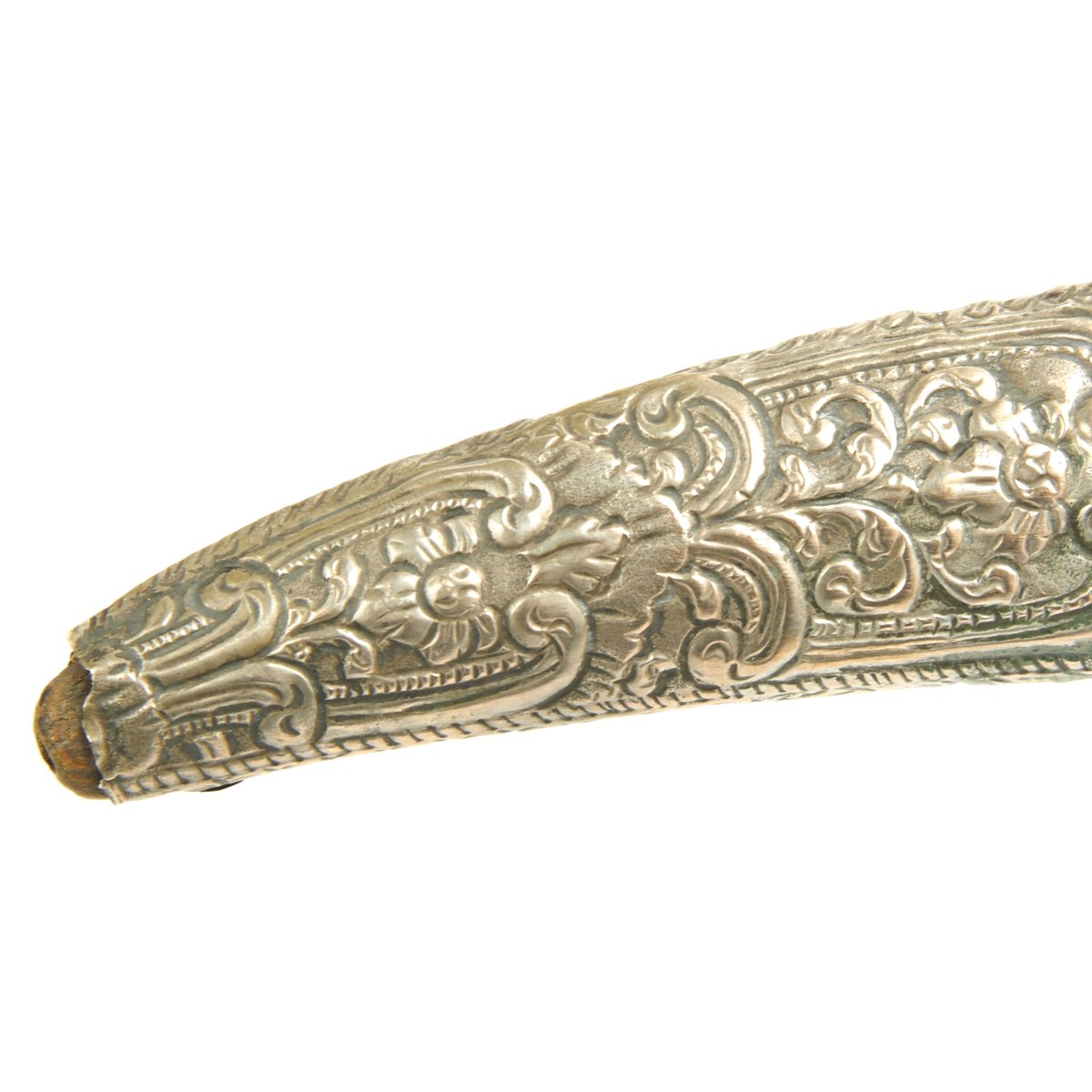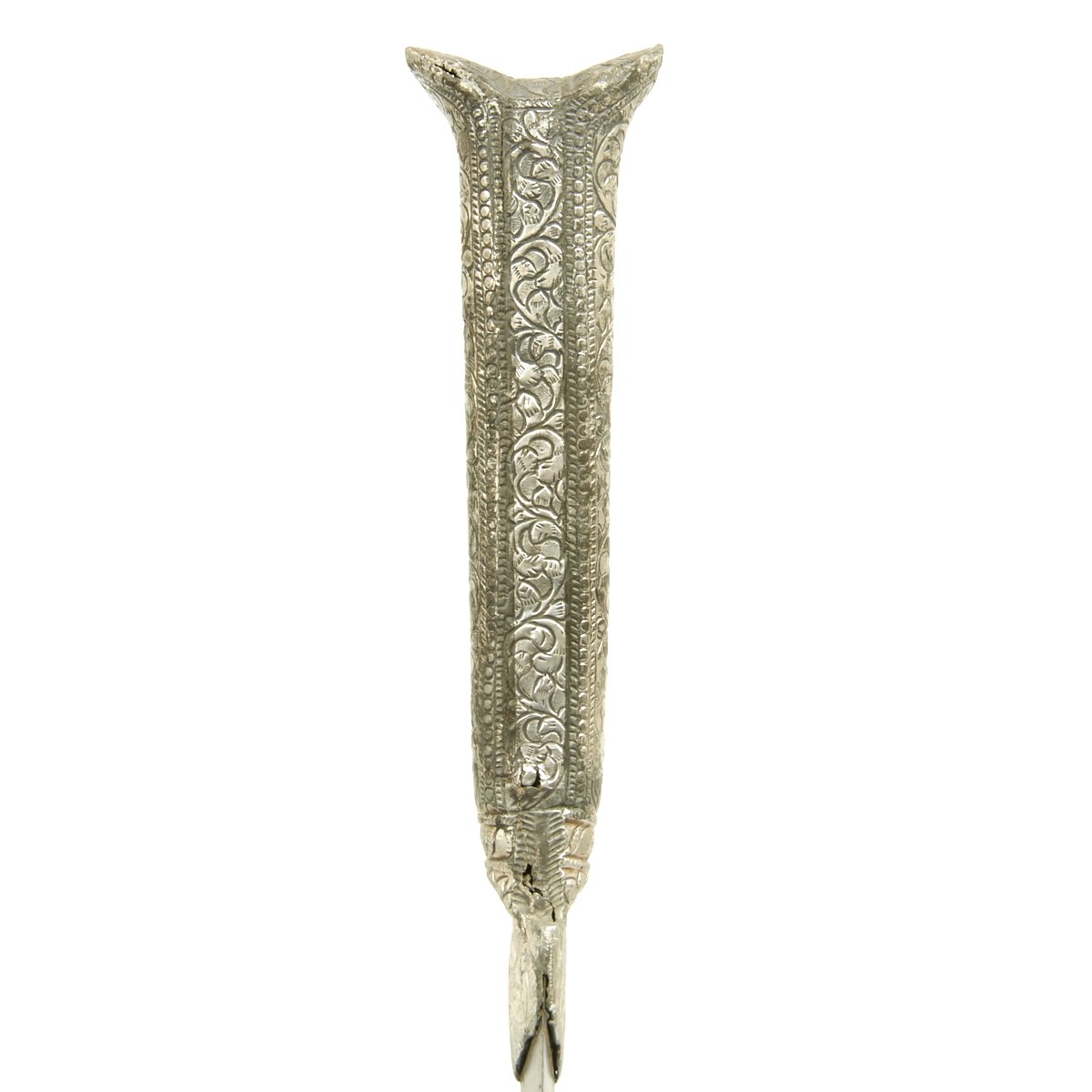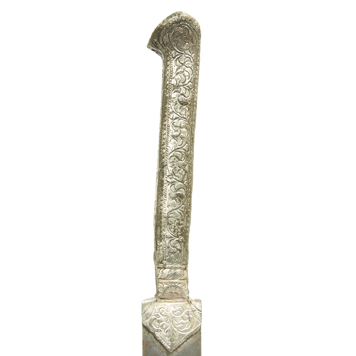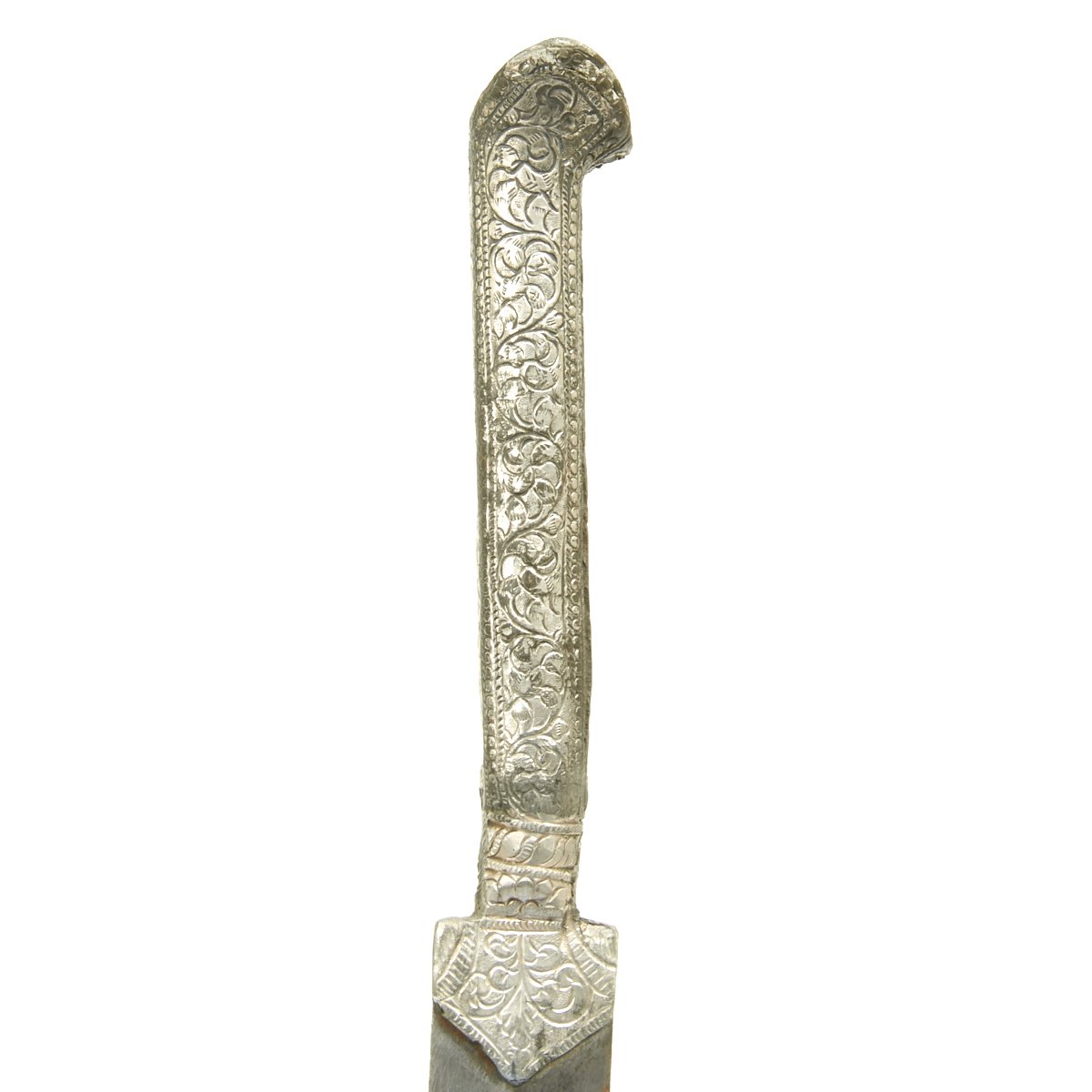Original Item: One-of-a-kind. This is a very interesting and quality item originating from somewhere in the Middle East. A wicked curved little double edged blade measuring 7.5 long bearing what looks like either an imitation European armorer's mark or Arabic lettering. Just 12" in overall length, this dagger is completely covered in engraved and embossed silver, both hilt and scabbard. Appears to be a perfect Assassin's weapon, no doubt with many stories to tell.