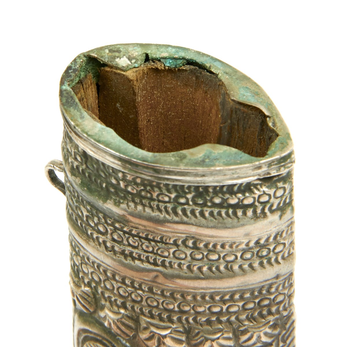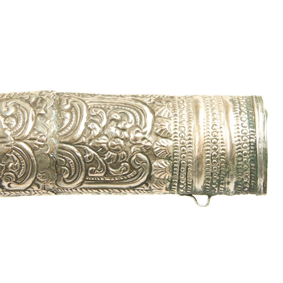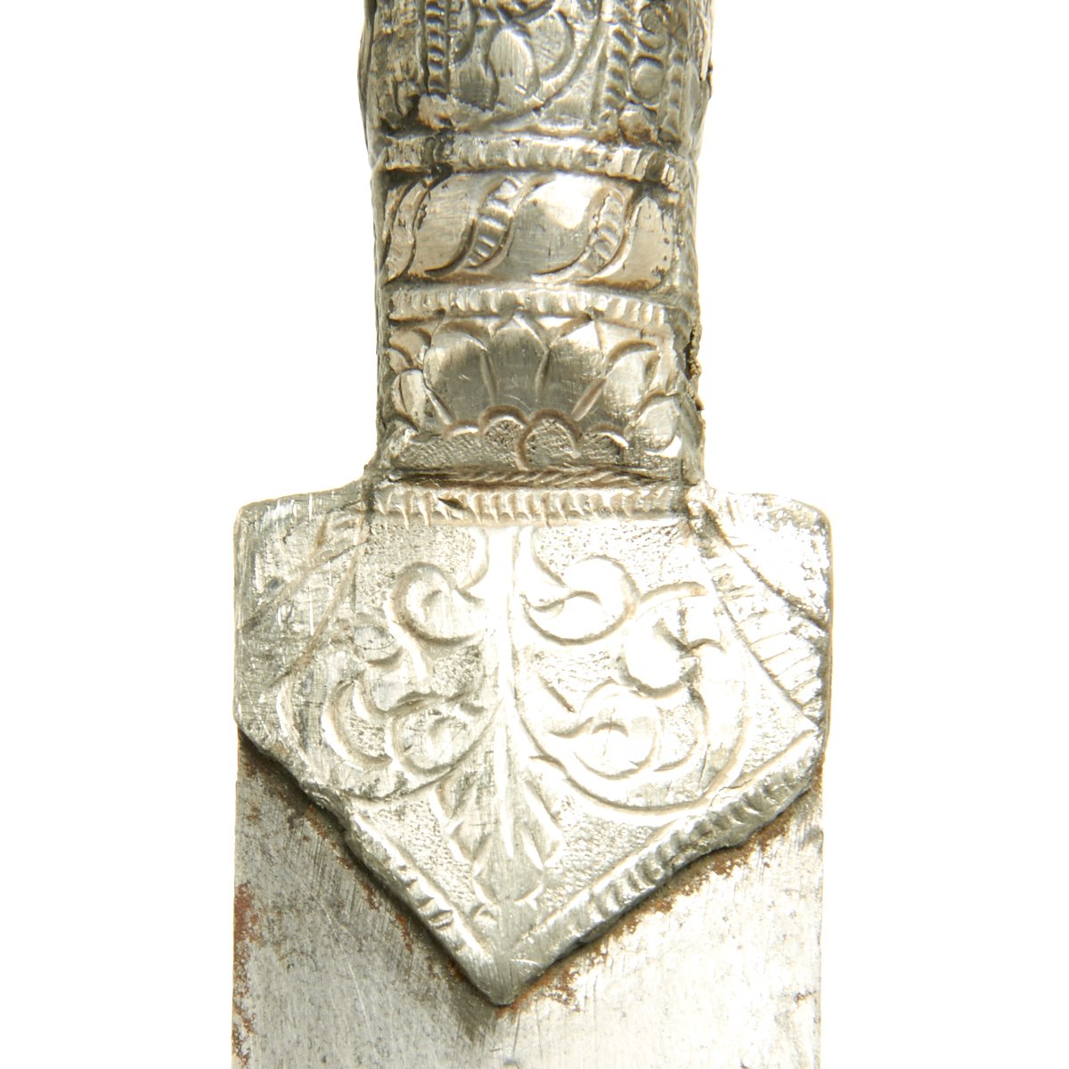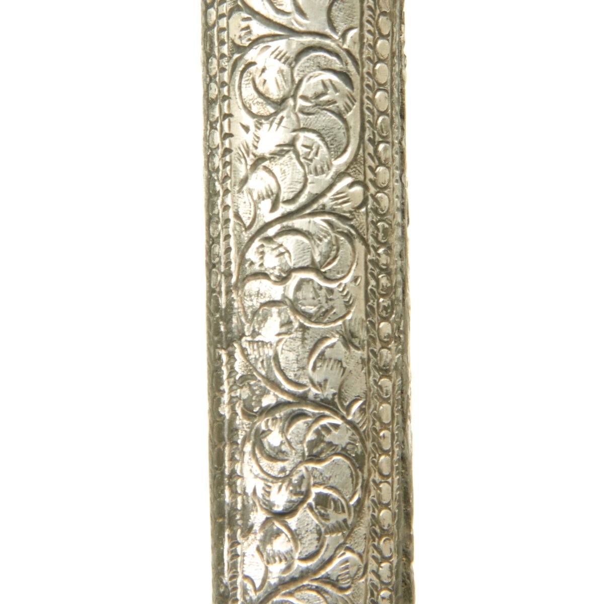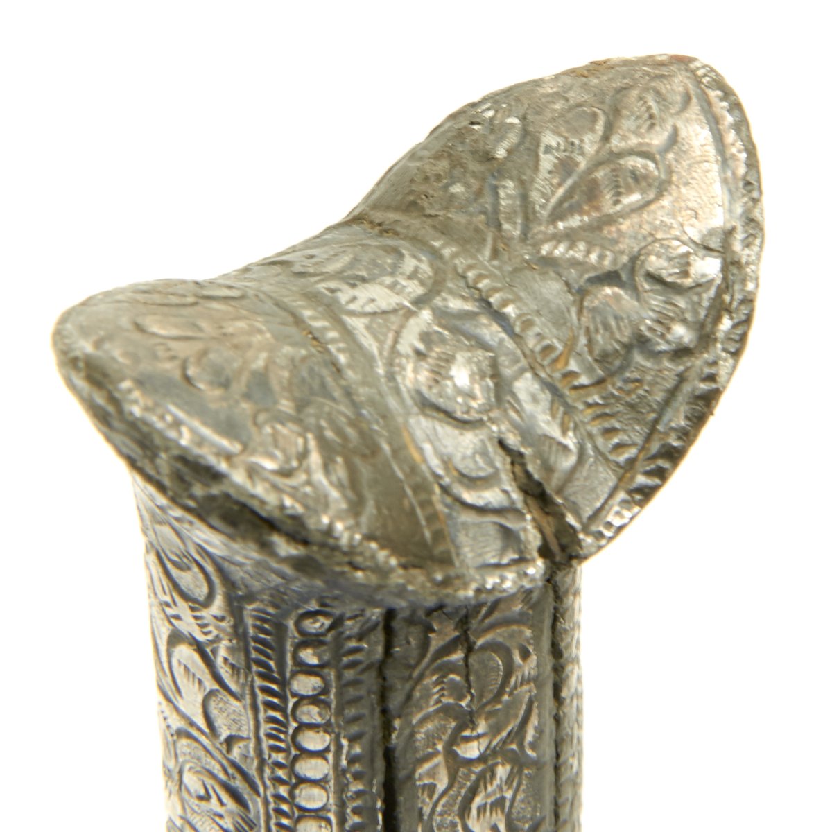 Original Item: One-of-a-kind. This is a very interesting and quality item originating from somewhere in the Middle East. A wicked curved little double edged blade measuring 7.5 long bearing what looks like either an imitation European armorer's mark or Arabic lettering. Just 12" in overall length, this dagger is completely covered in engraved and embossed silver, both hilt and scabbard. Appears to be a perfect Assassin's weapon, no doubt with many stories to tell.