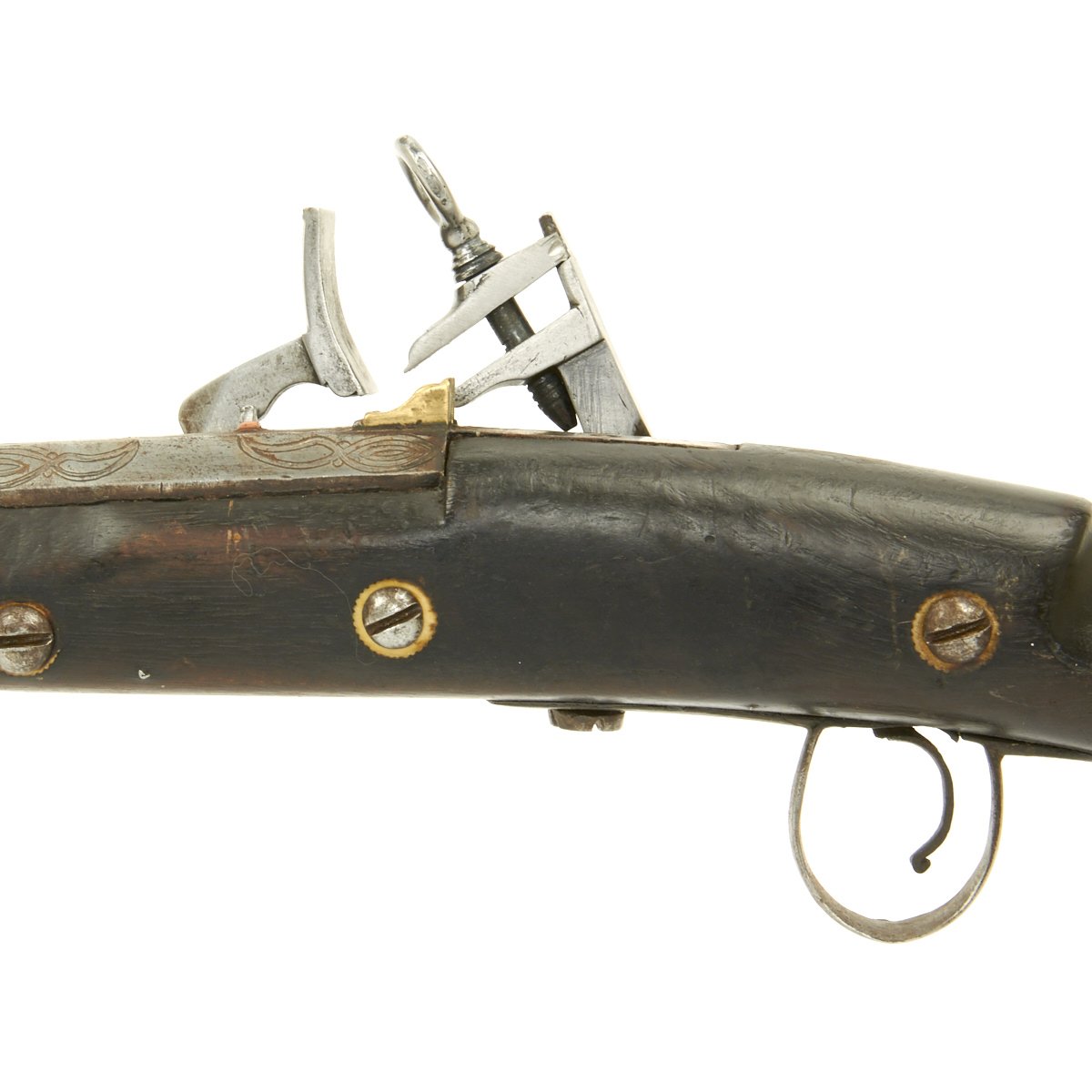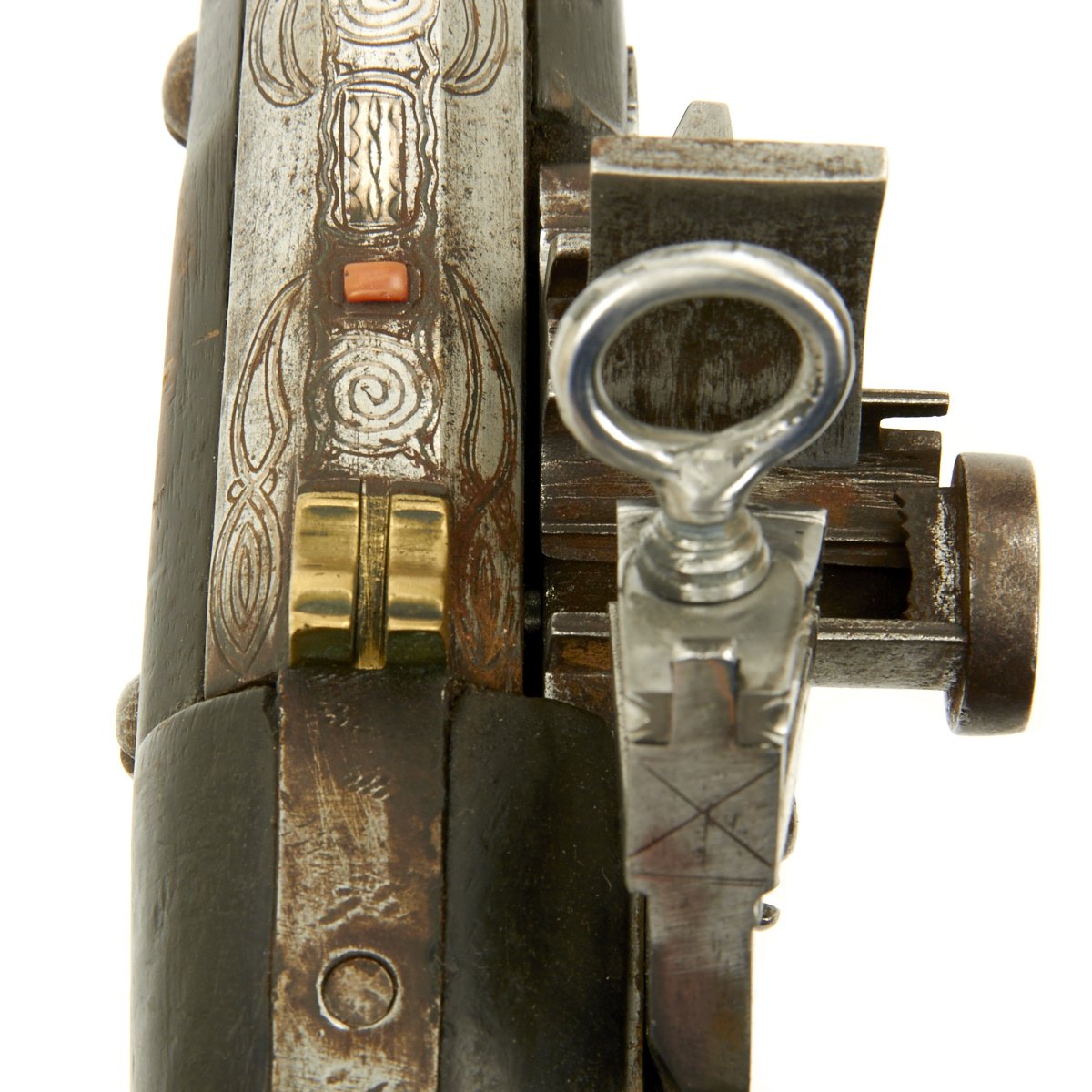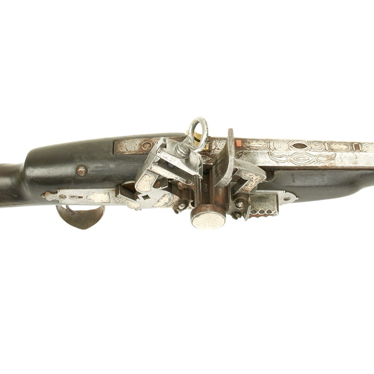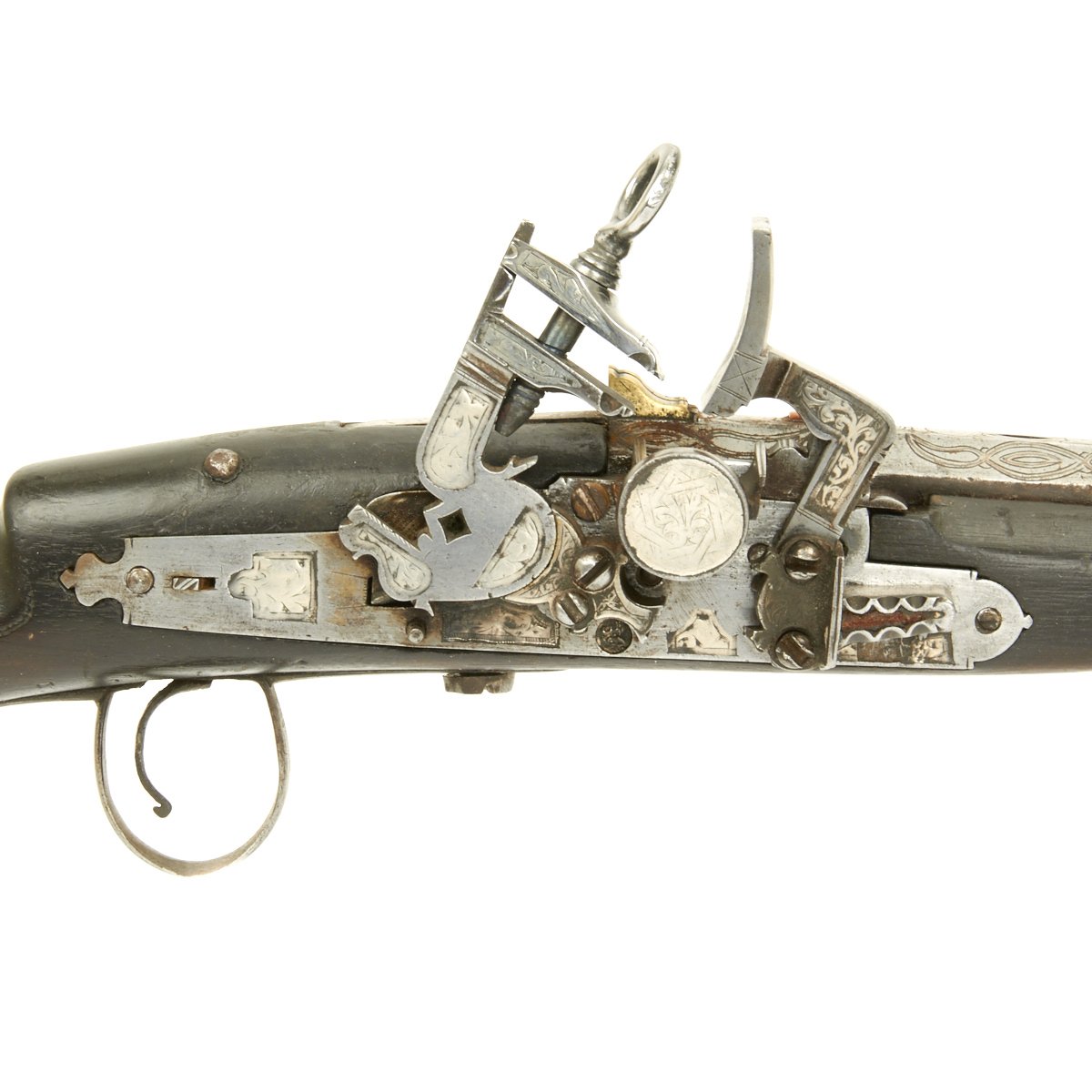 The magnificent migulet lock is 8" in length and heavily inlaid with Silver engraved plaques. It has large proportions, the steel being beautifully chiseled and cut with large ringed top jaw screw. Showing heavy Armorer's Mark below the hammer stop.