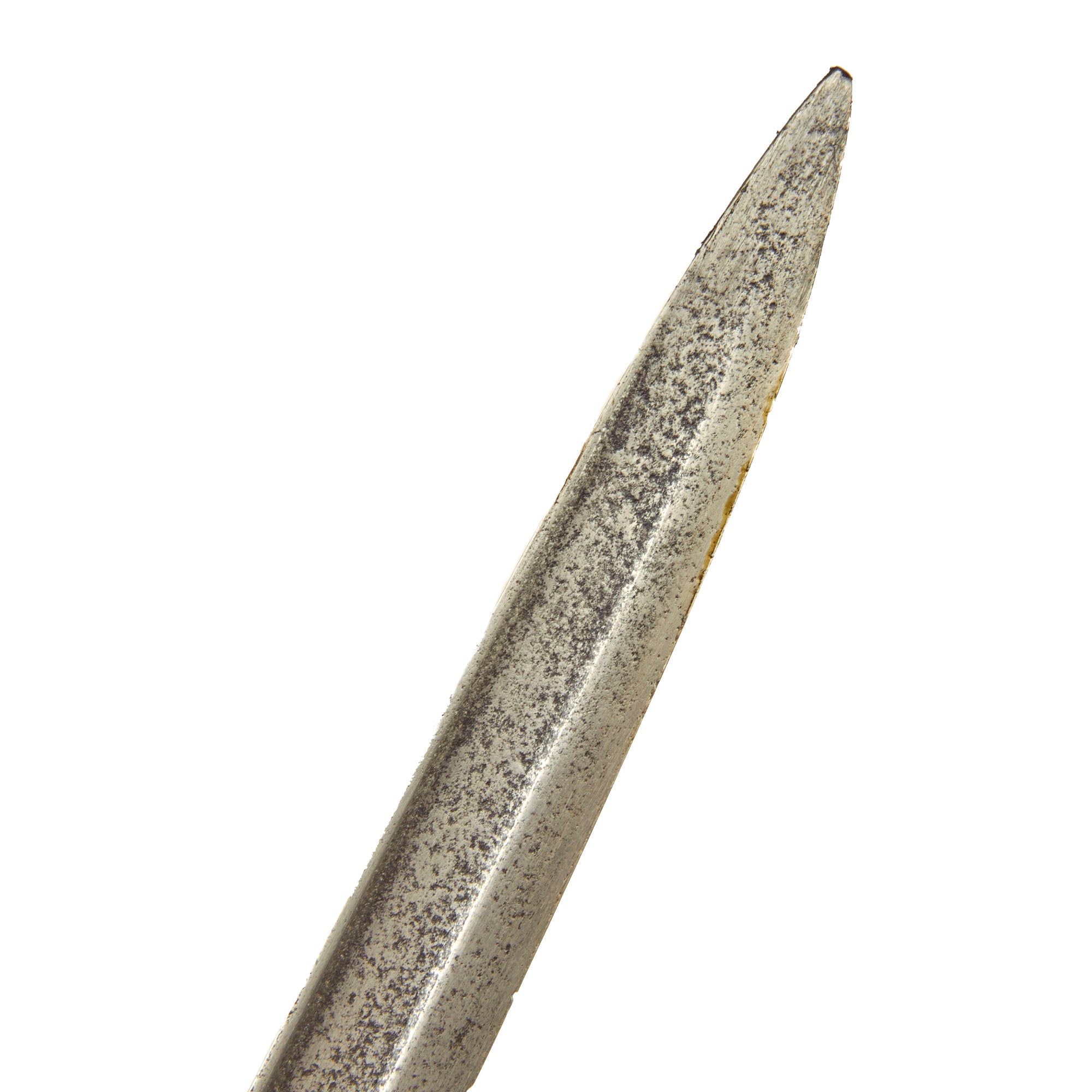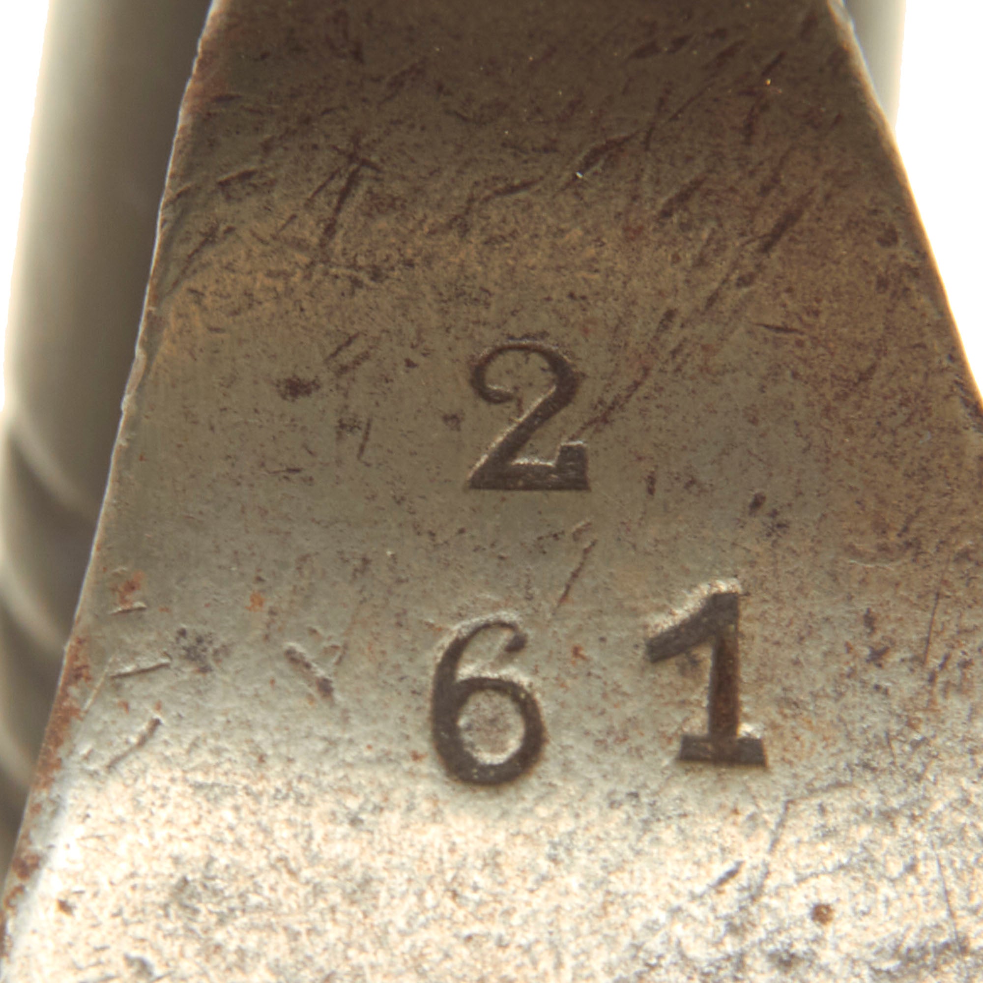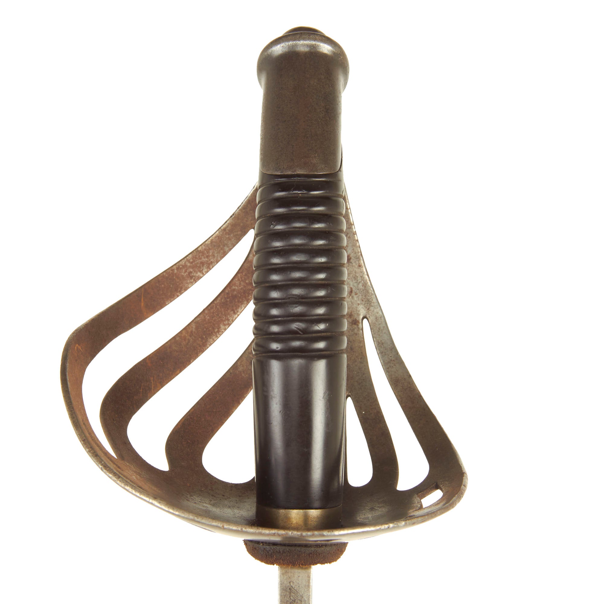 The sword is in really good condition and is presented without any extensive damage other than the usual staining/peppering on the blade. The blade measures approximately 35” in length and does have a few nicks in the edge. The ricasso has a small shield with a star marking in the center which we believe to be of Argentine origin but lack of information has made it difficult in identifying it. The sword comes complete with its original 36” in steel scabbard. The scabbard has no significant damage present but there are a few dents which we believe were made intentionally to better hold the saber.