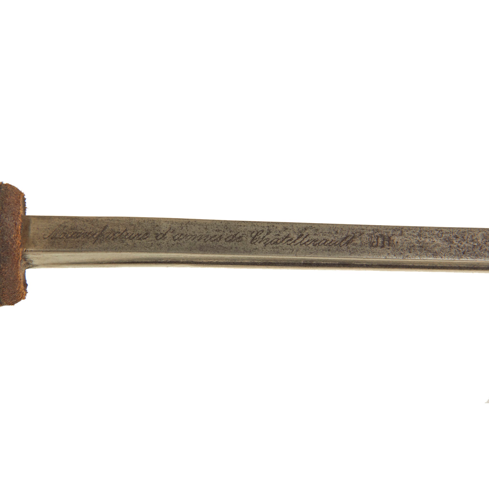 The spine of the saber is marked Manufacture d'Armes de Châtellerault ("Châtellerault Weapons Factory"), often abbreviated to MAC. This was a French state-owned weapons manufacturer in the town of Châtellerault, Vienne. It was created by a royal decree of 14 July 1819 to manufacture swords, then (after 1850) firearms and cannons. Antoine Treuille de Beaulieu in 1840 began to develop the concept of rifled artillery at Châtellerault for the French Army. The Lebel Model 1886 rifle, the first military firearm to use smokeless powder ammunition and the primary French infantry weapon during World War I, was developed and produced here.