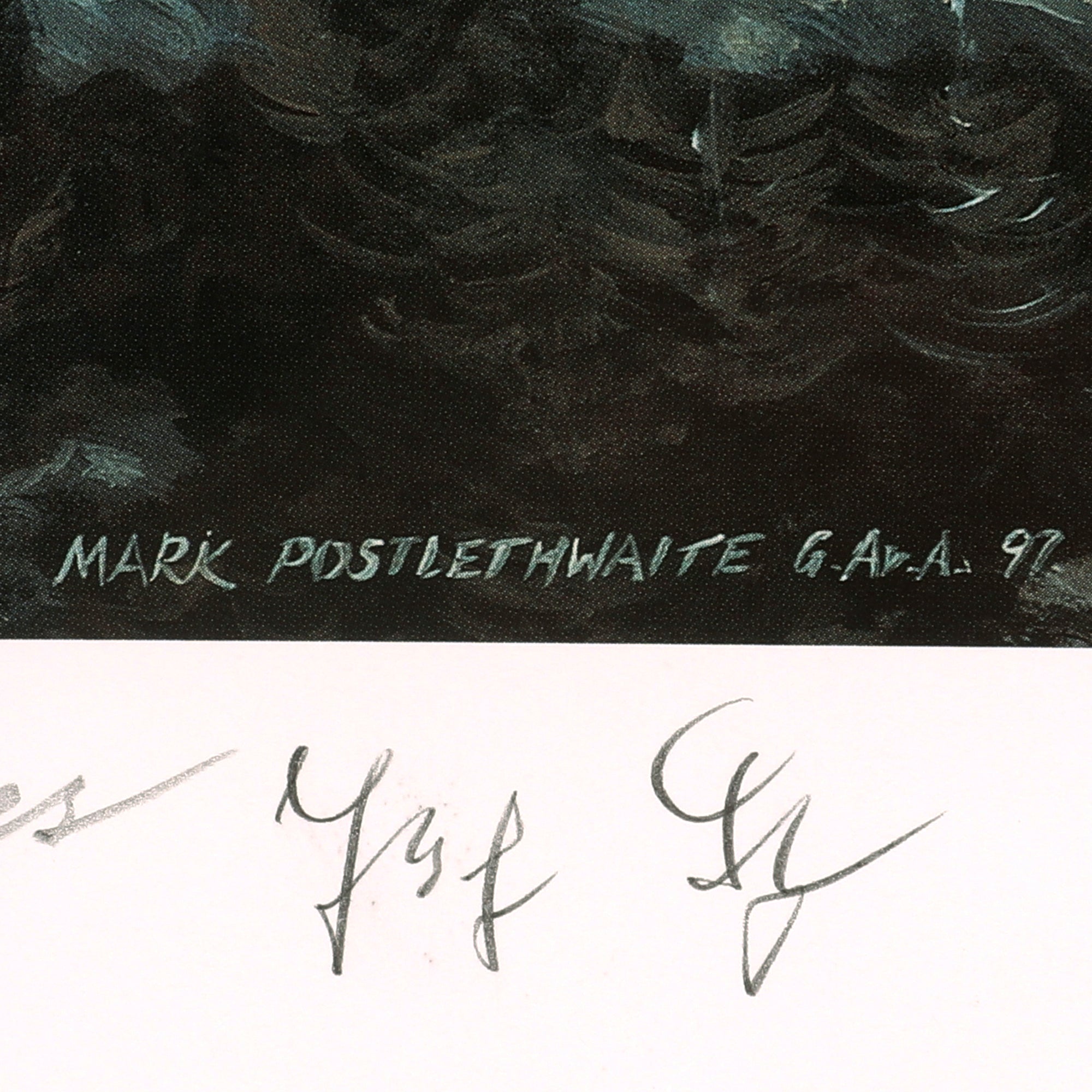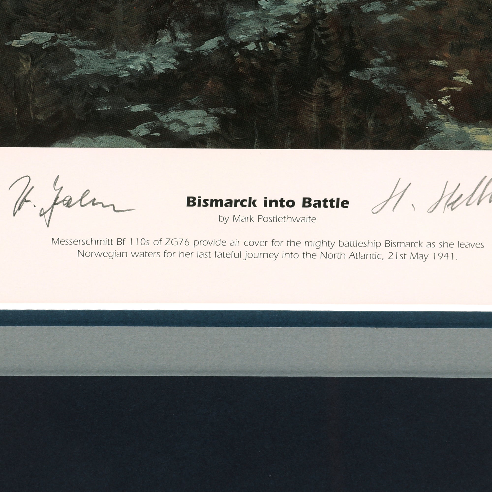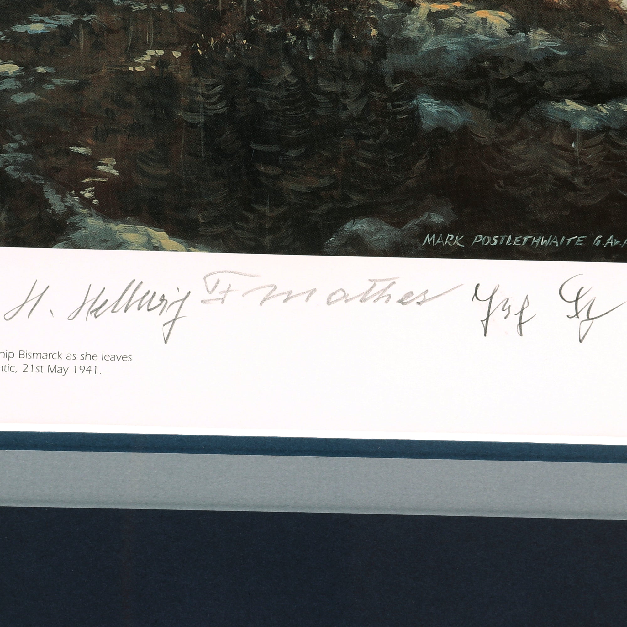 Additionally, the print is signed by artist Mark Postlethwaite on the far right, along with one Me110 Pilot and four of the small band of only 110 crew members who survived the sinking of the Bismarck: