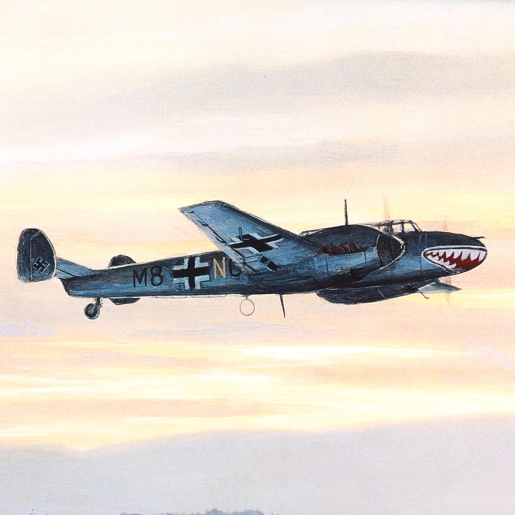 The painting shows the German WWII battleship Bismarck as she leaves Grimstadfjord in Norway, being is escorted by Messerschmitt Bf-110’s of II/ZG 76 based at nearby Herdla. The time is 19:45 hours on 21 May 1941 and the scene is one of tranquility before the battle commences.