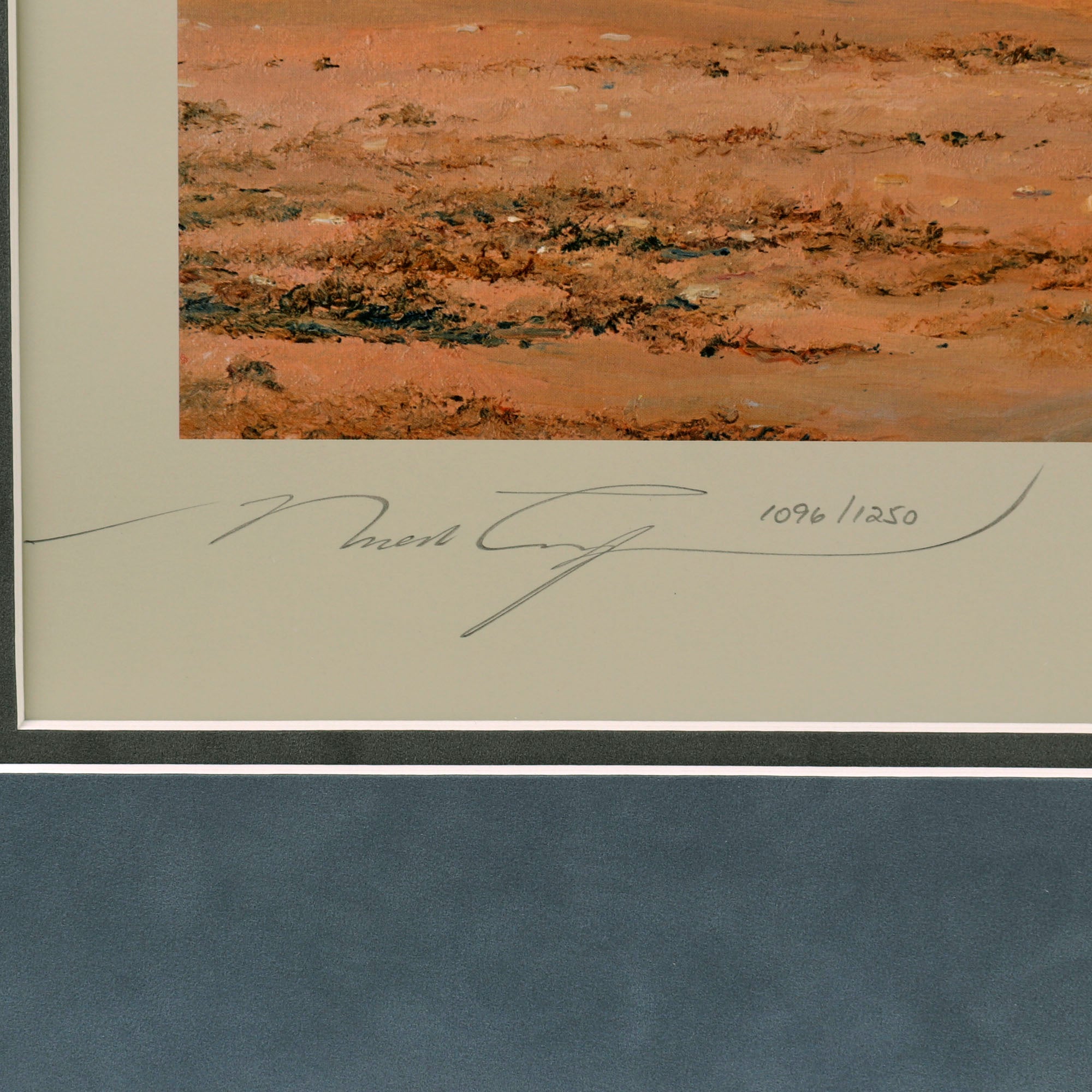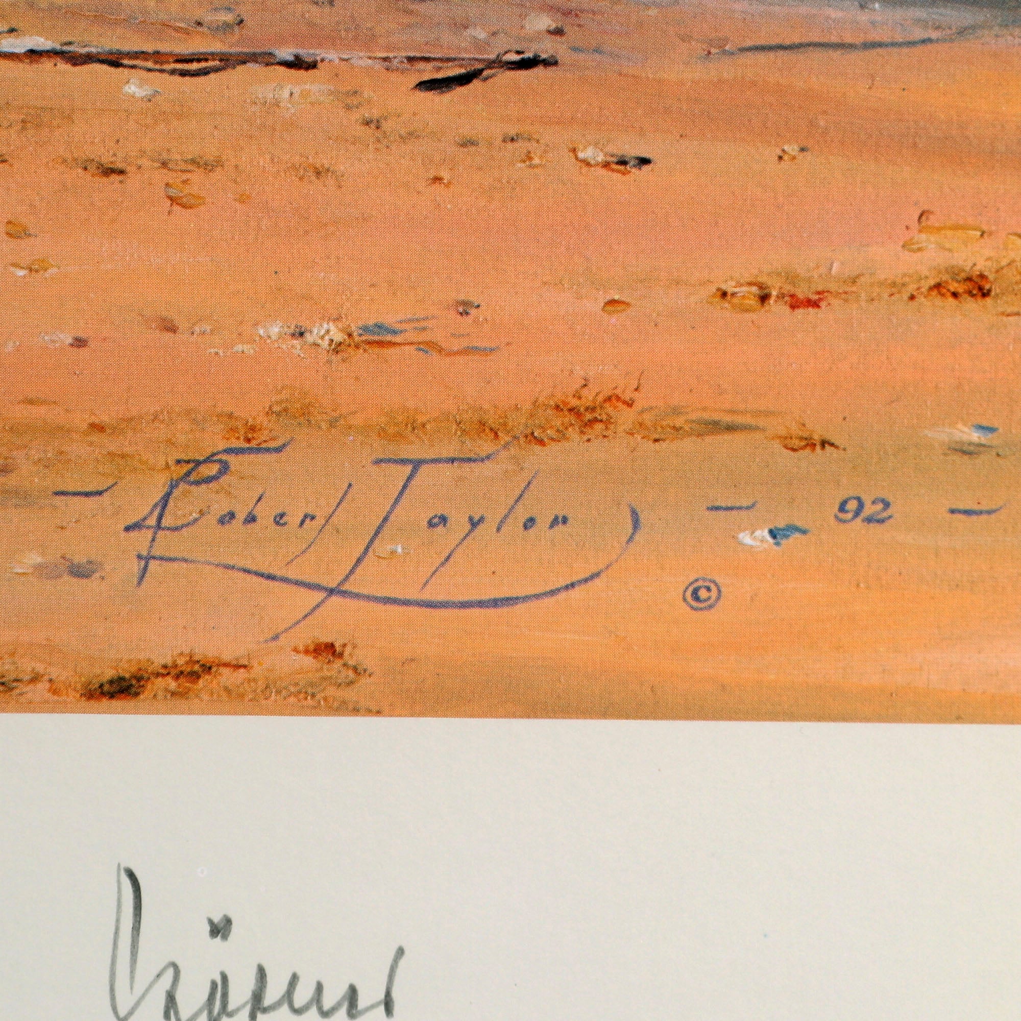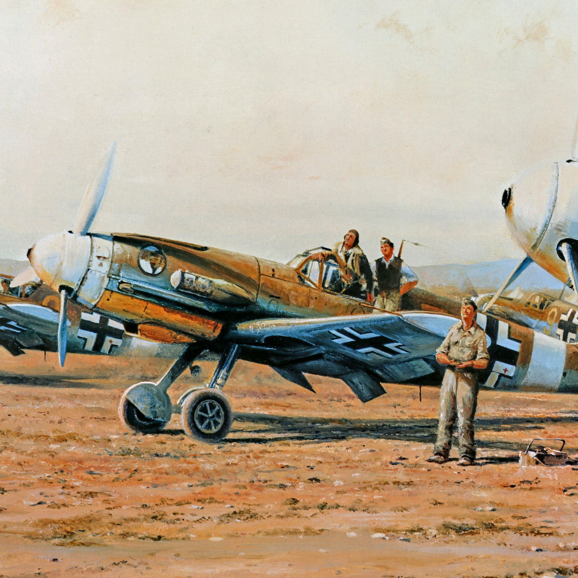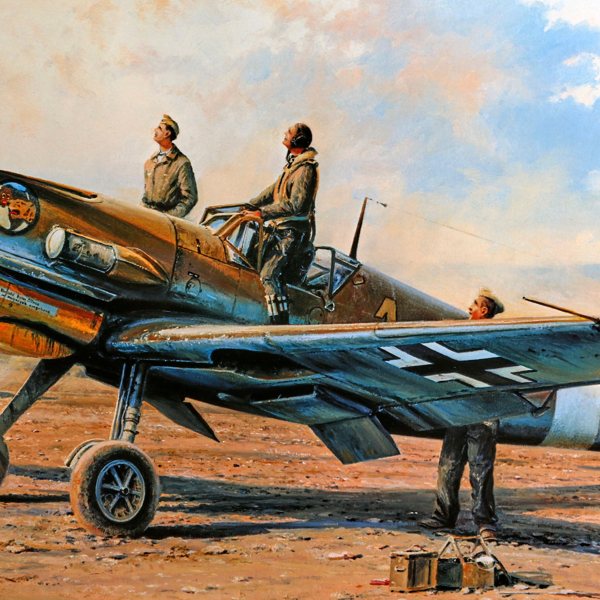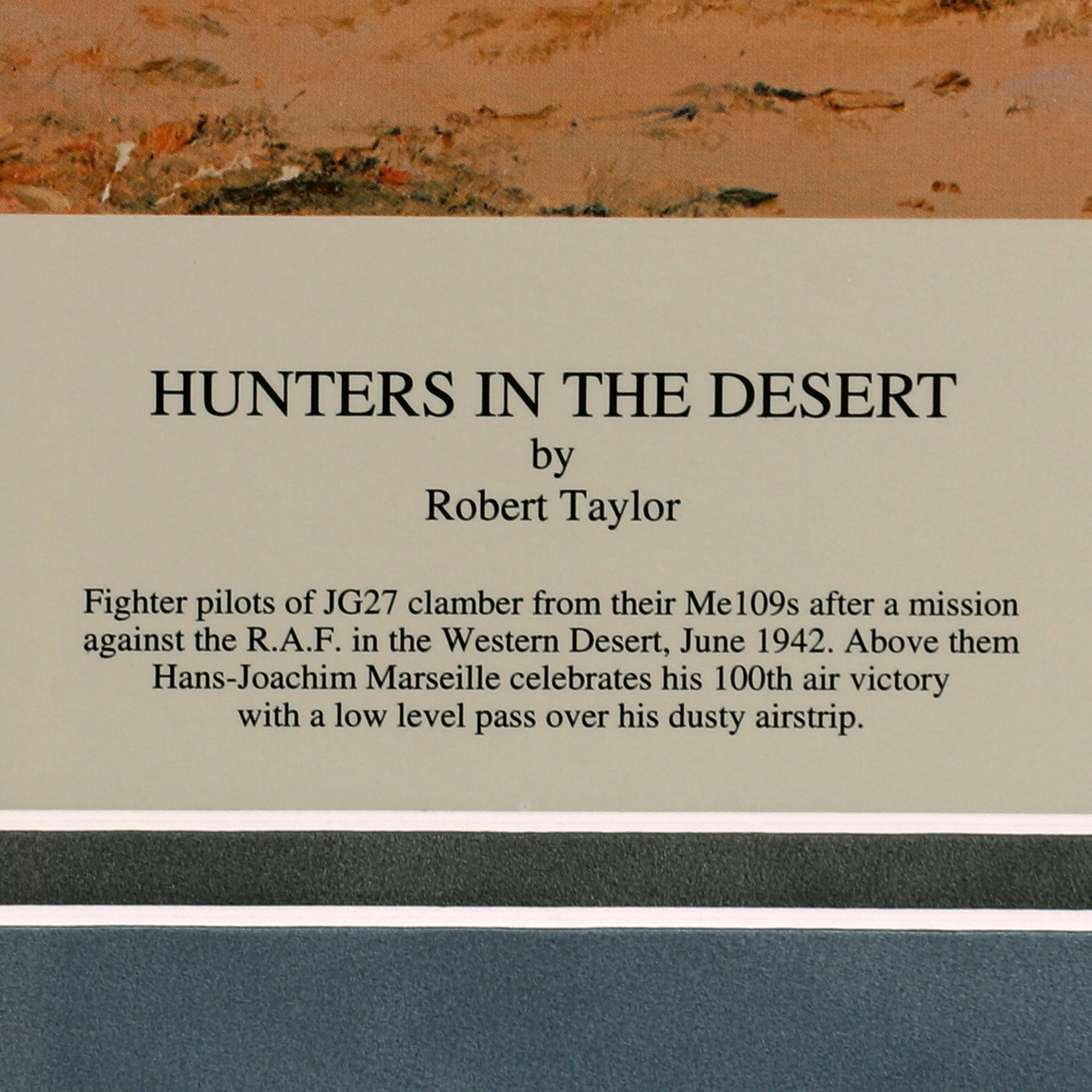 This popular limited edition which is the last in Robert Taylor's long sold-out Protagonist series, records Marseille's jubilant low pass as he returns to his Desert airstrip having just achieved his 100th victory. In the foreground his fellow pilots are seen clambering out of their Me109s having just completed another successful mission. Robert's masterful painting painting brings to life the heat and dust of the Western Desert, the acrid aroma of hot engines and the exhilaration of victory as another combat mission ends.