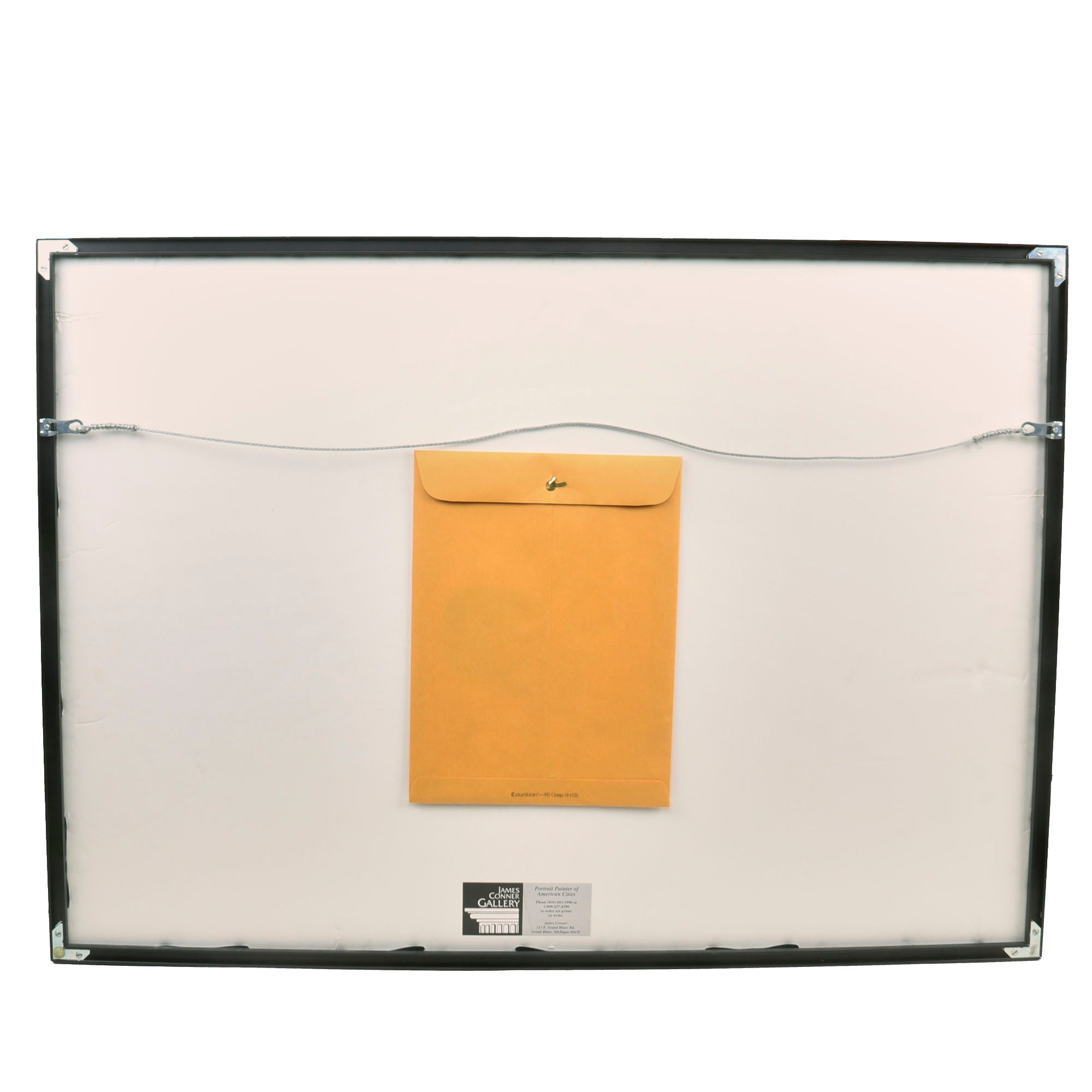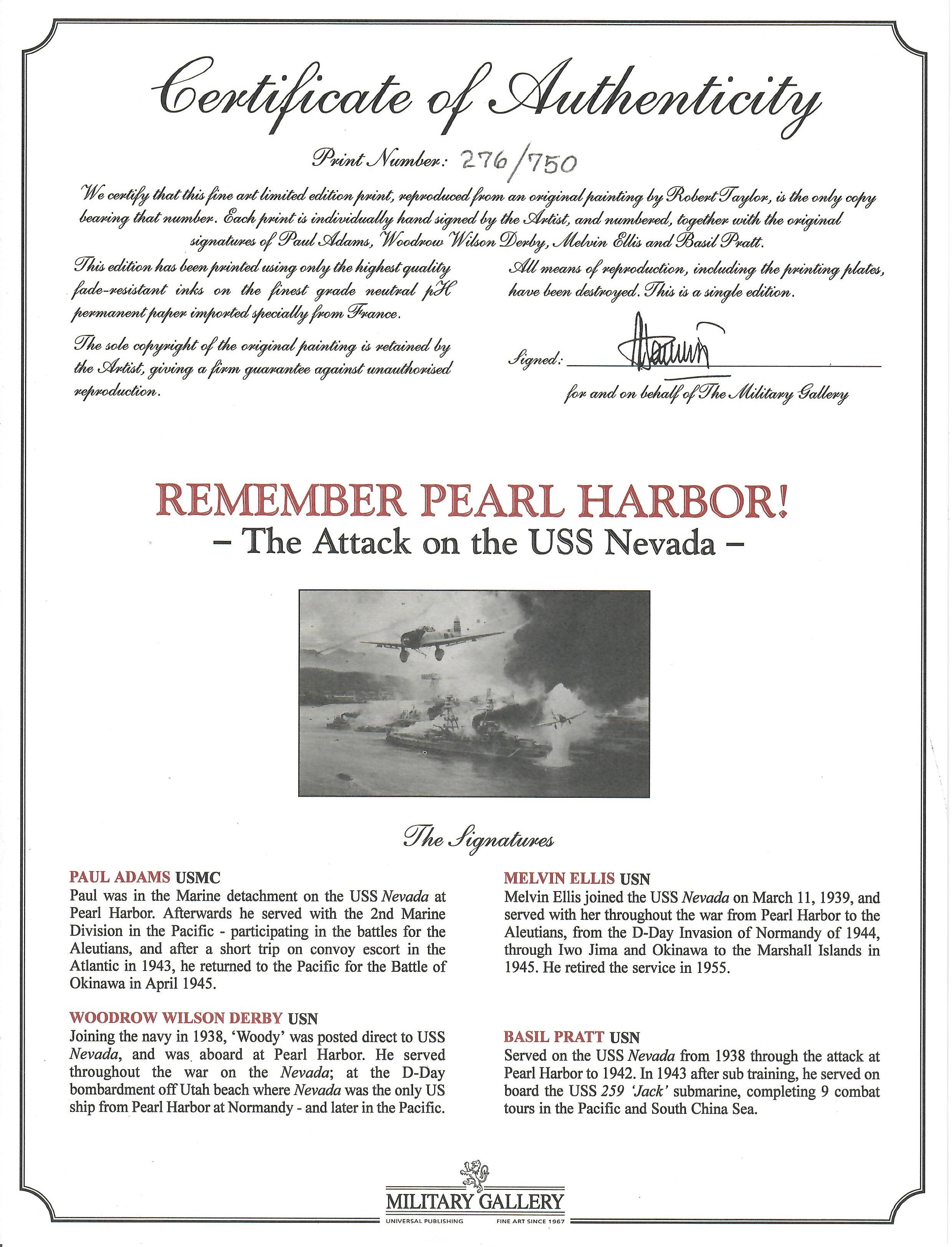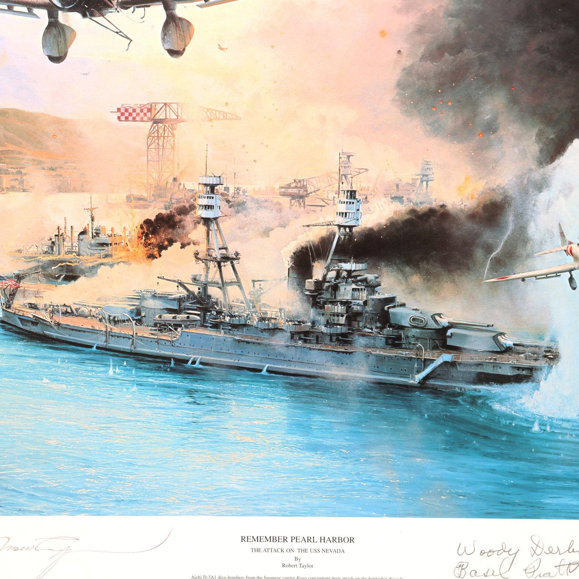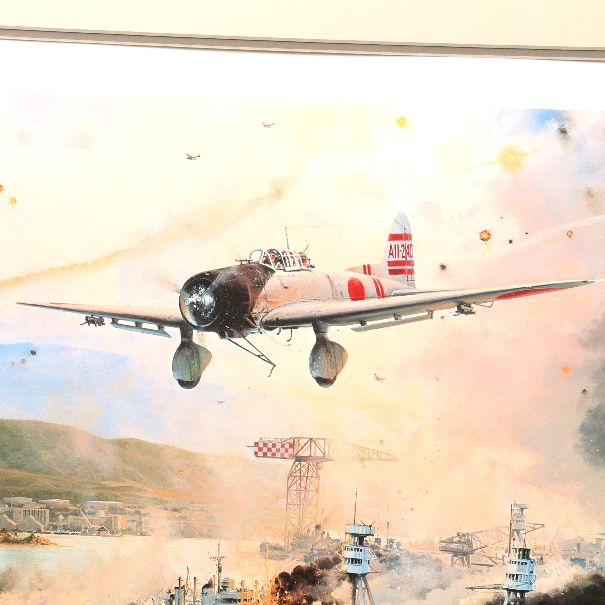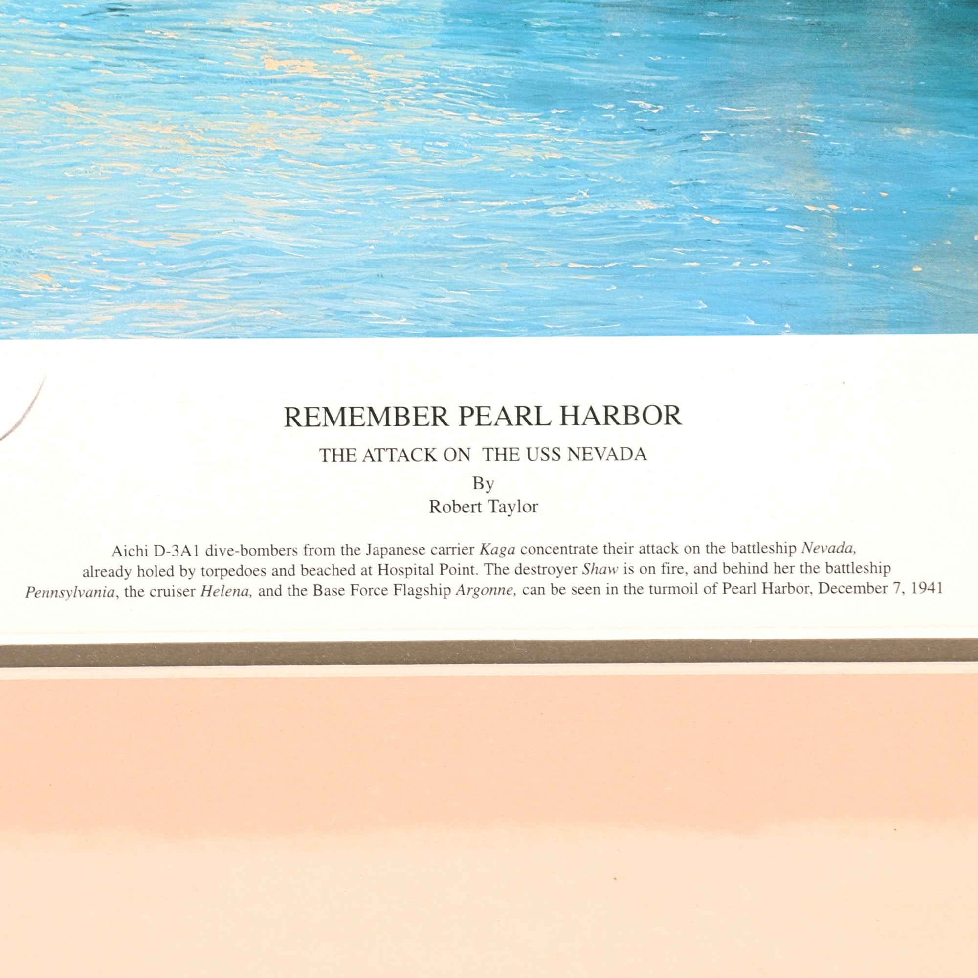 Original Item: Only One Available. This is a lovely framed print of Robert Taylor’s painting Remember Pearl Harbor! The Attack on the USS Nevada, matted and put into a museum grade frame measuring 25½ x 35½”. This is number 276/500 of a run of these prints made for collectors, and will make a fantastic display piece on any wall. The painting is set on December 7th, 1941, during the attack on Pearl Harbor, and depicts a Japanese plane dropping bombs to destroy the USS Nevada.