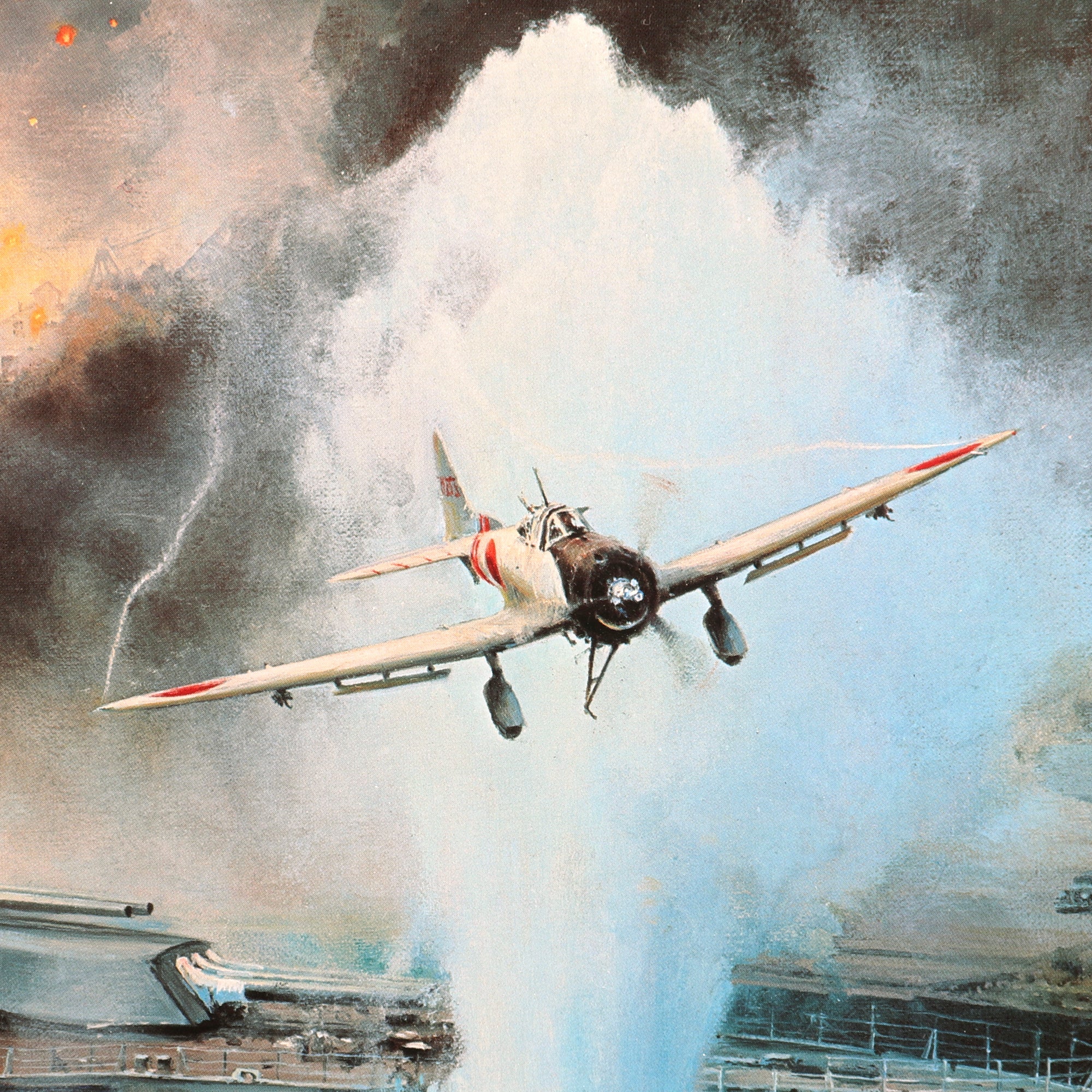 Aichi D-3A1 dive-bombers from the Japanese carrier Kaga concentrate their attack on the battleship Nevada, already holed by torpedoes and beached at Hospital Point. The destroyer Shaw is on fire, and behind her the battleship Pennsylvania, the cruiser Helena, and the Base Force Flagship Argonne, can be seen in the turmoil of Pearl Harbor, December 7, 1941.