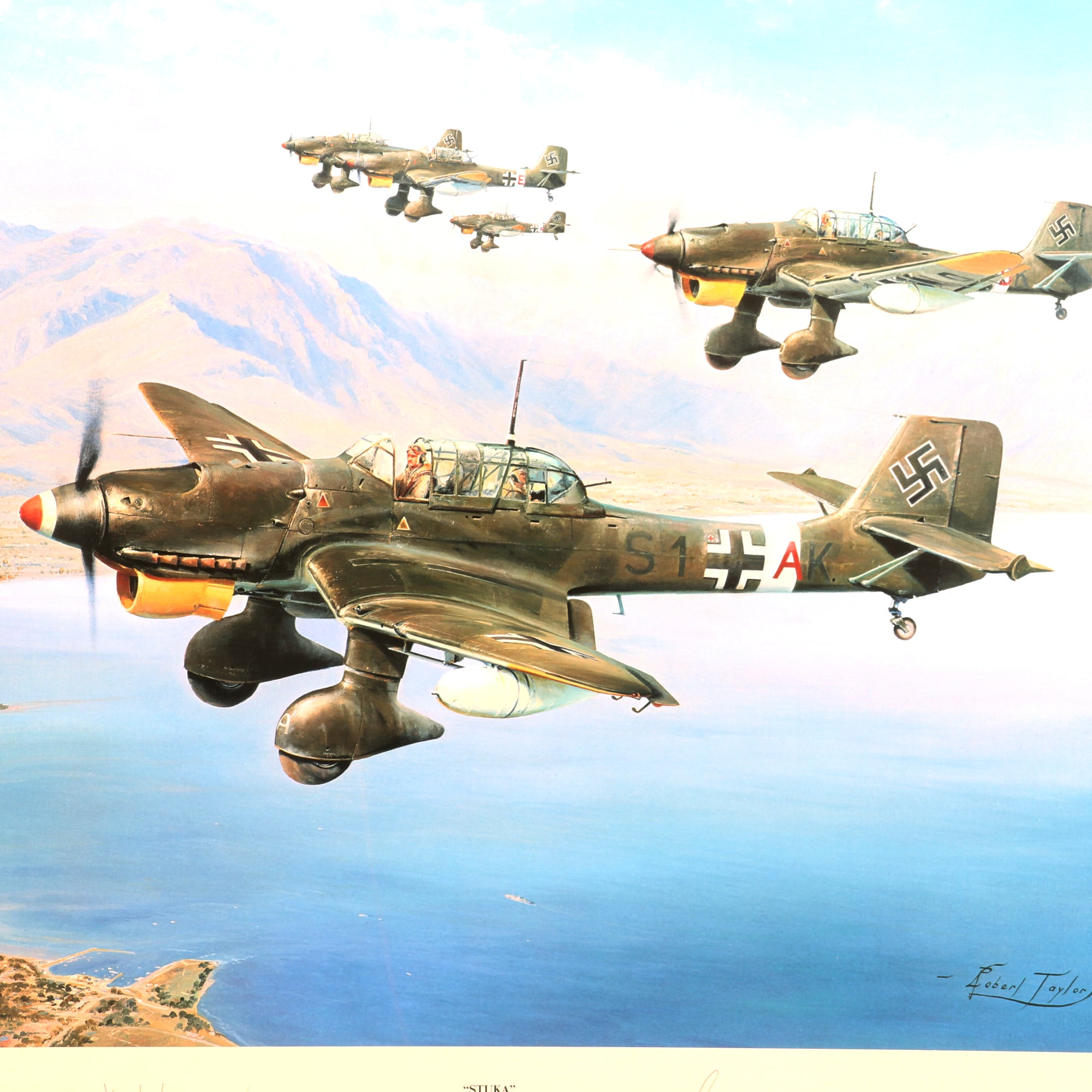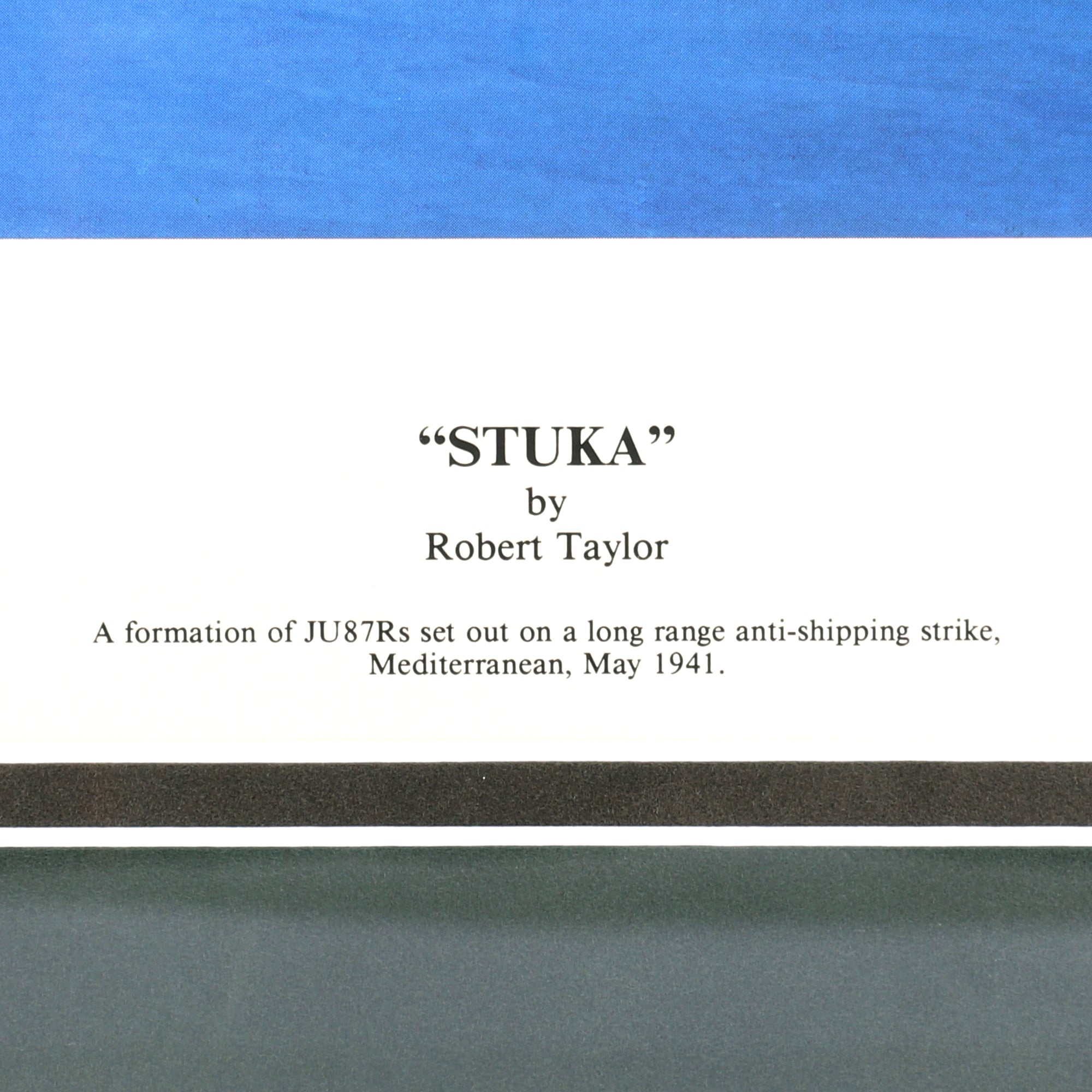 Original Item: Only One Available. This is a lovely framed print of Robert Taylor’s painting "STUKA", matted and put into a museum grade frame measuring 37 ½" x 29 ½". This is number 600/1250 of a run of these prints made for collectors, and will make a fantastic display piece on any wall. The painting is set in May 1941 along the Mediterranean coast, showing a formation of five Junkers Ju 87R "Stuka" dive bombers fitted with extra fuel tanks on a long range bombing run against ship traffic.