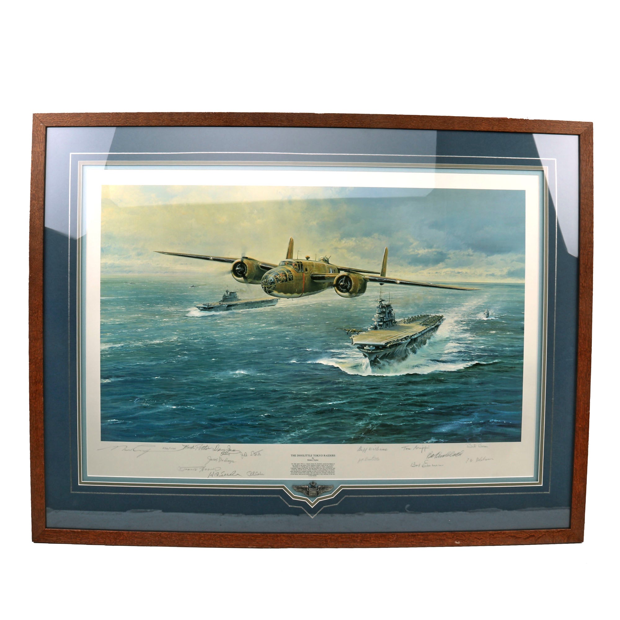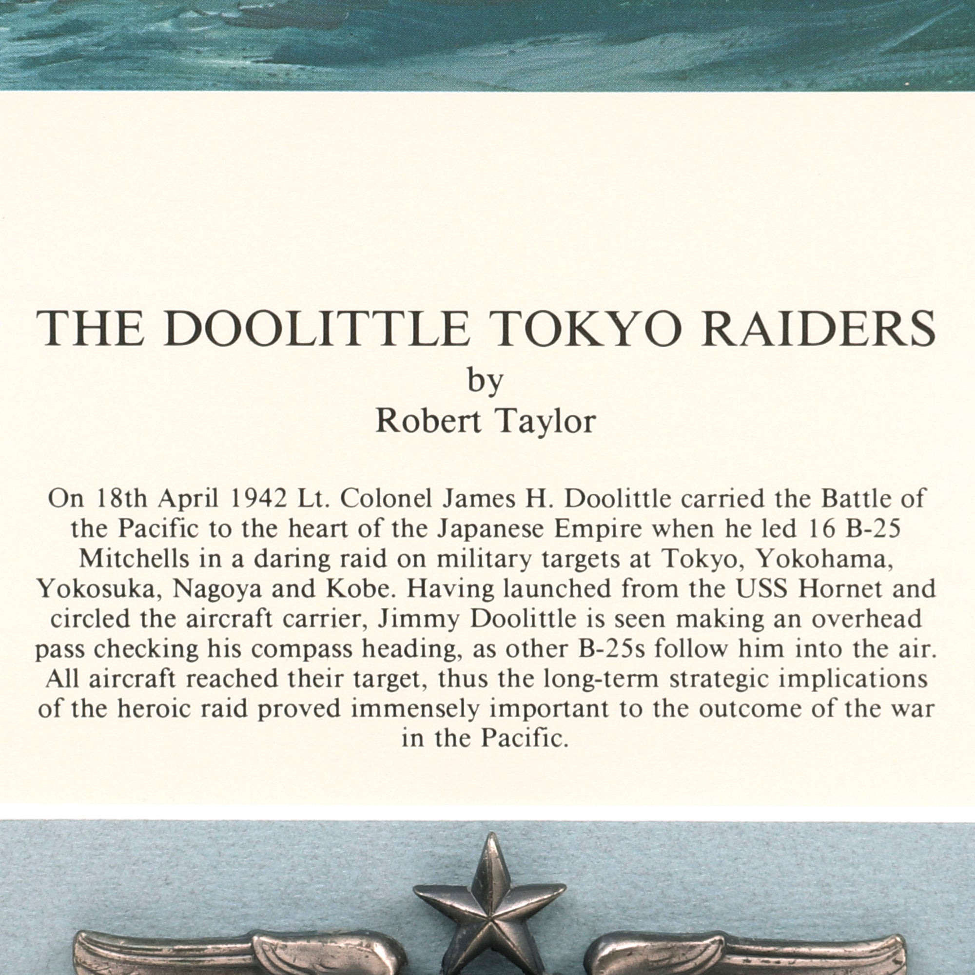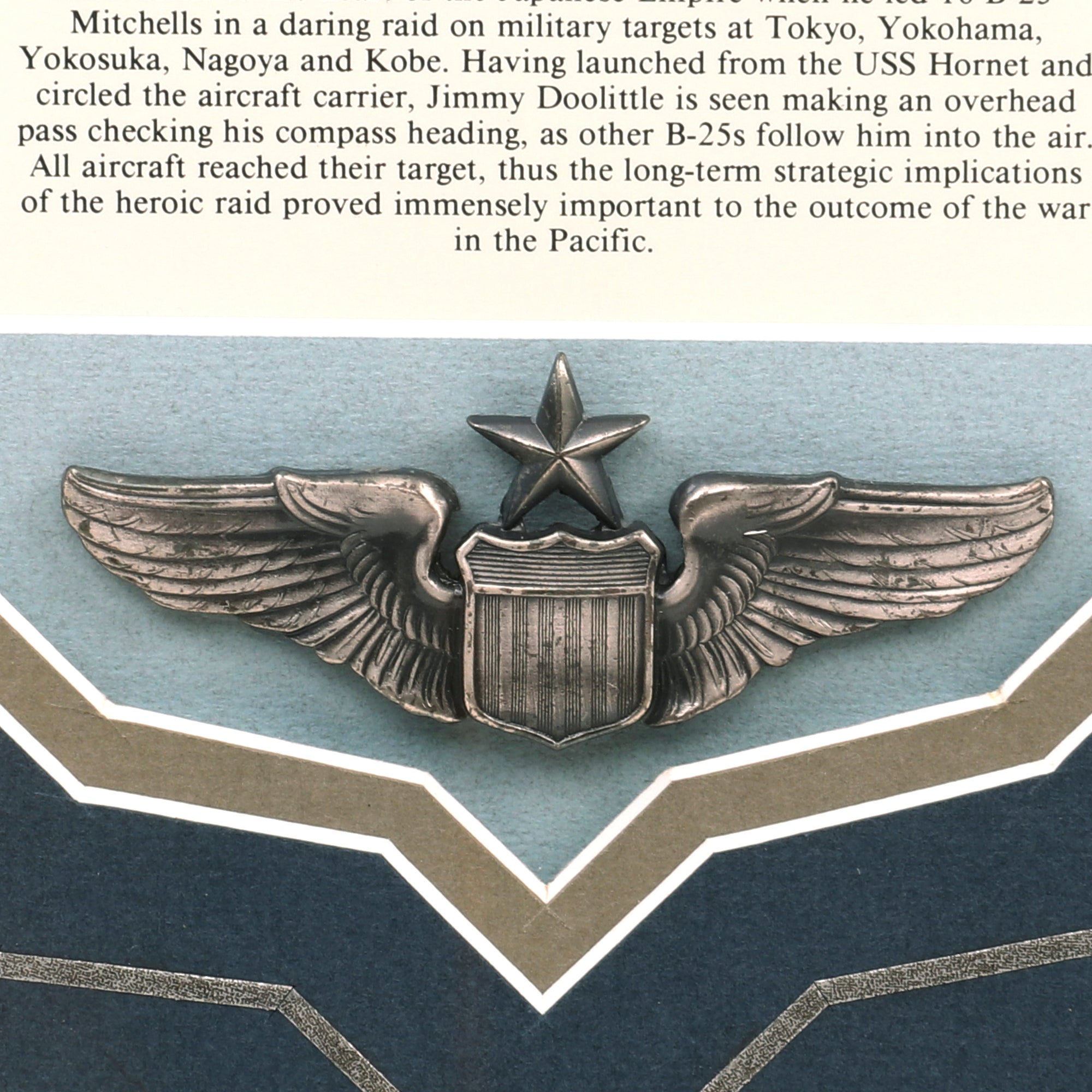 Original Item: One-Of-A-Kind. This is a fantastic piece of WWII history! This is a framed Commemorative print that even has James Doolittle’s signature along with Richard Cole, Henry Potter, and 11 other crewmembers! This print is number 892 of a total of 1000 prints made. The printing plates were intentionally destroyed, so the 1000 that were printed are the only ones in existence. This set also has a great original set of Senior Pilot Wings at the bottom.