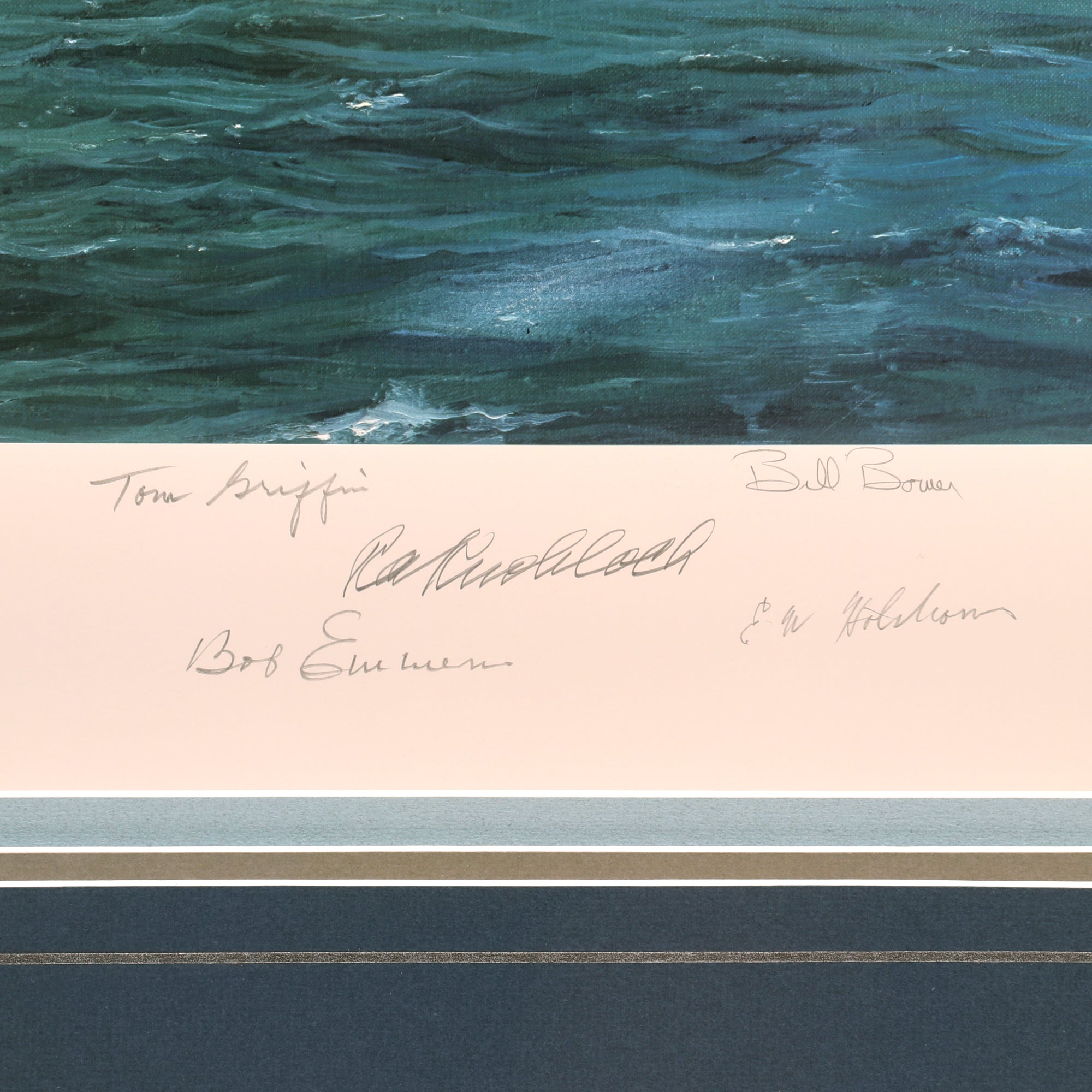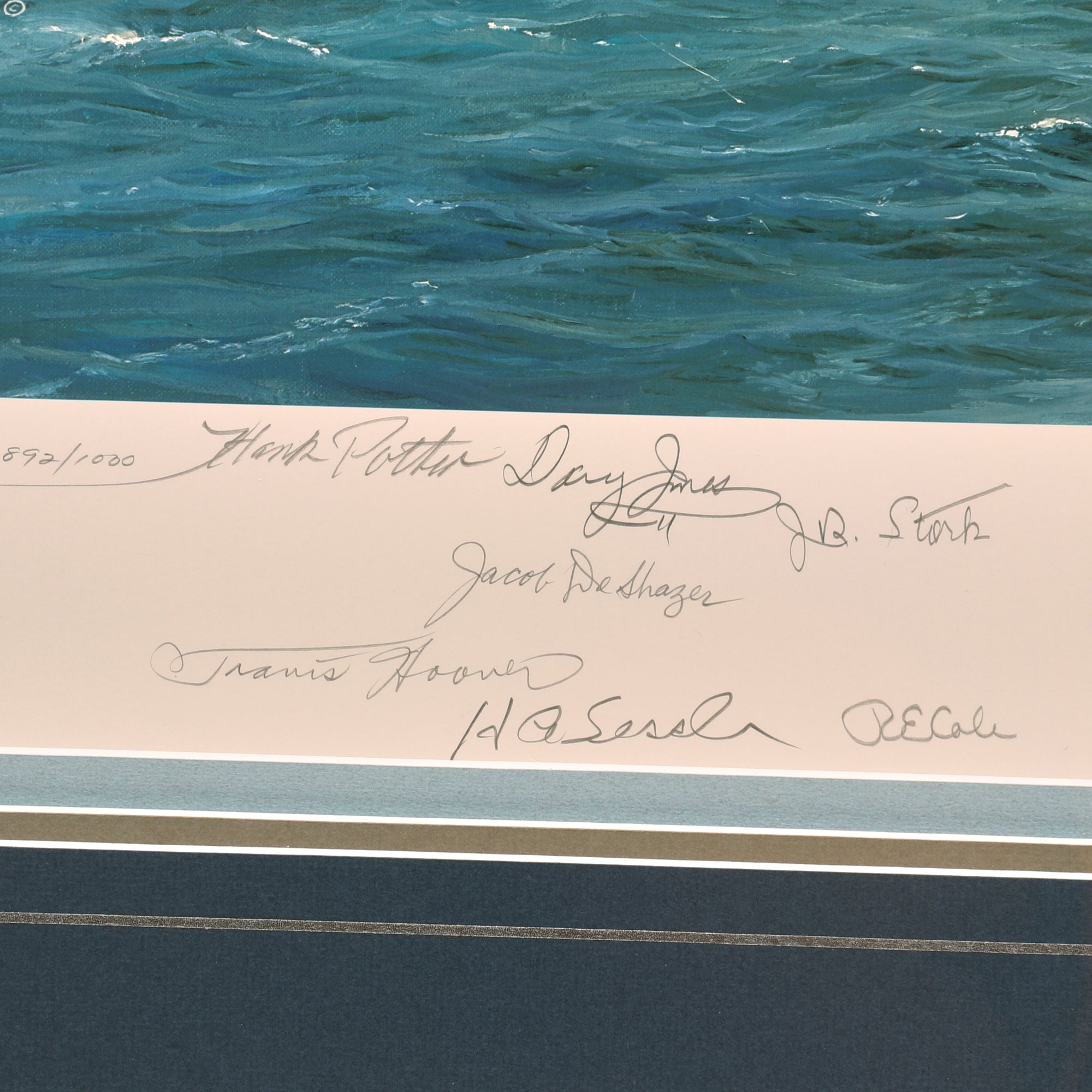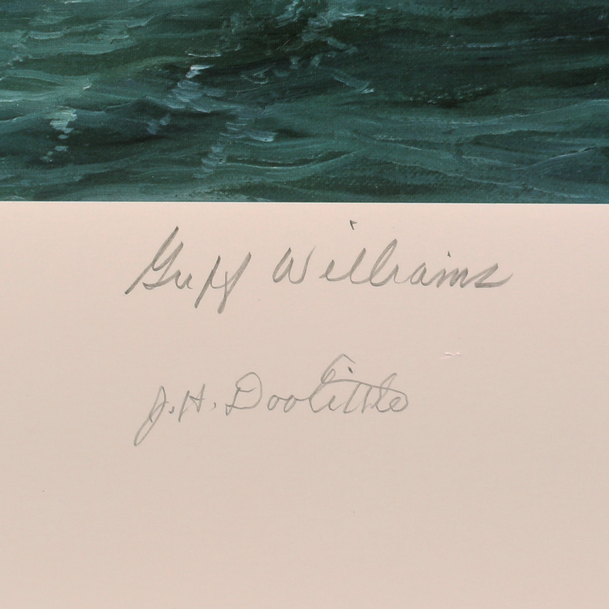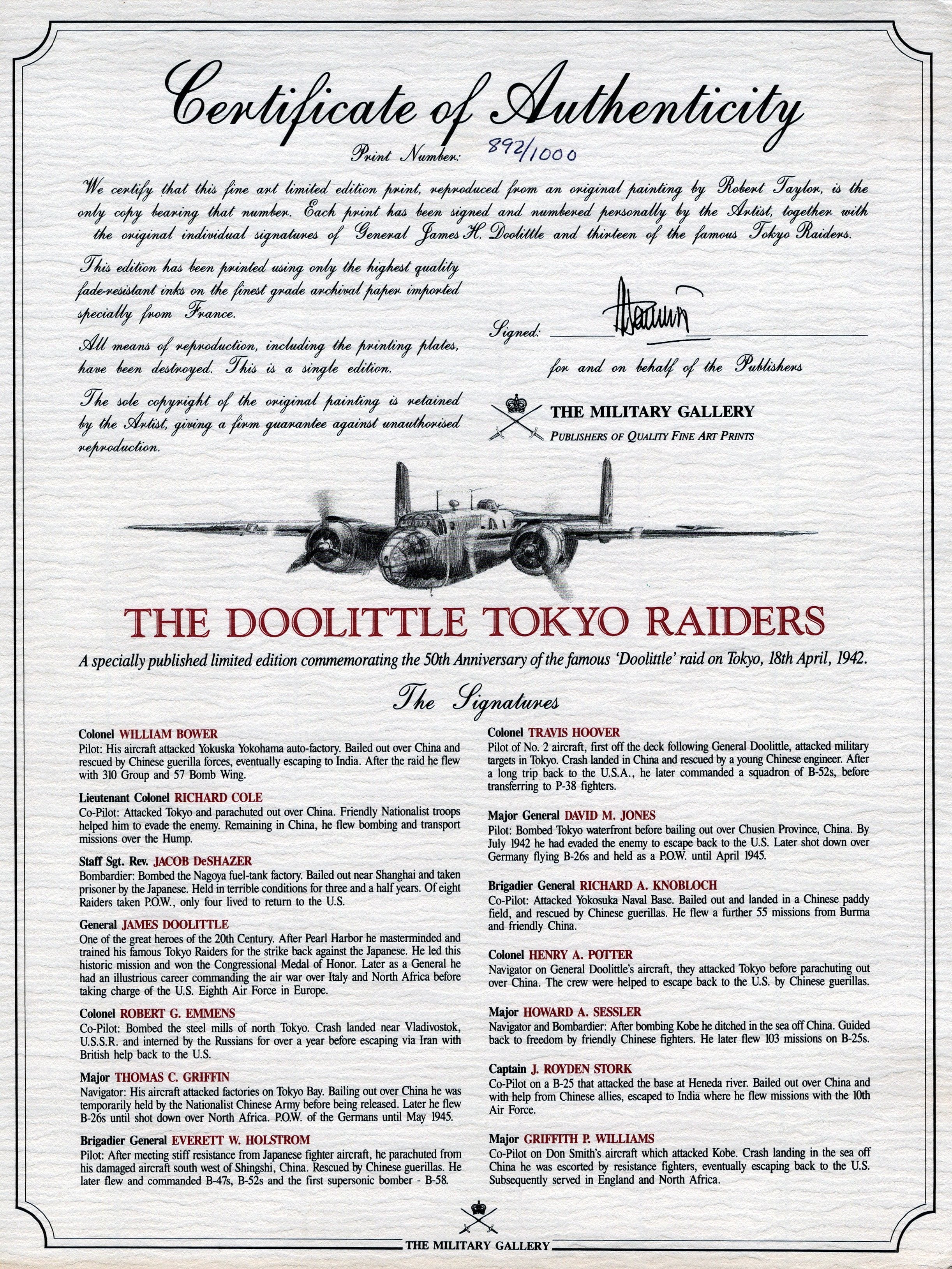 Original Item: One-Of-A-Kind. This is a fantastic piece of WWII history! This is a framed Commemorative print that even has James Doolittle’s signature along with Richard Cole, Henry Potter, and 11 other crewmembers! This print is number 892 of a total of 1000 prints made. The printing plates were intentionally destroyed, so the 1000 that were printed are the only ones in existence. This set also has a great original set of Senior Pilot Wings at the bottom.