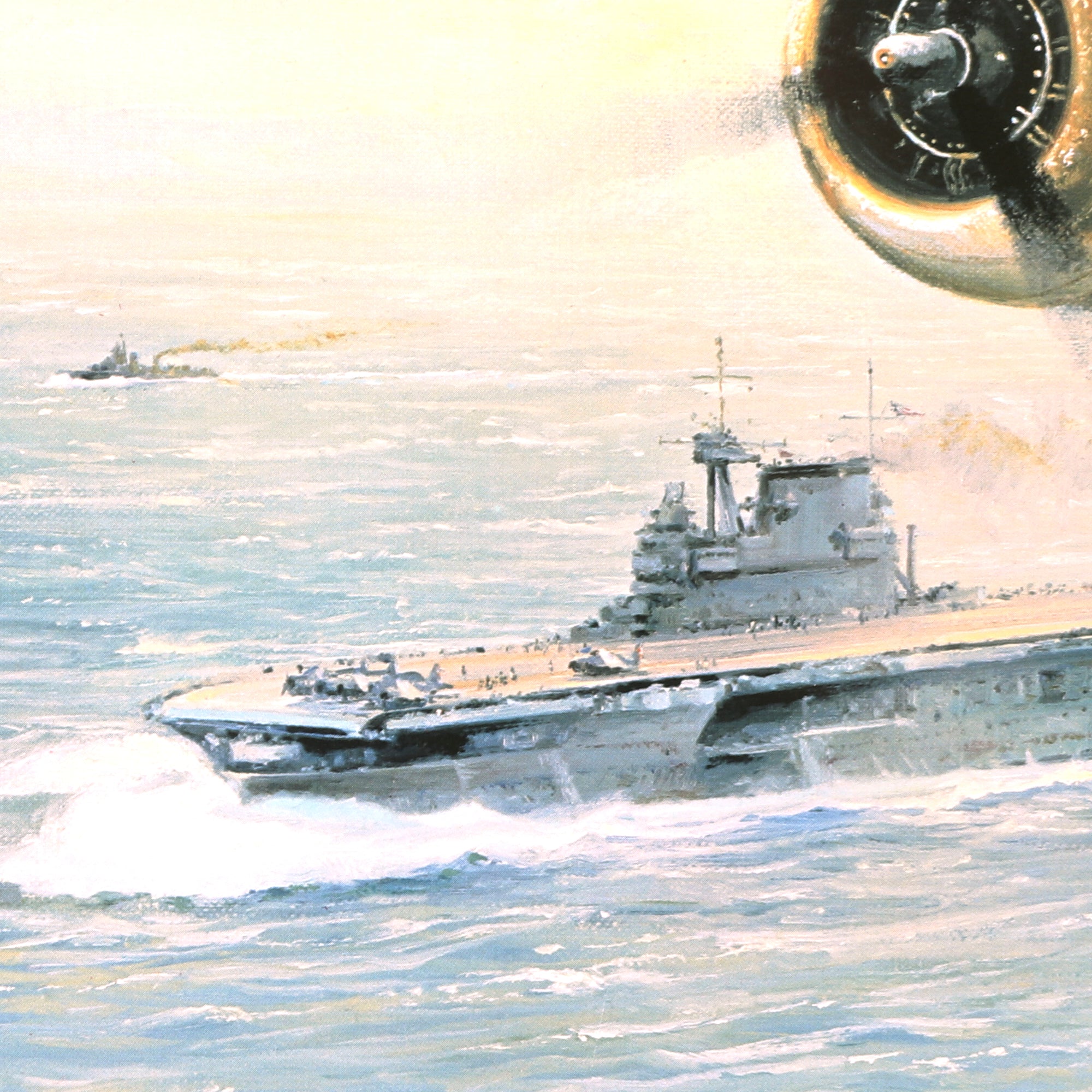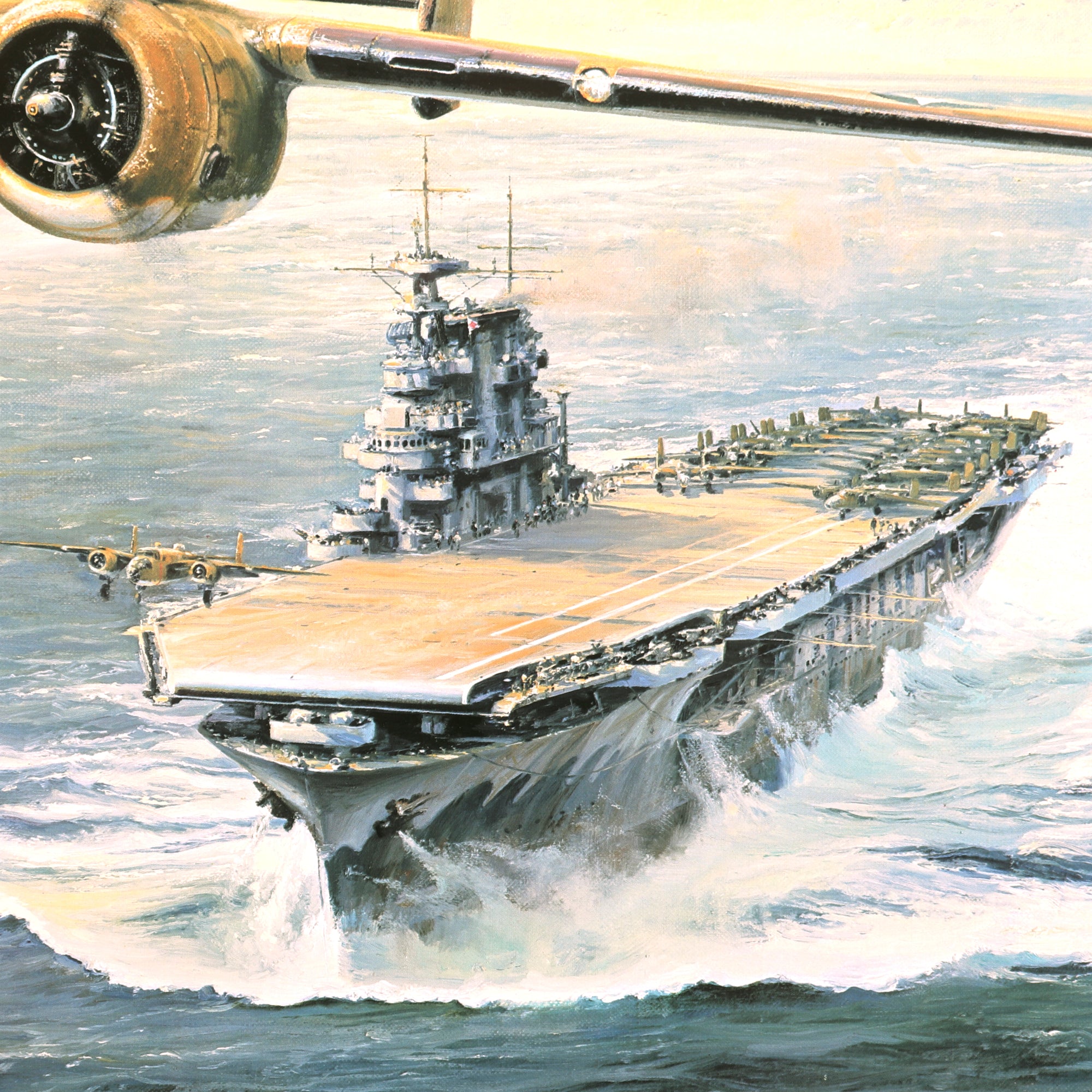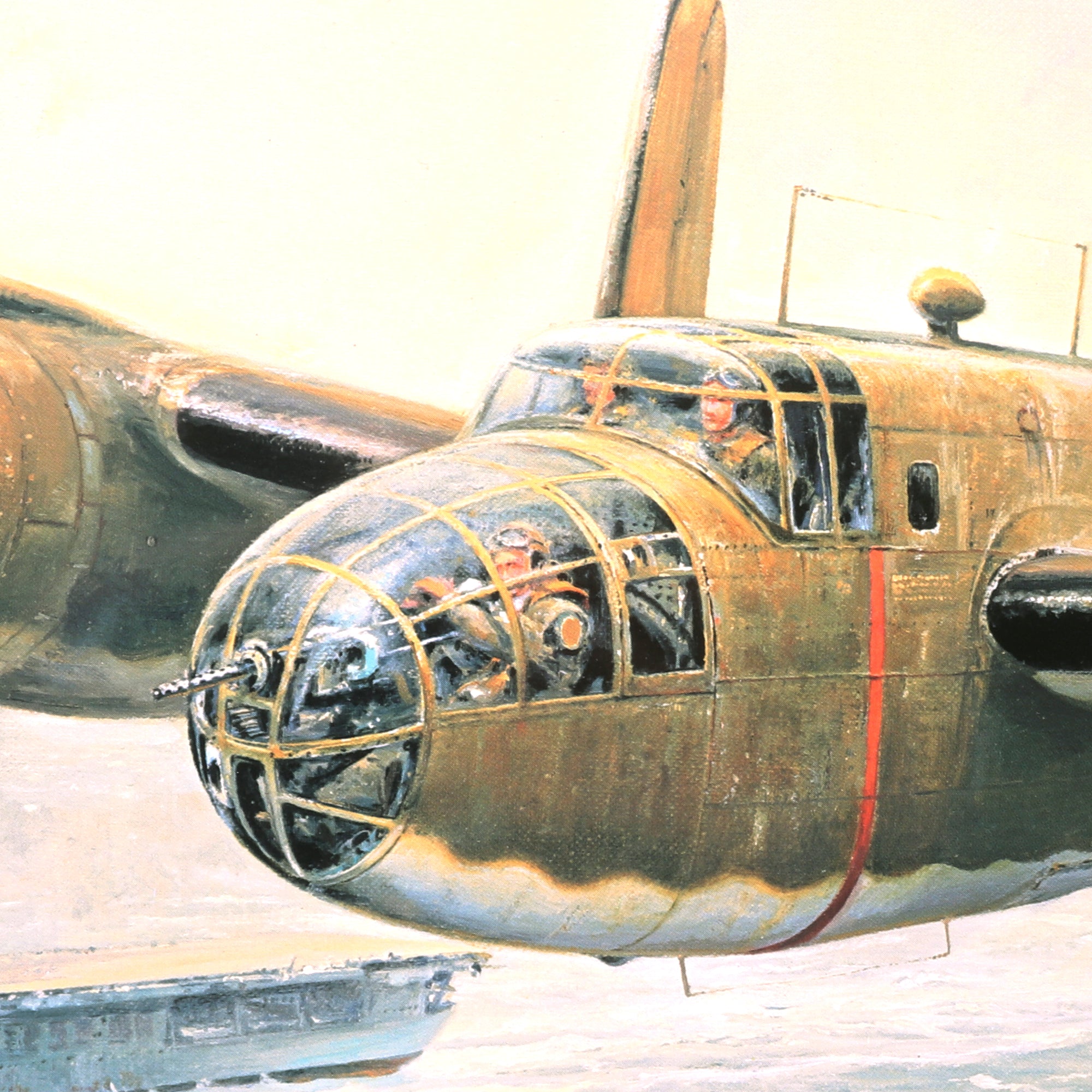 On 18th April 1942 Lt, Colonel James H. Doolittle carried the Battle of the Pacific to the heart of the Japanese Empire when he led 16 B-25 Mitchells in a daring raid on military targets at Tokyo, Yokohama, Yokosuka, Nagoya and Kobe. Having launched from the USs Hornet and circled the aircraft carrier, Jimmy Doolittle is seen making an overhead pass checking his compass heading, as other B-25s follow him into the air. All aircraft reached their target, thus the long-term strategic implications of the heroic raid proved immensely important to the outcome of the war in the Pacific.
