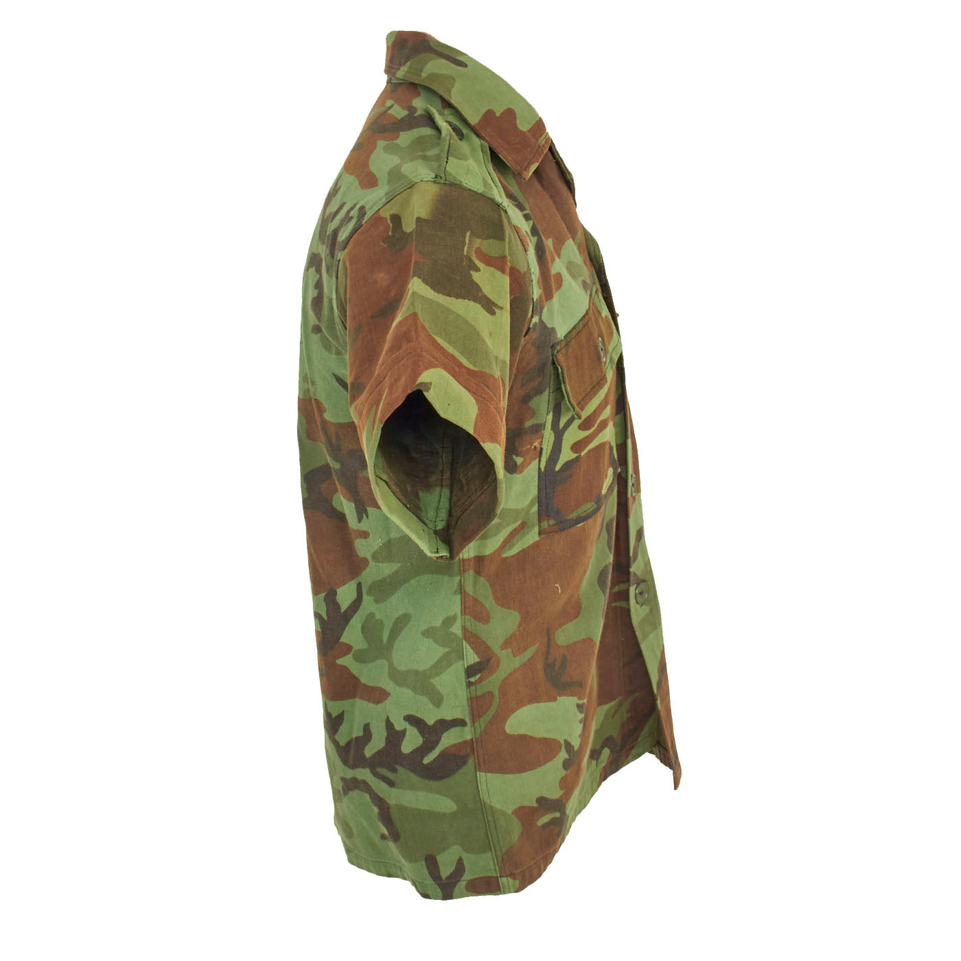 This set is the earlier variation with two chest pockets instead of the later four pockets. The shirt has been field modified to having truncated sleeves, which makes sense for a uniform worn in a hot tropical environment. All buttons are present as is the original ink stamp on the inside of the shirt.