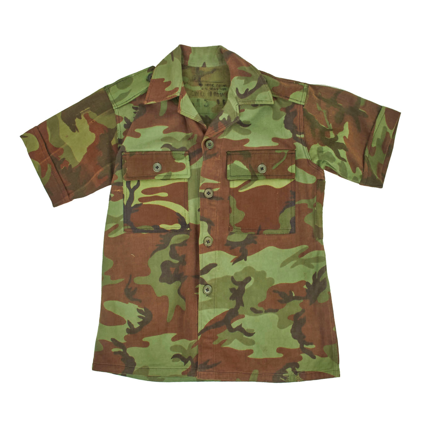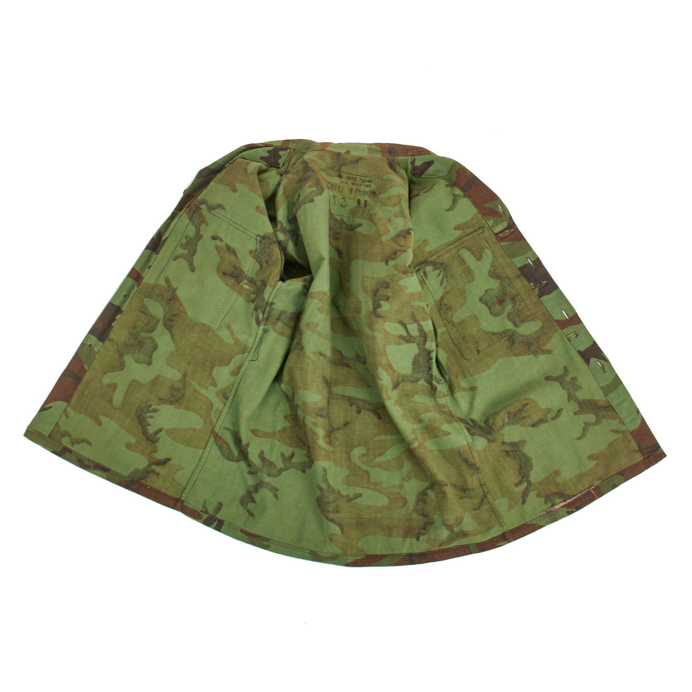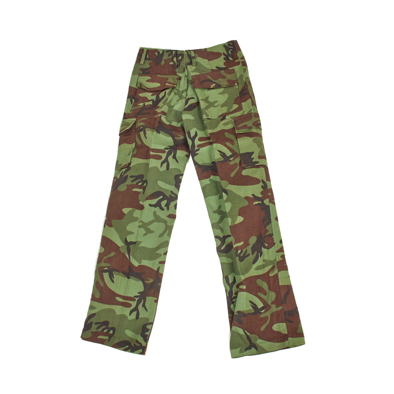 Also introduced into ARVN service around 1965, a variation of the US m1948 ERDL pattern much like this one and was exclusively printed on heavy cotton sateen fabric and probably originated in the United States. This set however has very faint Vietnamese Quartermaster stampings present. Tested by the US government in the early 1960s, the design was never adopted and surplus quantities of the fabric were later donated to the South Vietnamese government. The blend of colors, medium brown and olive green organic shapes with black "branches" on a yellowish-green base, had a tendency to blend together at a distance, lending to this pattern the collector's nickname "invisible ERDL." A majority of these uniforms were worn by the Vietnamese Rangers or Biệt Ðộng Quân.