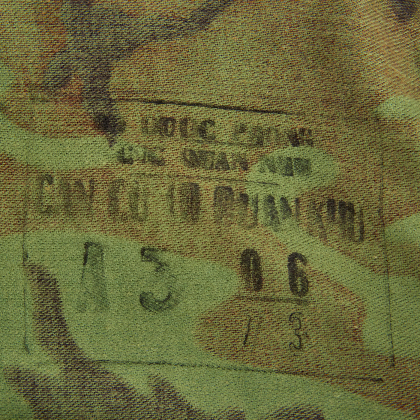 This "ARVN leaf" or "Airborne leaf" pattern (sometimes referred to as BDQ, for Biệt Ðộng Quân, the Vietnamese Rangers) has the same mid-brown & grass green organic shapes with black "branches" on a lime green background as US m1948 ERDL. The ARVN version was initially printed on medium or heavy weight sateen fabric like this set, but as this faded quickly after a few washings it was later produced in lighter weight cotton poplin (see below). The pattern replaced the earlier "pinks" or “bloodcake” within the Airborne Regiments, and was commonly issued to ARVN Ranger (BDQ) units as well.