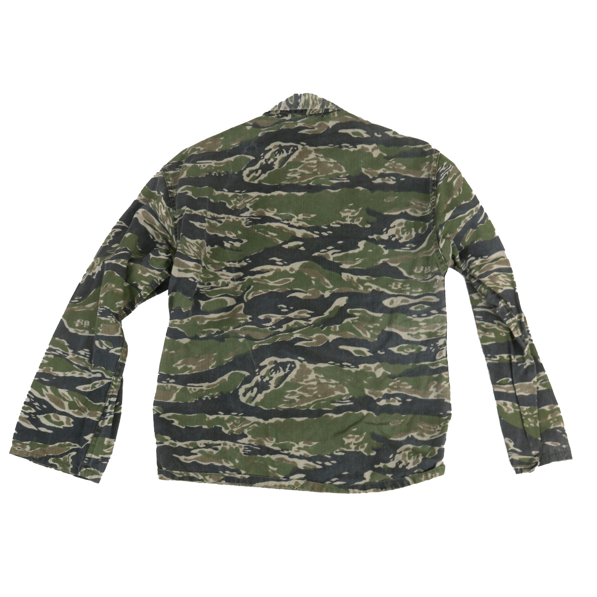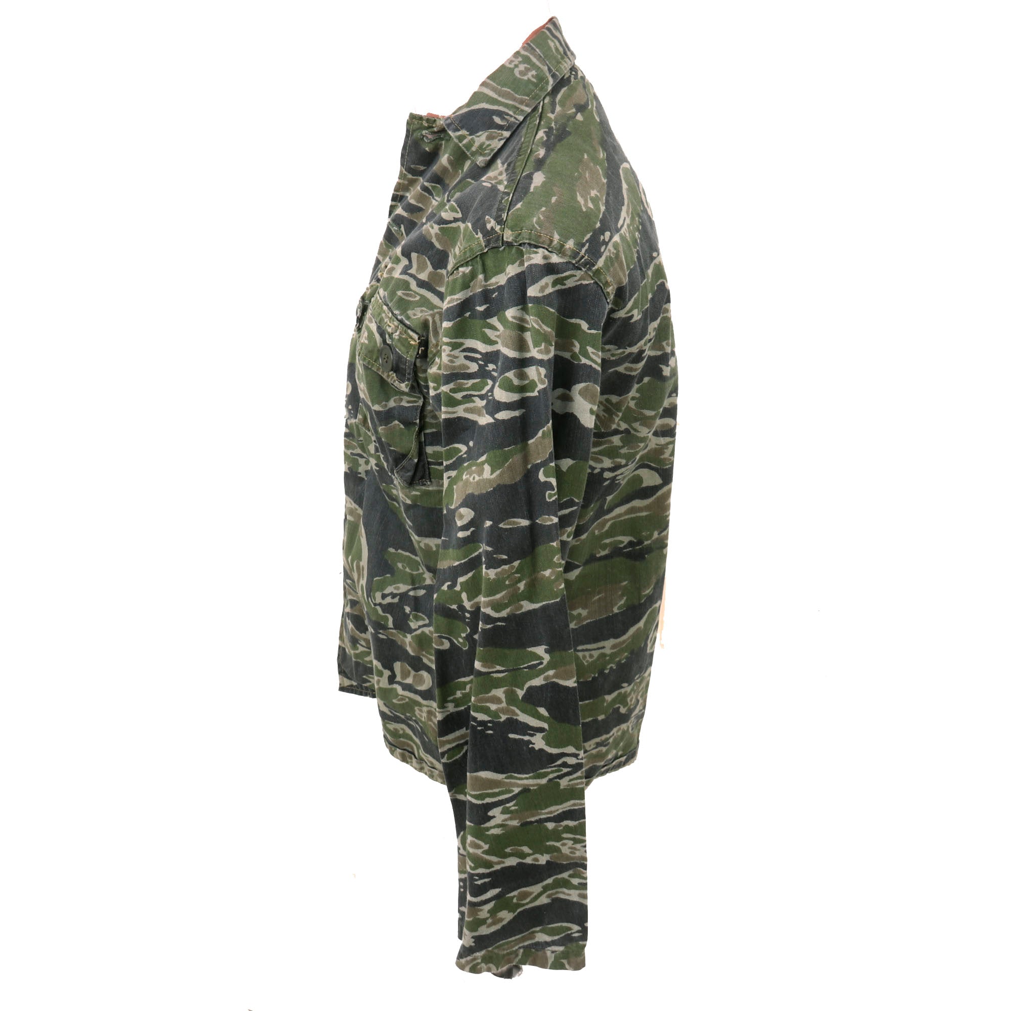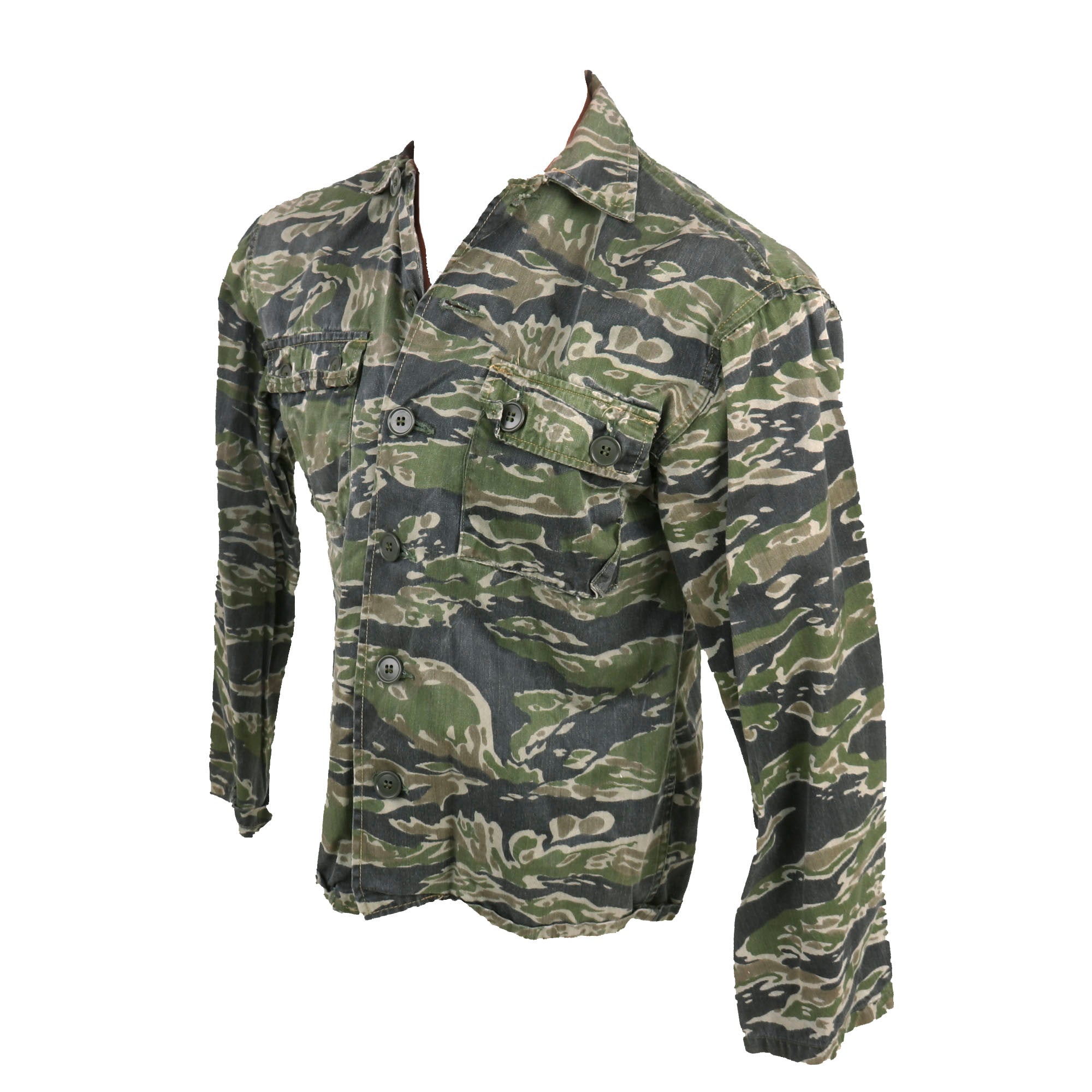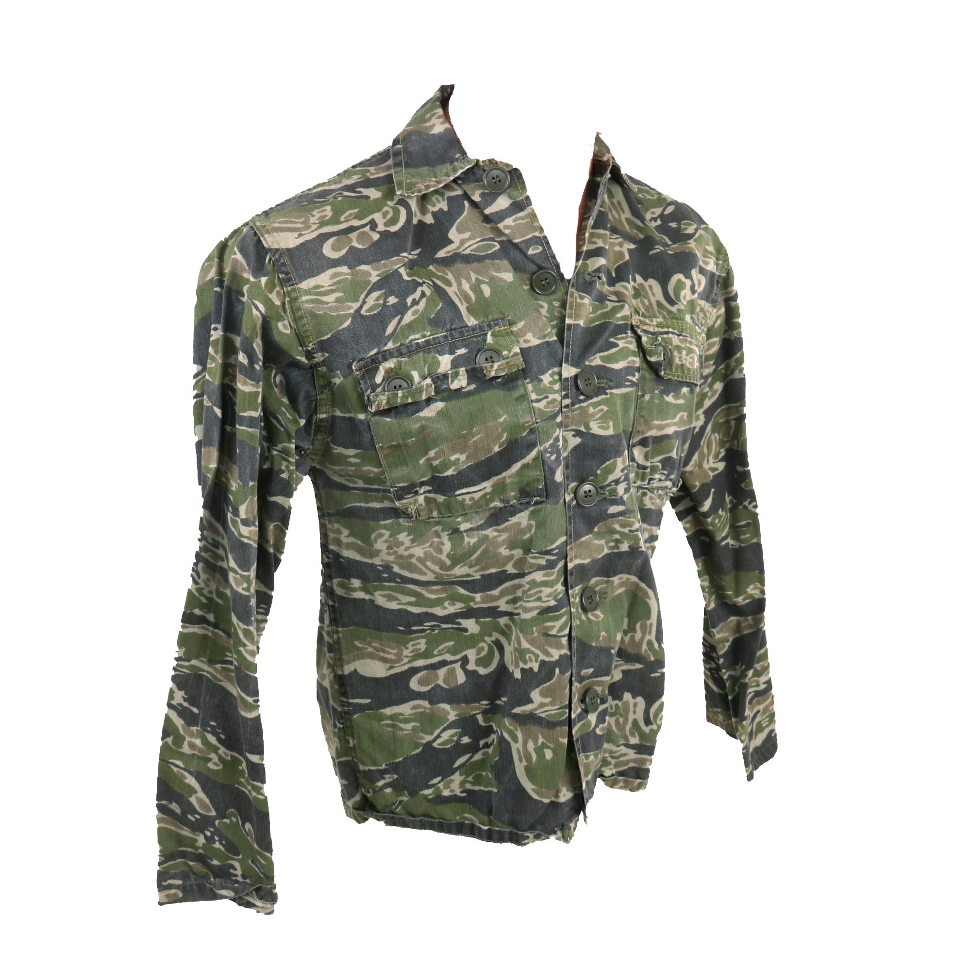 Original Items: Only One Set Available. This is an excellent example of a set of service used tiger stripe fatigues. They are in very good display condition, perfect for an “in the field” type of display! It is easy to understand how this pattern got its name from its bold black stripes, which mimic those of a tiger. The combination of green, brown and black stripes provided near perfect camouflage for a jungle environment with its light and shade. It was made using a screen-printing process, which is why it can sometimes appear smudged. The pattern was adapted from the black and green "Lizard pattern", used by the French during their war in Indochina.