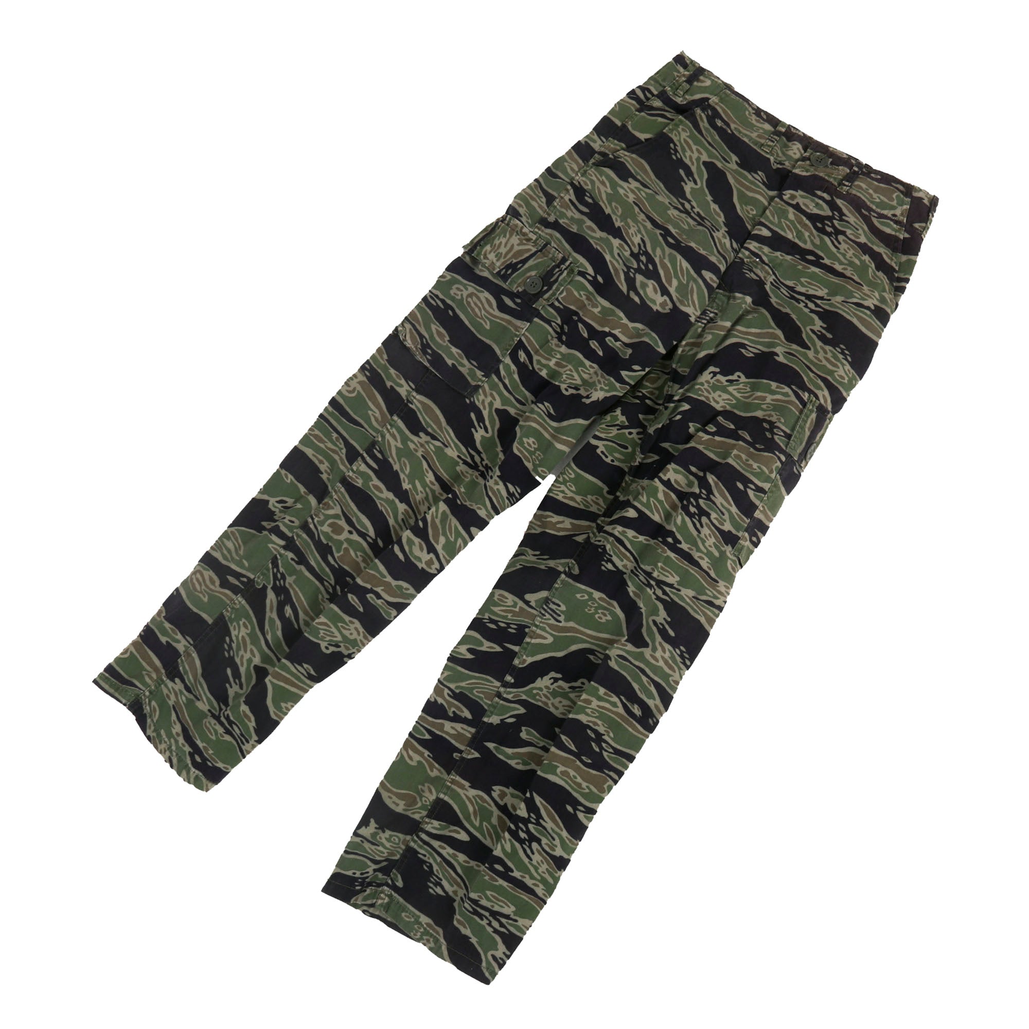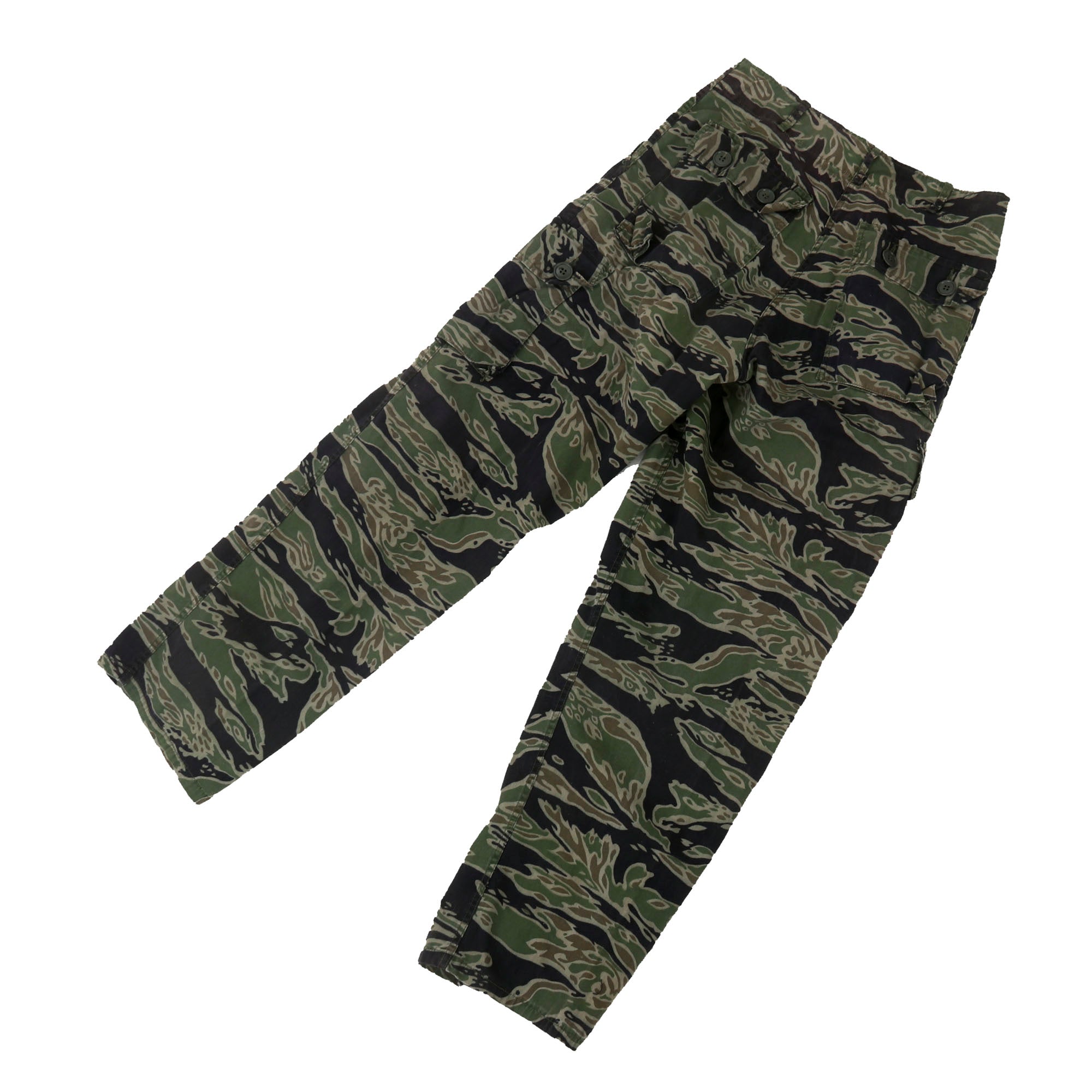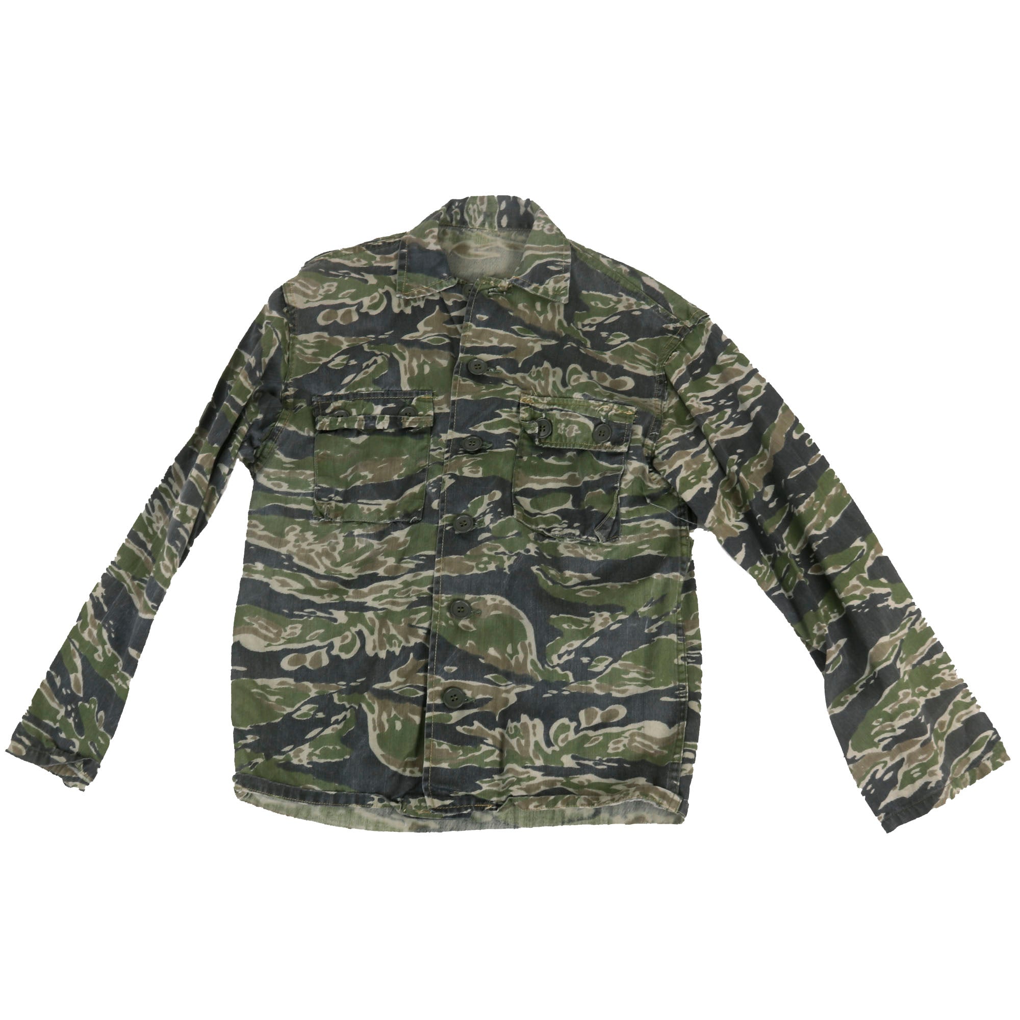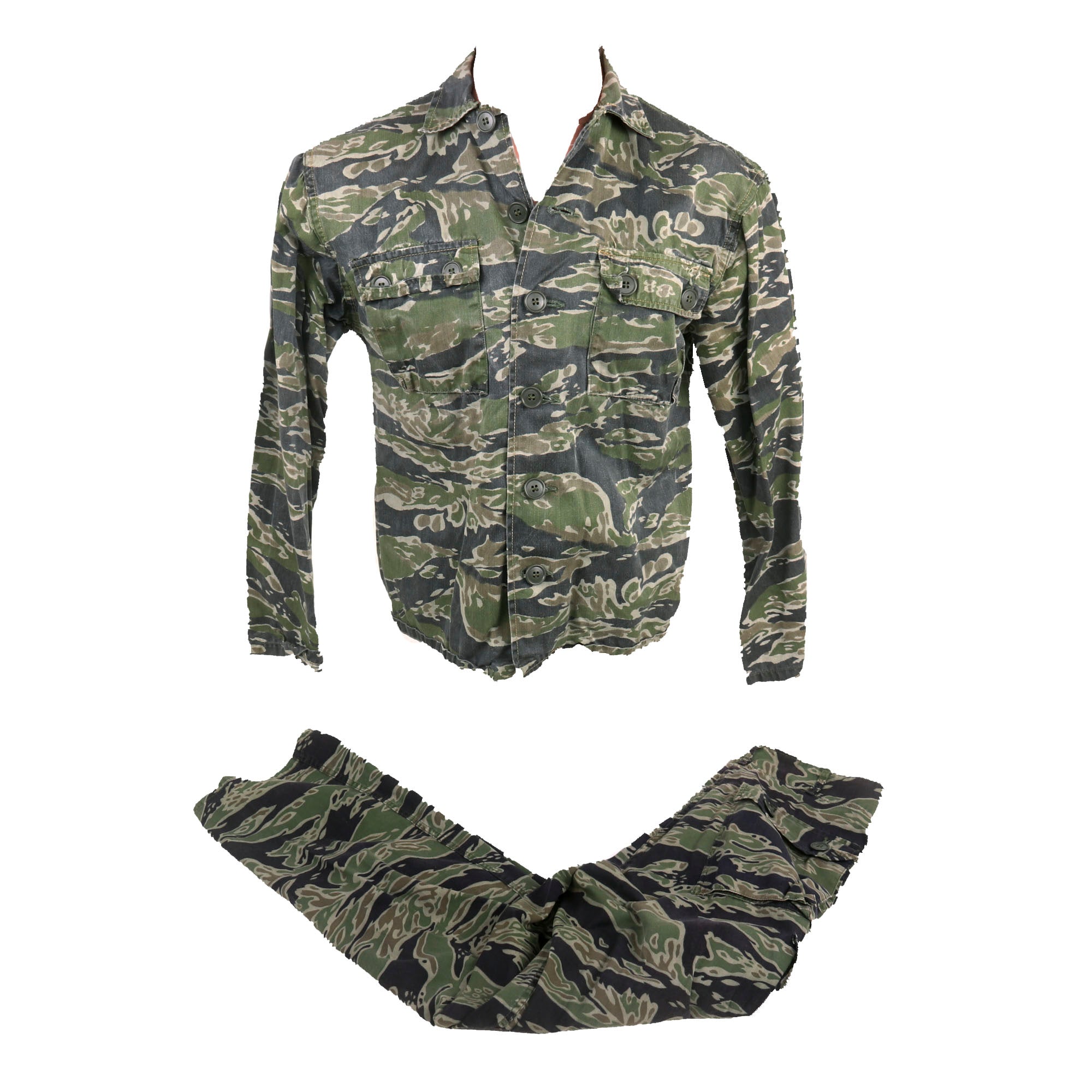 Original Items: Only One Set Available. This is an excellent example of a set of service used tiger stripe fatigues. They are in very good display condition, perfect for an “in the field” type of display! It is easy to understand how this pattern got its name from its bold black stripes, which mimic those of a tiger. The combination of green, brown and black stripes provided near perfect camouflage for a jungle environment with its light and shade. It was made using a screen-printing process, which is why it can sometimes appear smudged. The pattern was adapted from the black and green "Lizard pattern", used by the French during their war in Indochina.