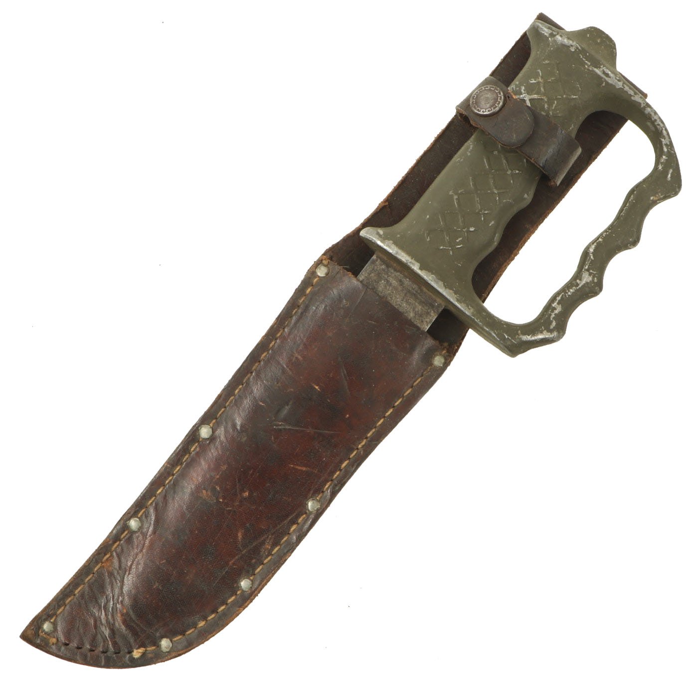 A wonderful example of a classic commonwealth fighting knife rarely encountered on today’s collector market, most likely issued to U.S. Forces. Check local legal restrictions on metal knuckles before ordering.