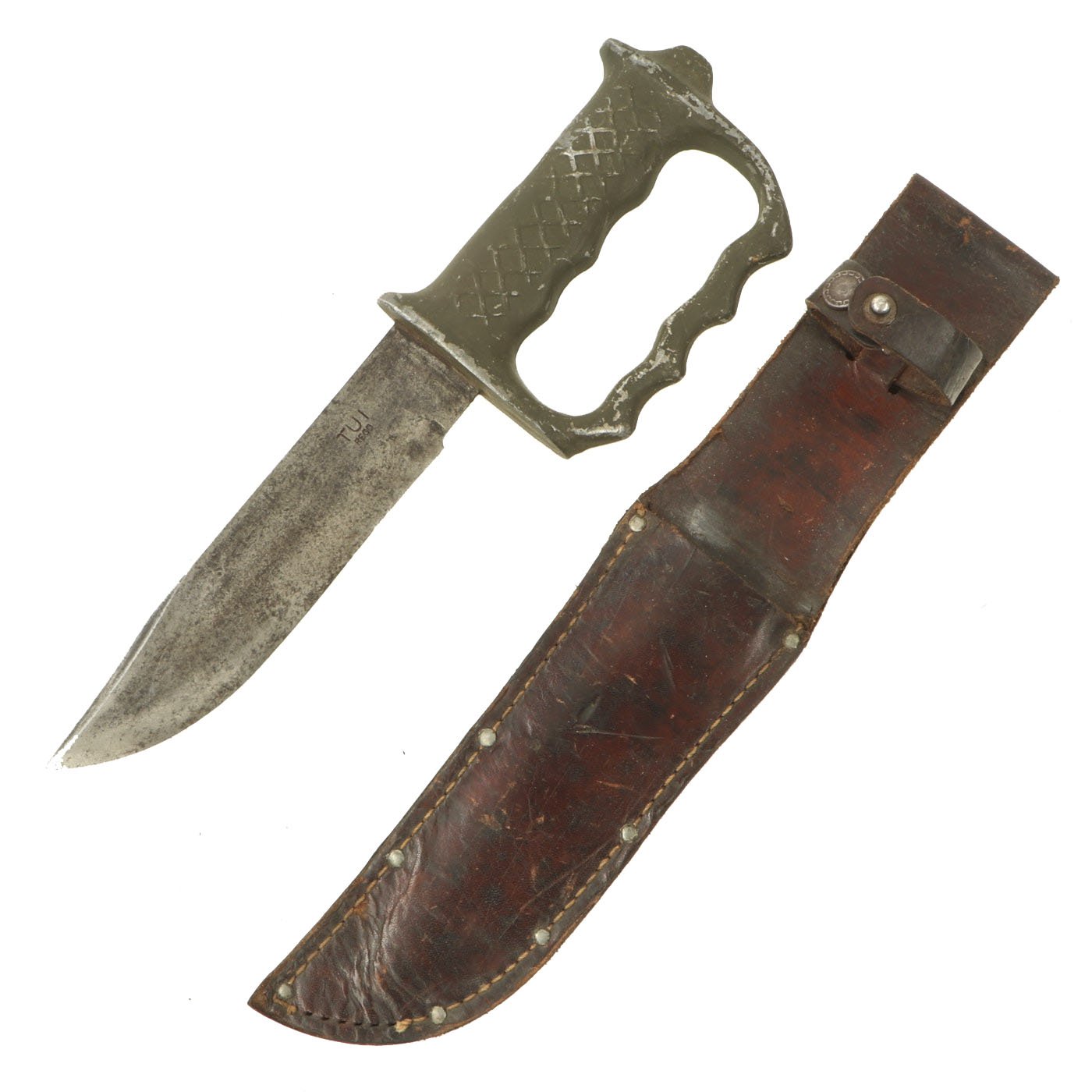 Original Item: Only One Available. A fantastic genuine WWII example of an Australian or New Zealand made commando aluminum handle fighting knuckle knife with original leather scabbard. This style knife is a hard to find rare version. A nearly identical knife is featured in the book FIGHTING KNIVES by Frederick Stephens on page 53 as well as on the front and back cover.